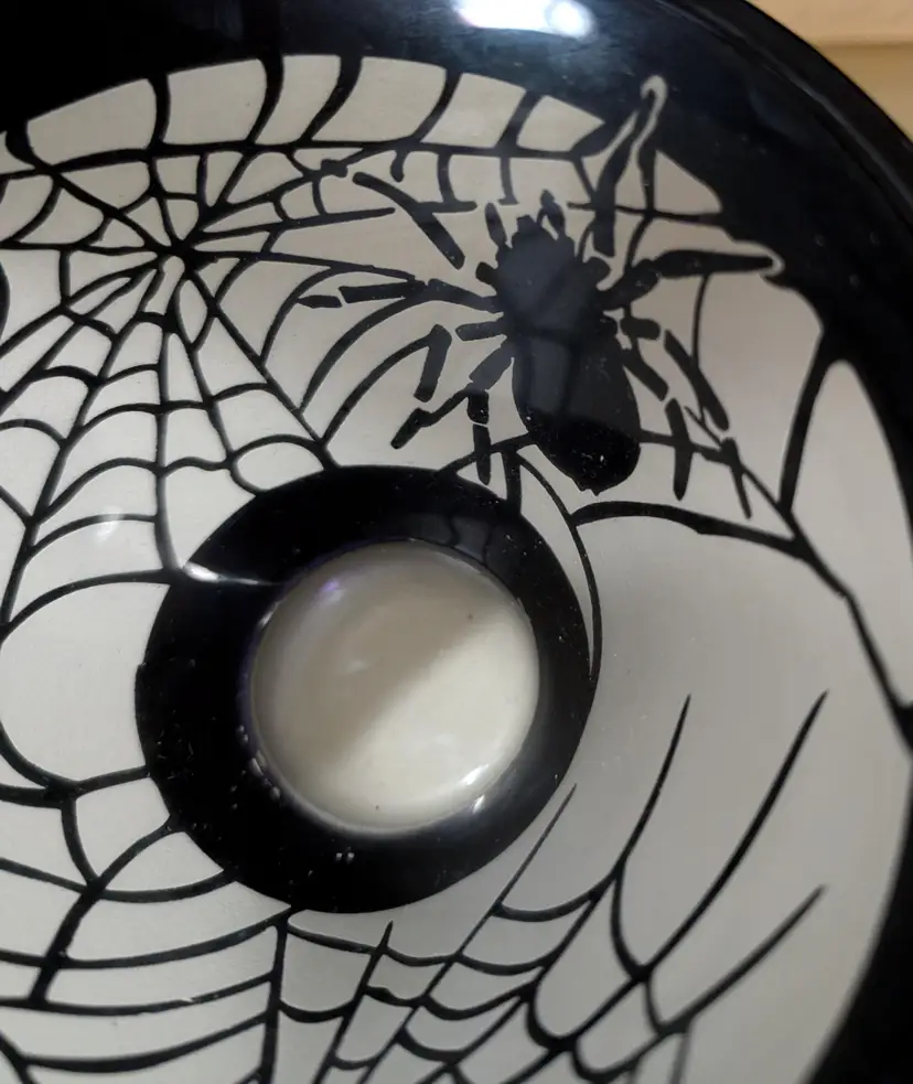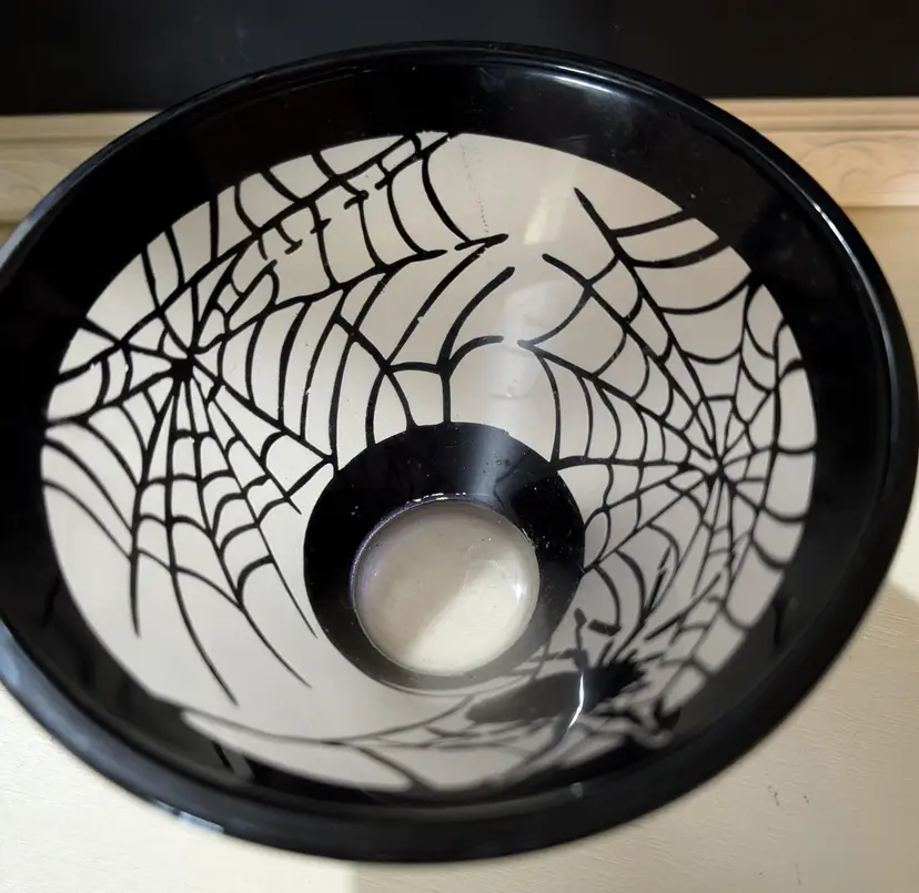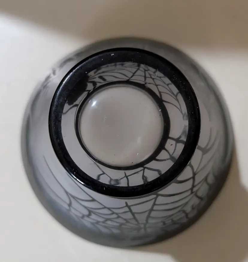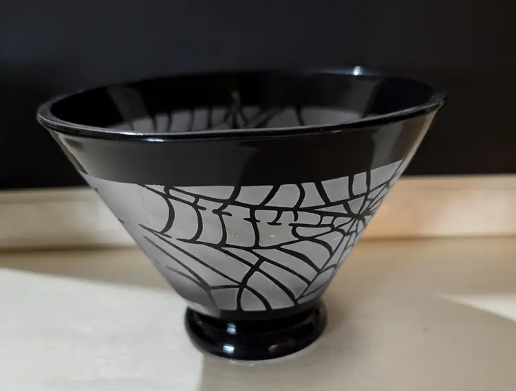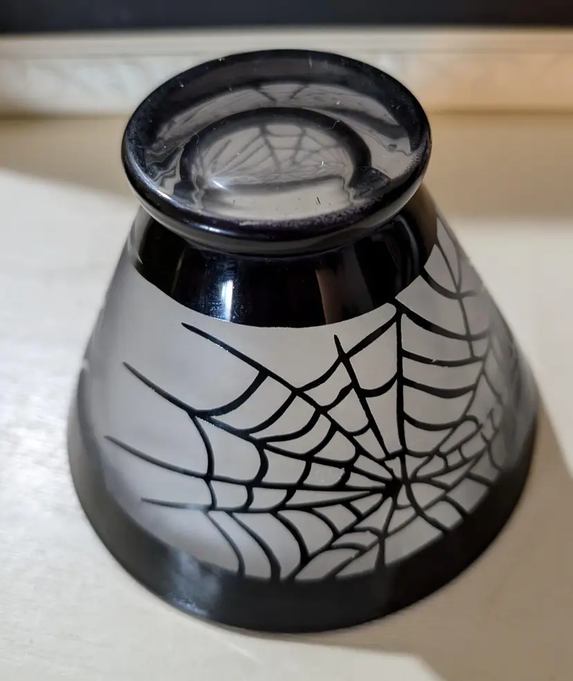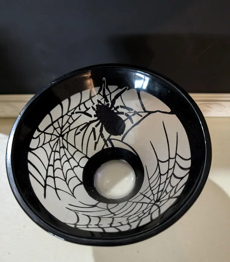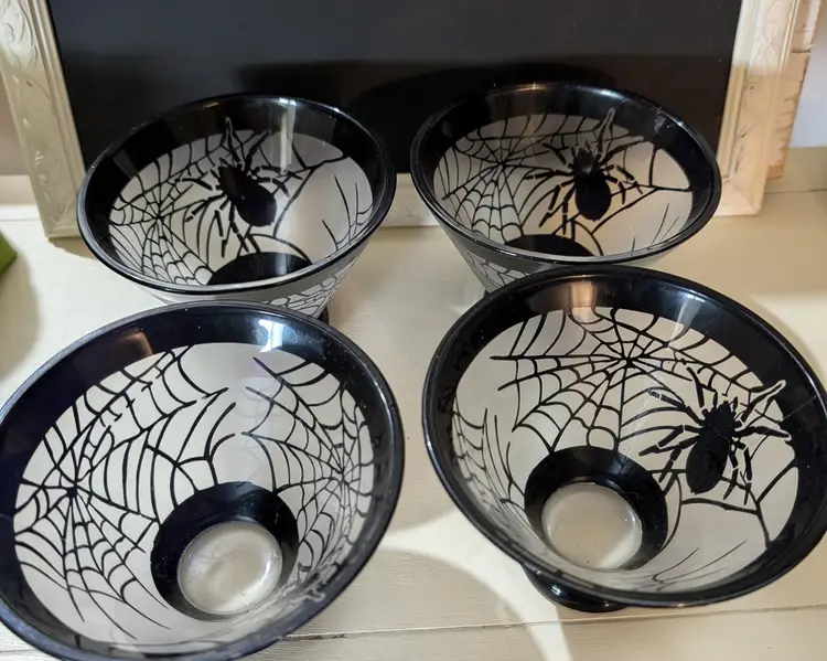 Spooky set of 4 vintage clear and frosted glass bowls featuring a striking spider web and spider transfer design. These bowls are in excellent condition with no cracks or chips, making them perfect for your Halloween decor or themed parties. Each bowl measures approximately 5 inches in diameter and 4 inches tall. Add a touch of eerie charm to your gatherings with these unique pieces. These are HAND WASH only.
