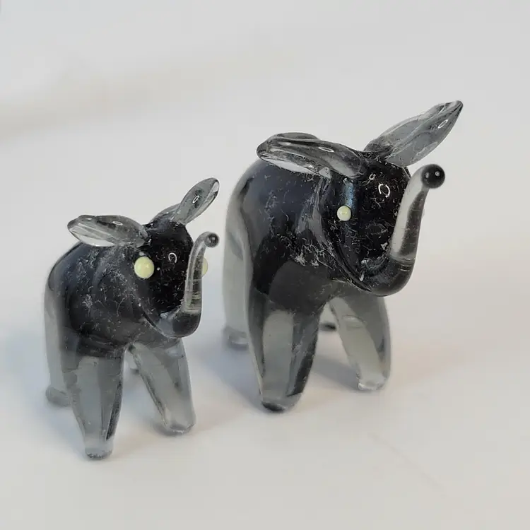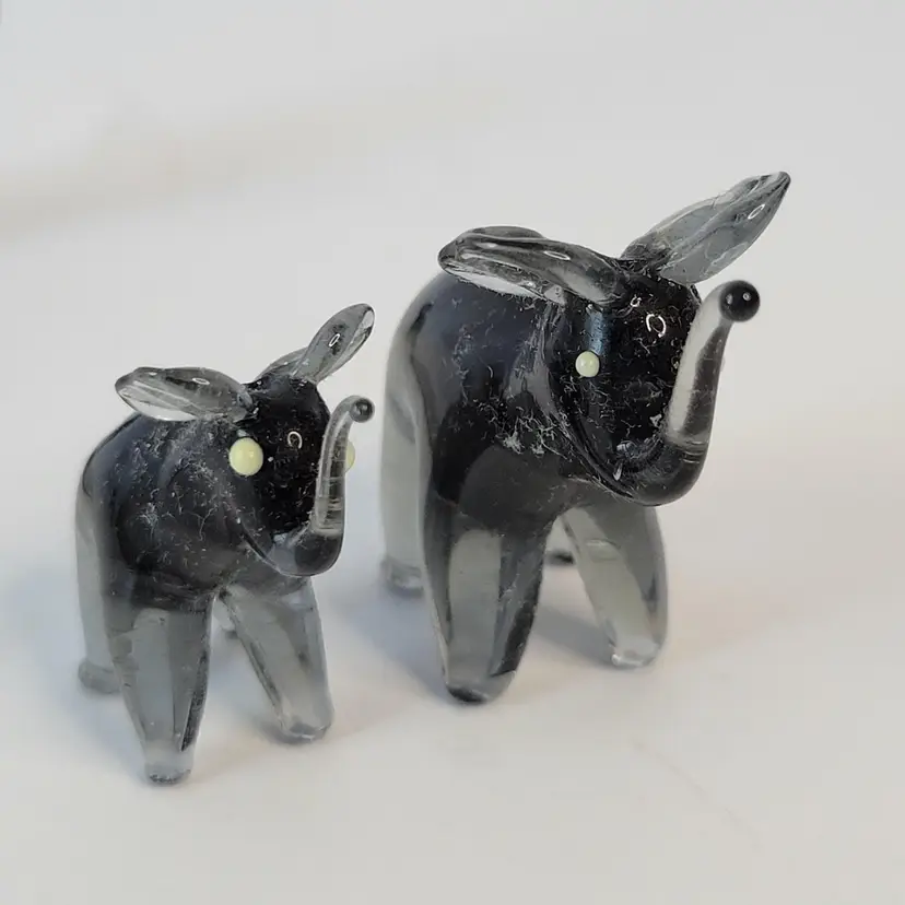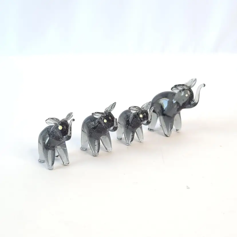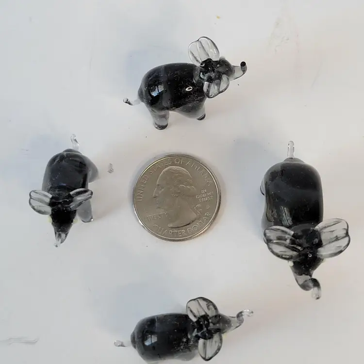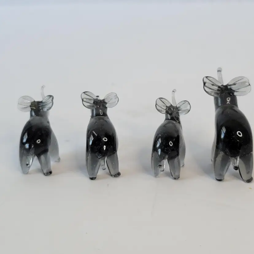Excellent pre-owned condition glass elephants Set of 4 Miniature size Hand blown black glass Mother and children Mother measures approximately 1.75" long x 1.5" tall Children measure approximately 1.5" long x 1" tall No chips, cracks or missing parts