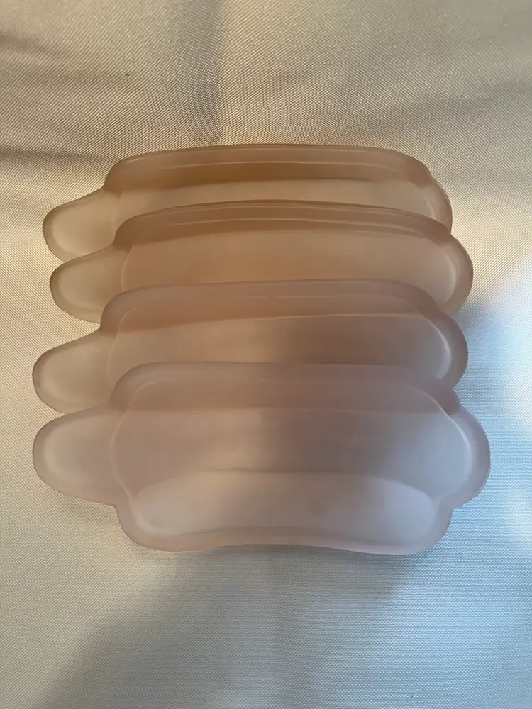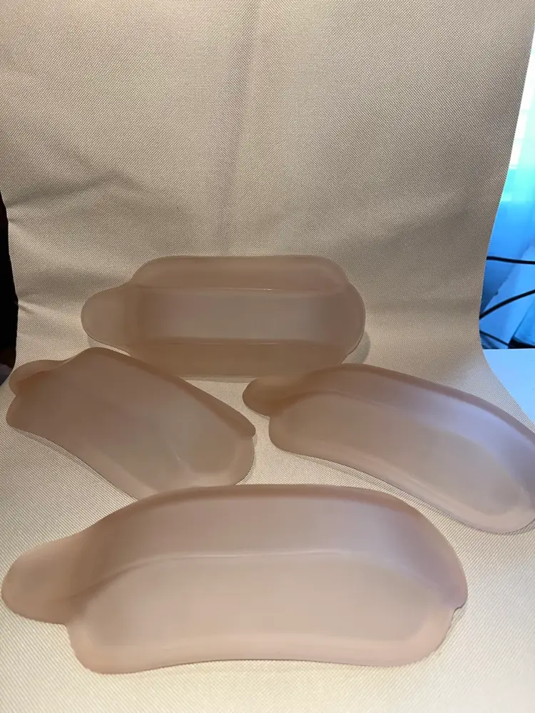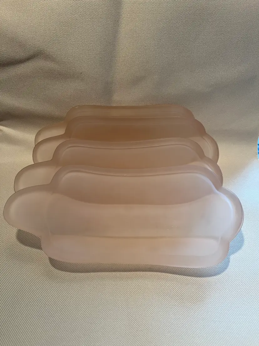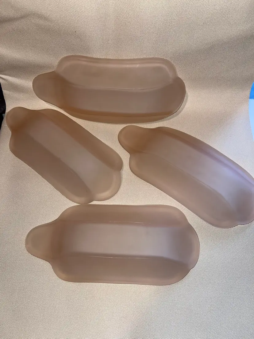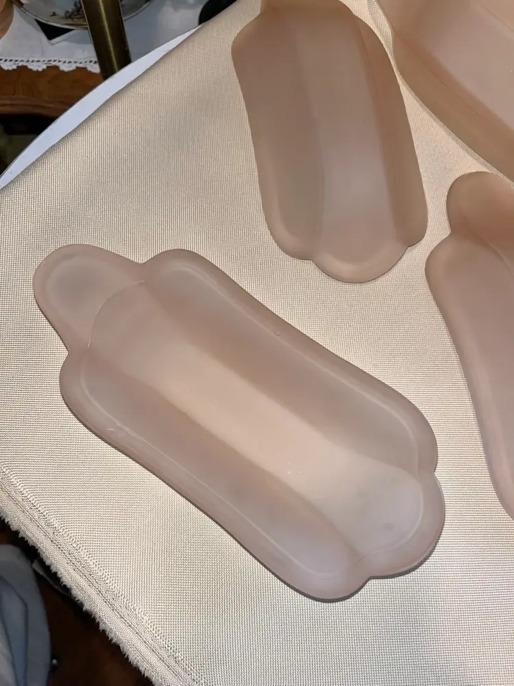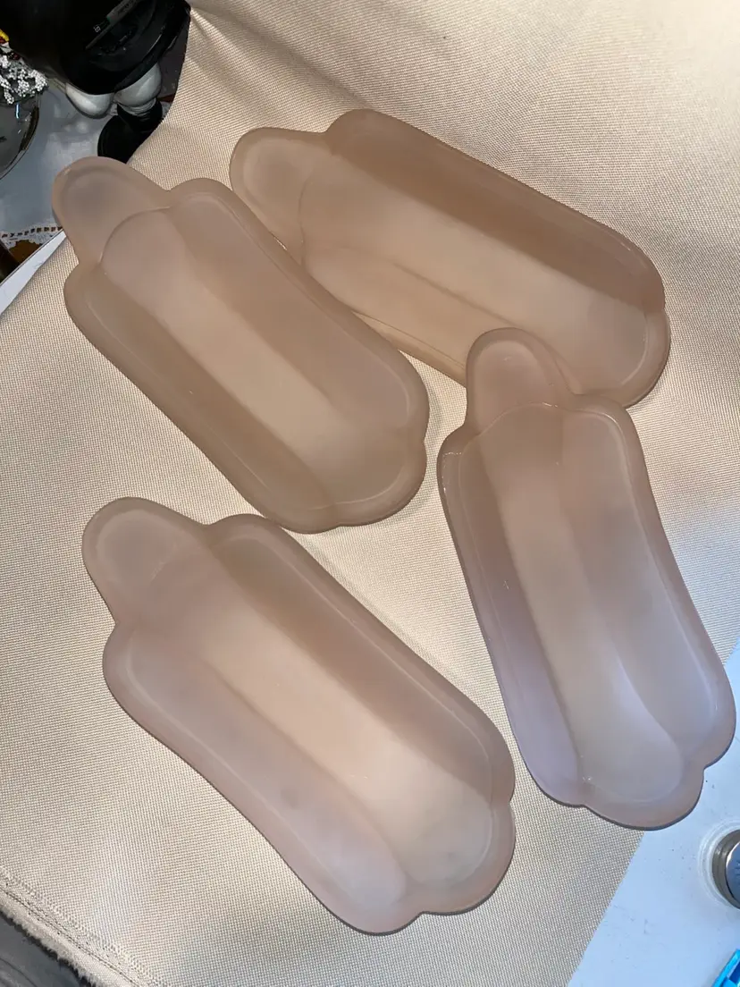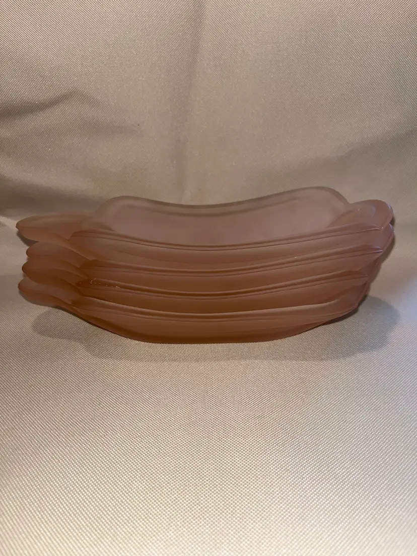Sweet vintage Indiana pink satin glass banana split dishes in excellent condition no chips or cracks. Set of 4 each measuring 9” long 4” wide