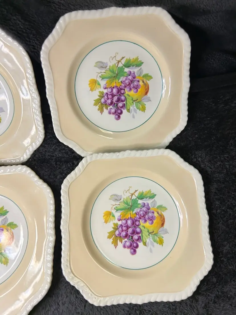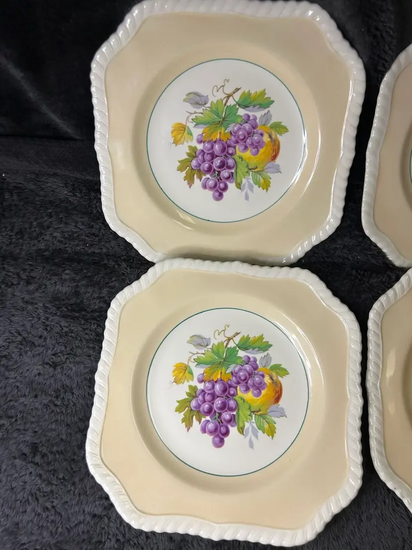 Vintage Johnson Brothers Old English square plates "California" series, produced in England, features a fruit design, grapes, pears, apple, with rope edge embellishment, suitable for salad, dessert or display. Likely produced between 1930 and 1970's.