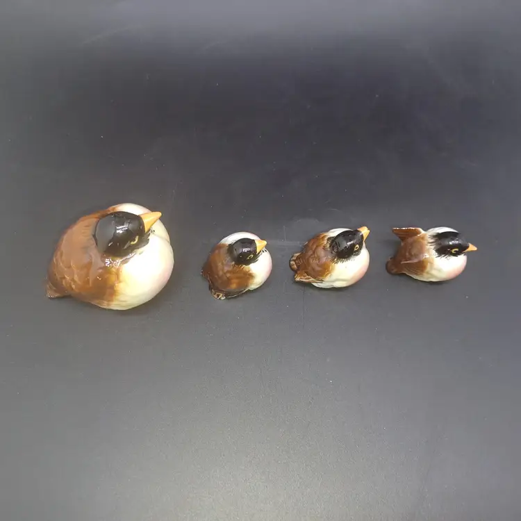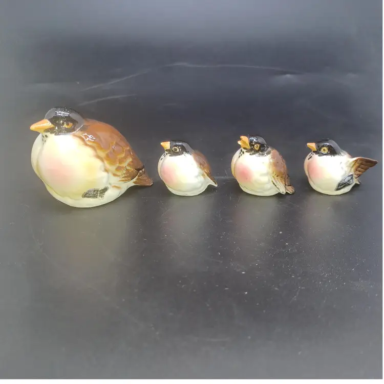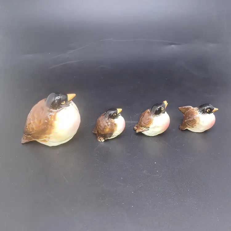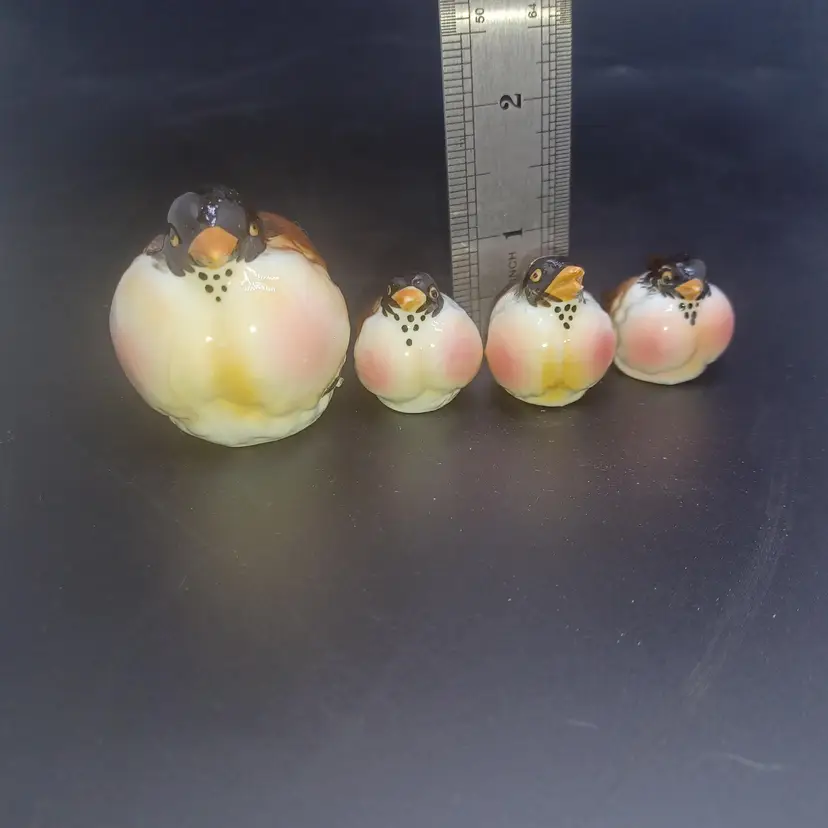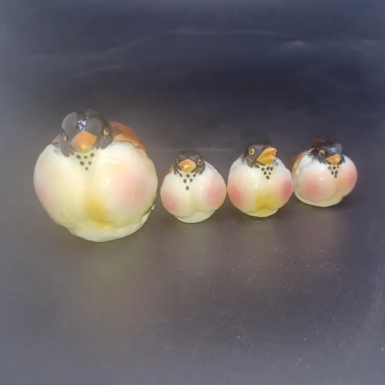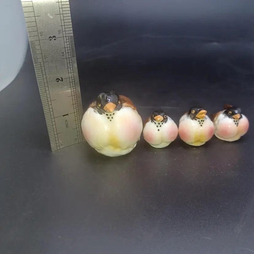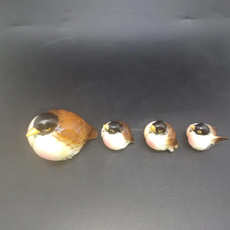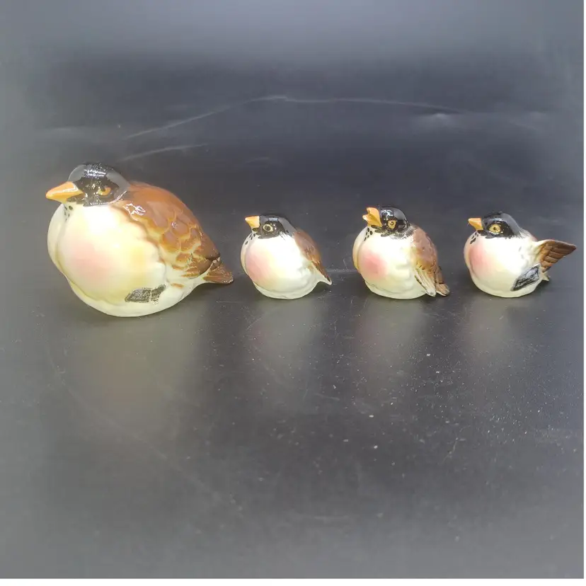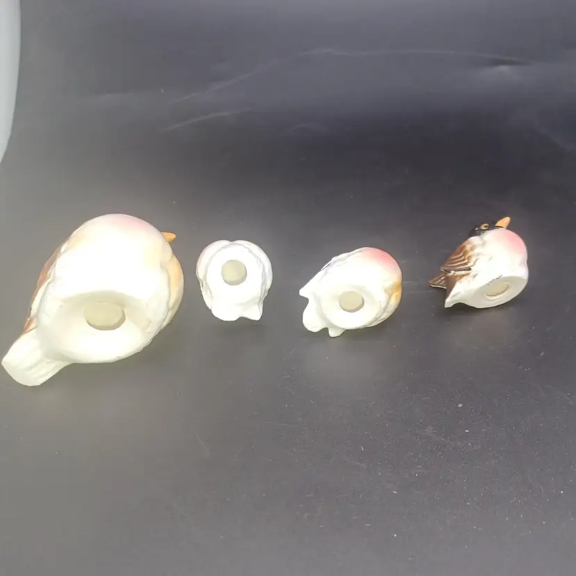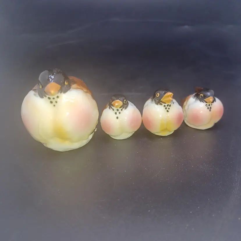 Set of 4 Vintage Kelvin Bone China Robin Birds Miniature Figurines Japan Largest measures approximately 2 in small birds measure approximately 1 in good vintage condition with no chips or cracks a few of the Tails do have a rough Edge but nothing to deters from display or use Two of them have original black and gold foil stickers Kelvin Bone China Japan please see all pictures as they're the best description