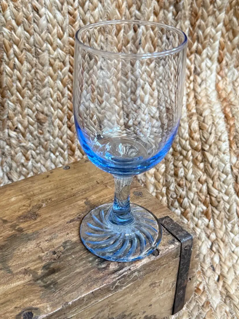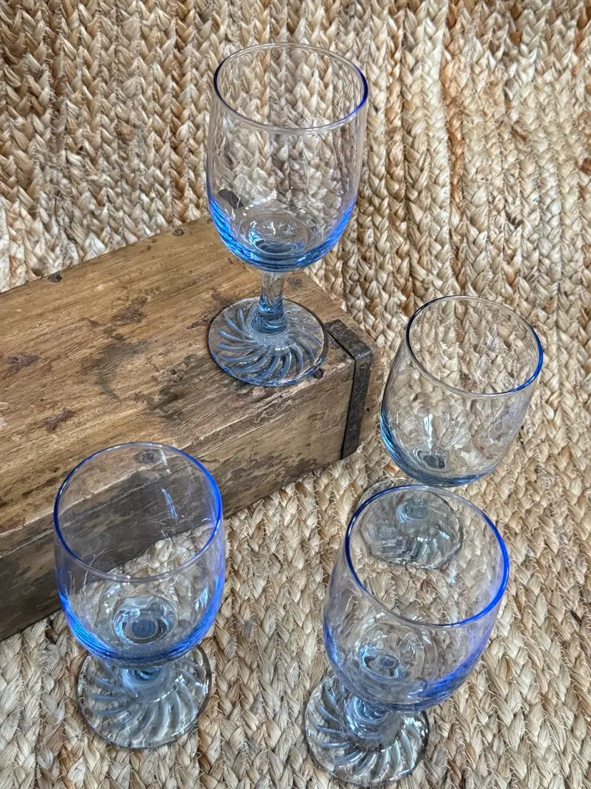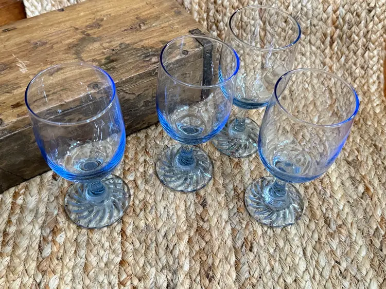 Details: • Maker: Libbey Glass • Pattern: Swirl Foot Stemware • Color: Clear with blue tint • Size: Approx. 6” tall x 2.75” diameter • Capacity: ~8 oz • Quantity: Set of 4 • Condition: Excellent vintage condition – no chips or cracks; very light wear from age and use.