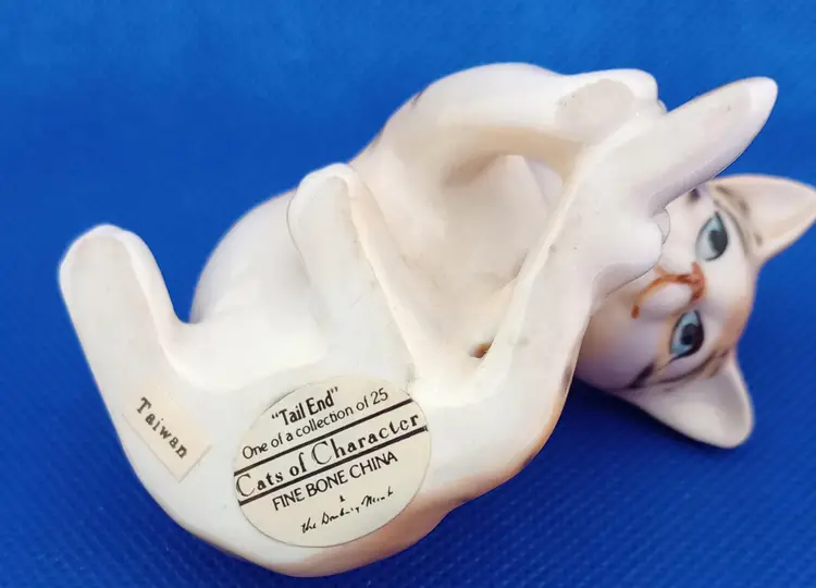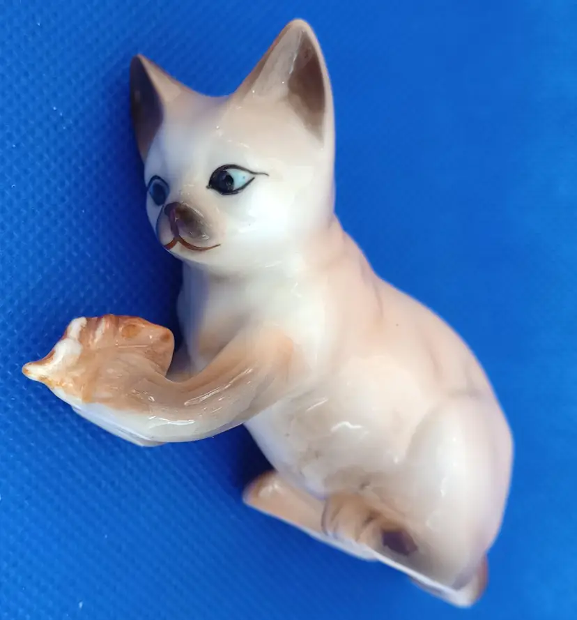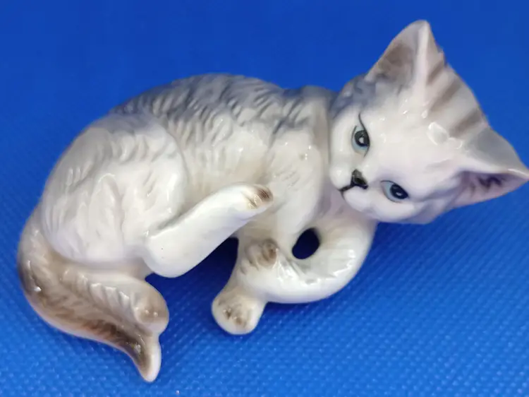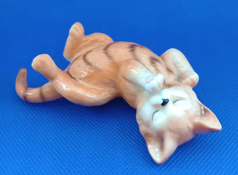 Adorable set of 4 vintage porcelain cat figurines, each capturing playful feline poses. Perfect for cat lovers and collectors, these charming pieces add a touch of whimsy to any space. Each figurine is uniquely detailed and measures approximately 3 inches long.