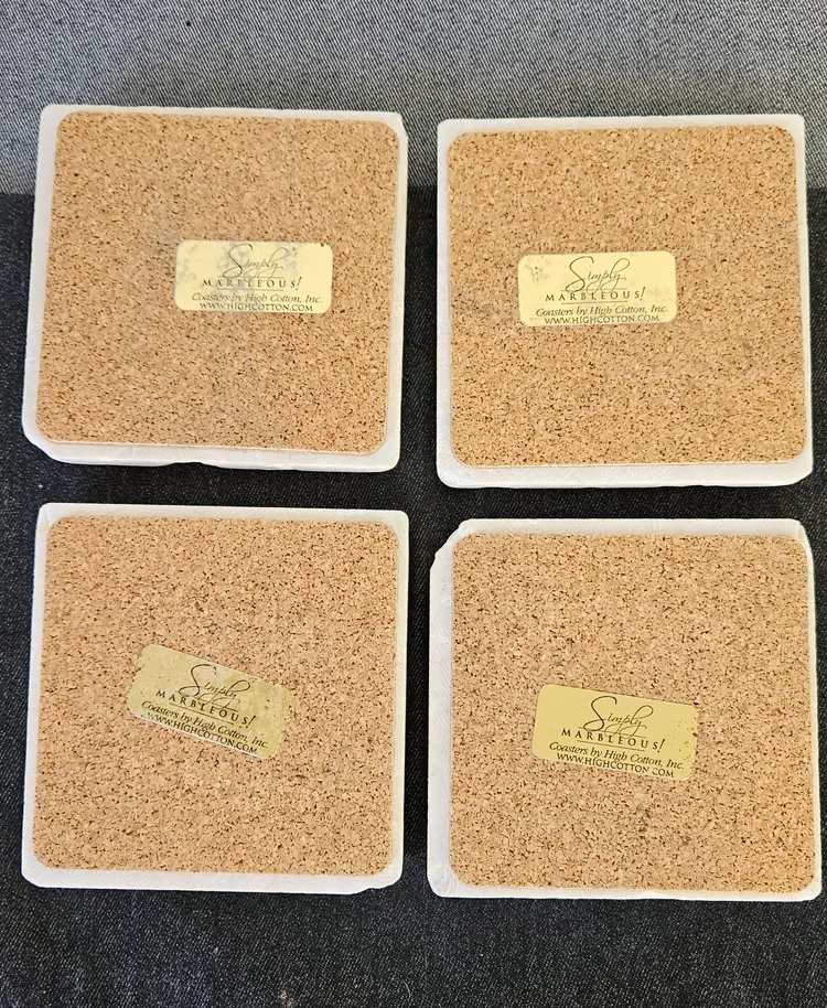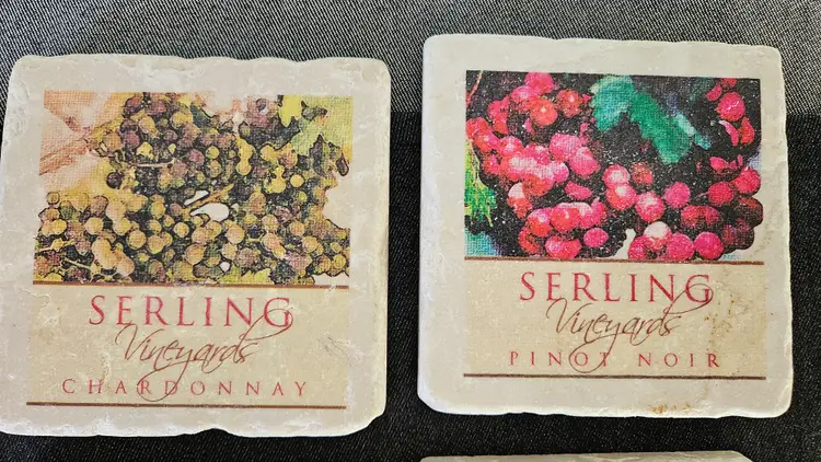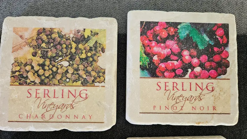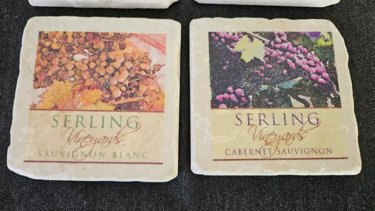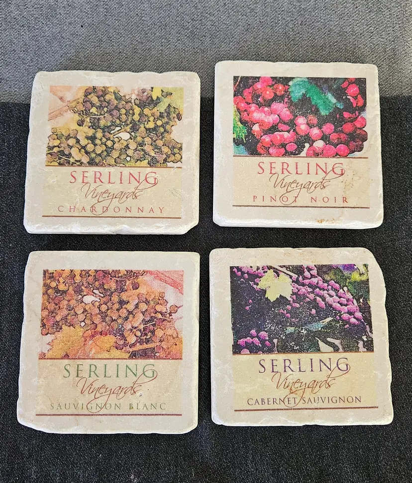 Set of 4 vintage marble coasters featuring grape varietals and branded Serling Vinyards. Heavy, nice stone construction. Cork on back to prevent slippage. Brand is Simply Marbleous! by High Cotton, Inc. Includes one of each grape: Cabernet Sauvignon, Pinot Noir, Chardonnay, Sauvignon Blanc.