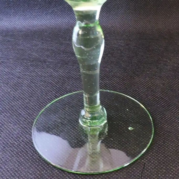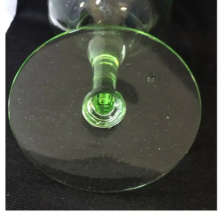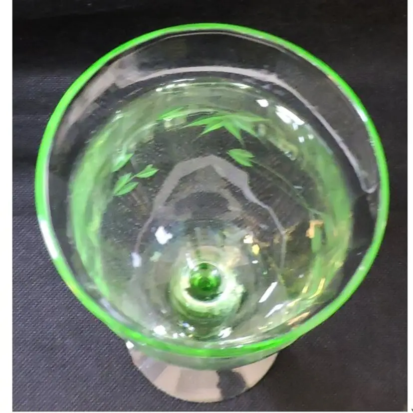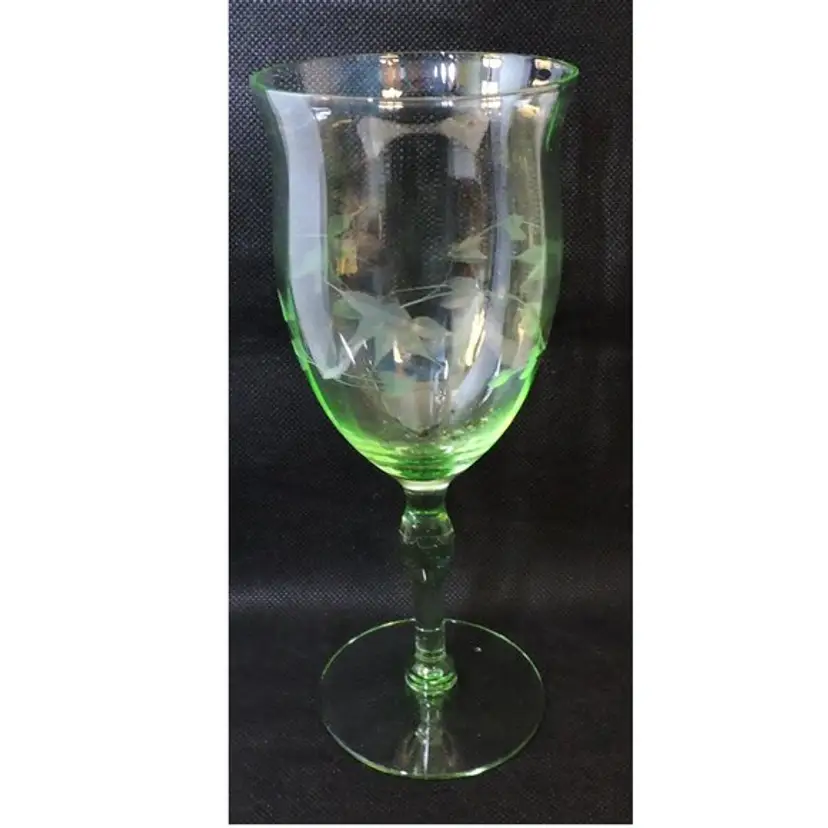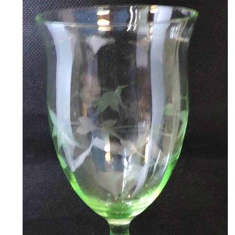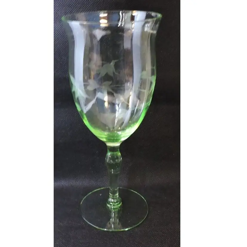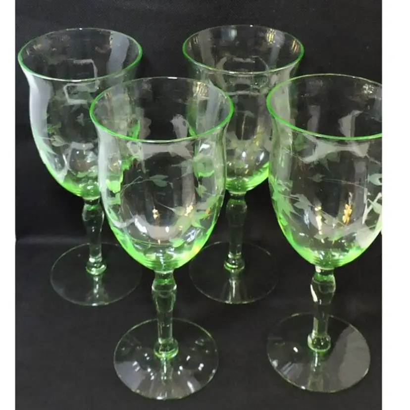 This is a set of 4 stemmed wine glasses by Tiffin Elinar. They are beautifully etched with green flowers and leaves. They contain uranium and will glow under UV light.