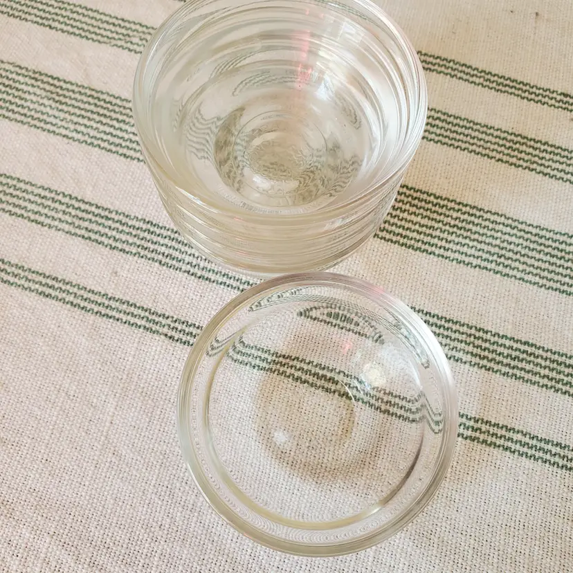 Use these Arcoroc France glass salt cellars for their original use, or my preference is to use them to combine spices while cooking, or gather beads or tiny objects while crafting. 1" tall. 2 1/4" diameter.