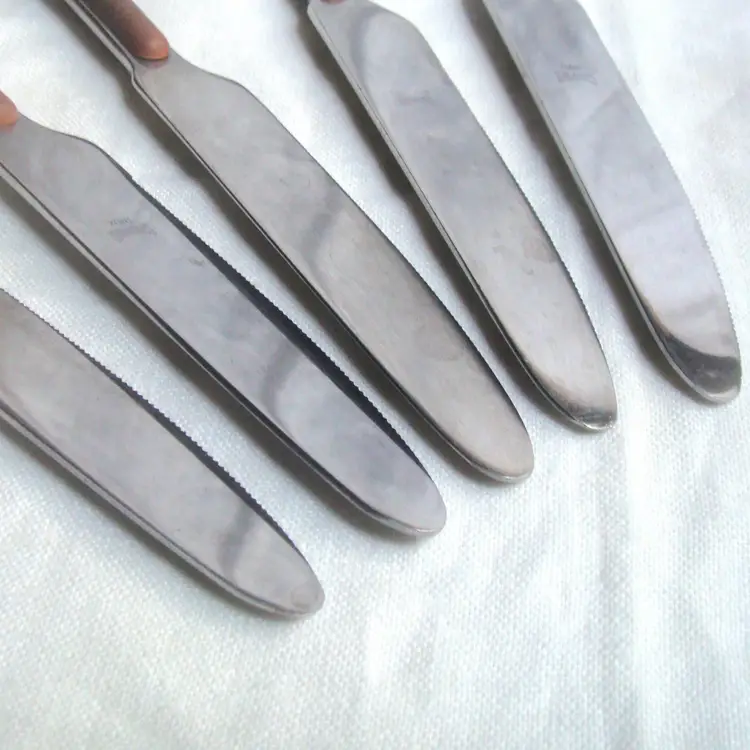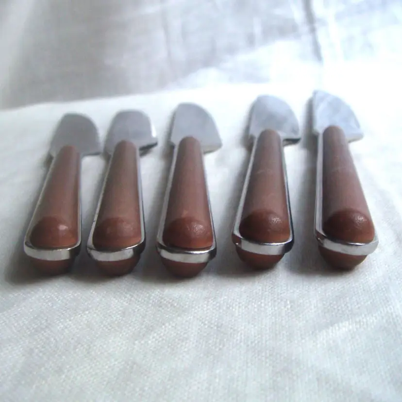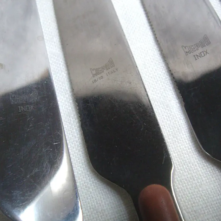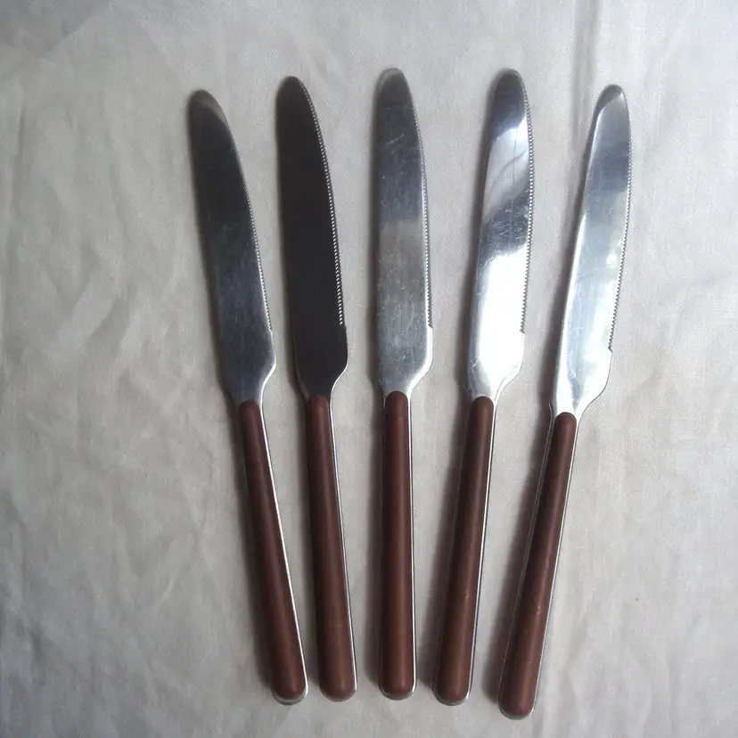 Mepra dinner knife, 5 pieces. Believe this color is called Tobacco. Style: Contemporary Very nice condition, good color.