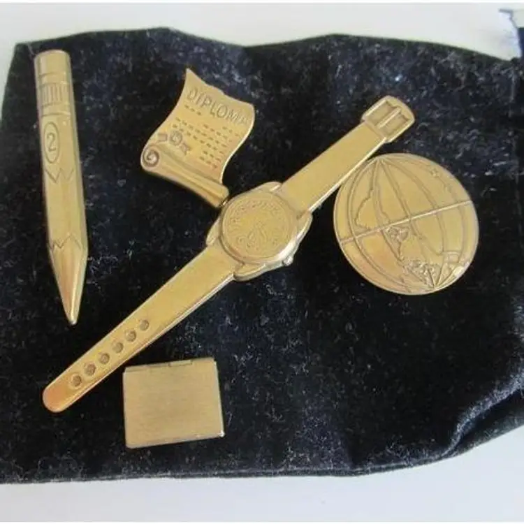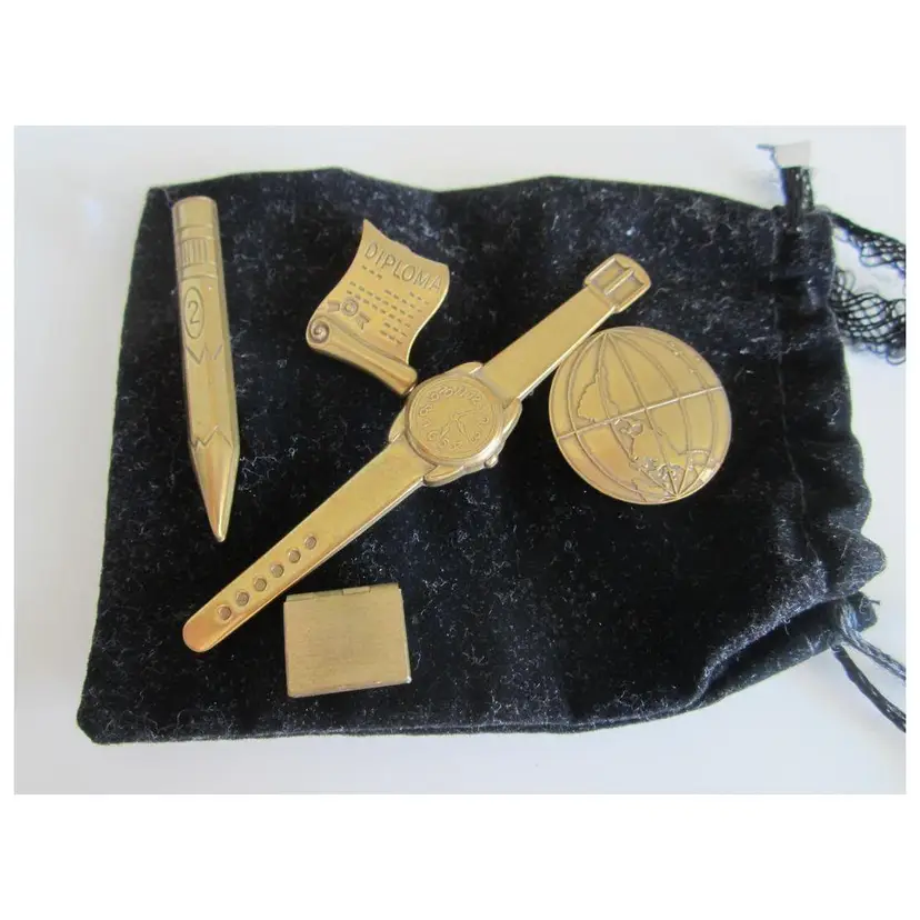 Set of 5 vintage education themed brass pins - globe, watch, book that opens, diploma and pencil.