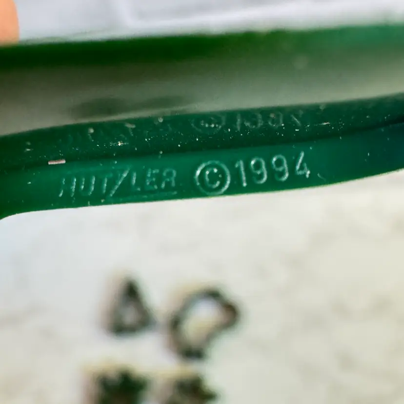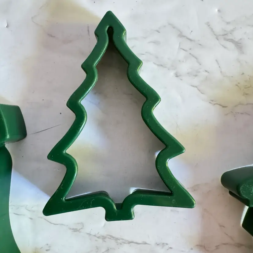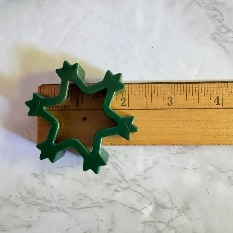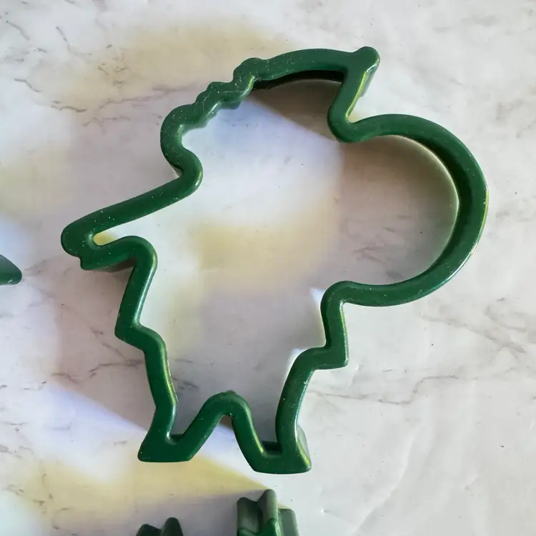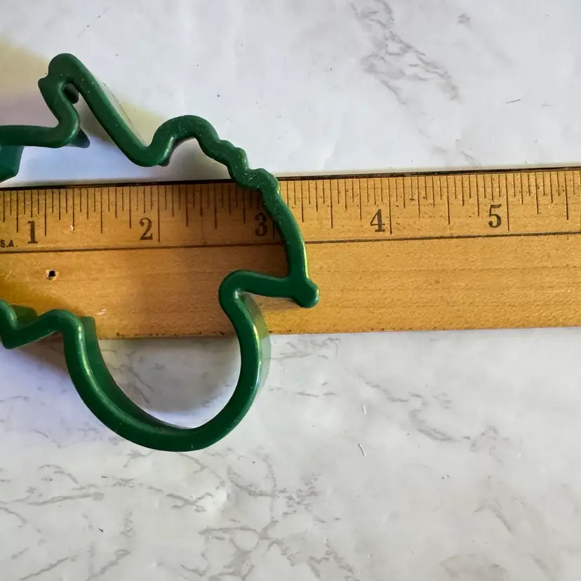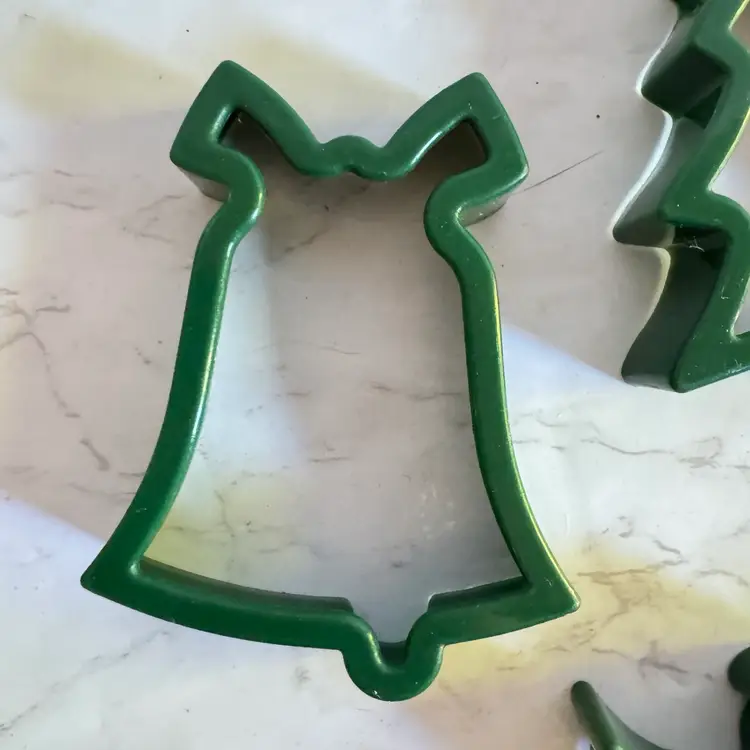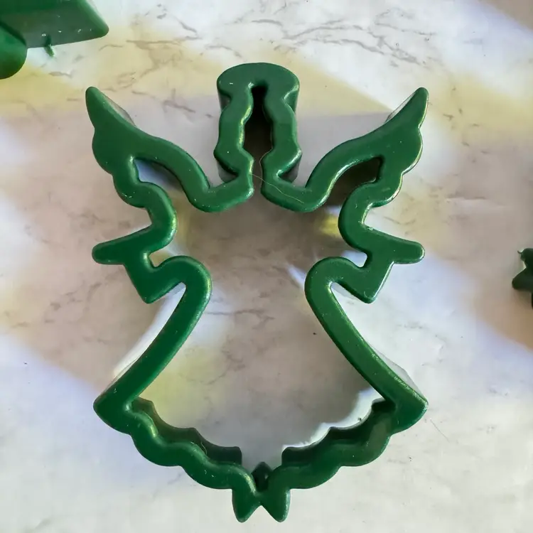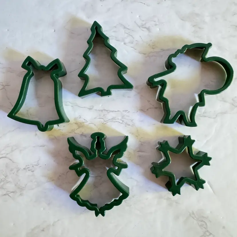 This product is a set of 5 vintage 1994 Hutzler green plastic Christmas cookie cutters featuring Santa, bell, and angel designs. These cookie cutters are perfect for adding a festive touch to your Christmas baking, with a retro feel that adds charm to your holiday decor. Made of durable plastic, these vintage cutters are a unique addition to any collection of baking accessories. Excellent vintage condition. Measure about 2” to over 3”.