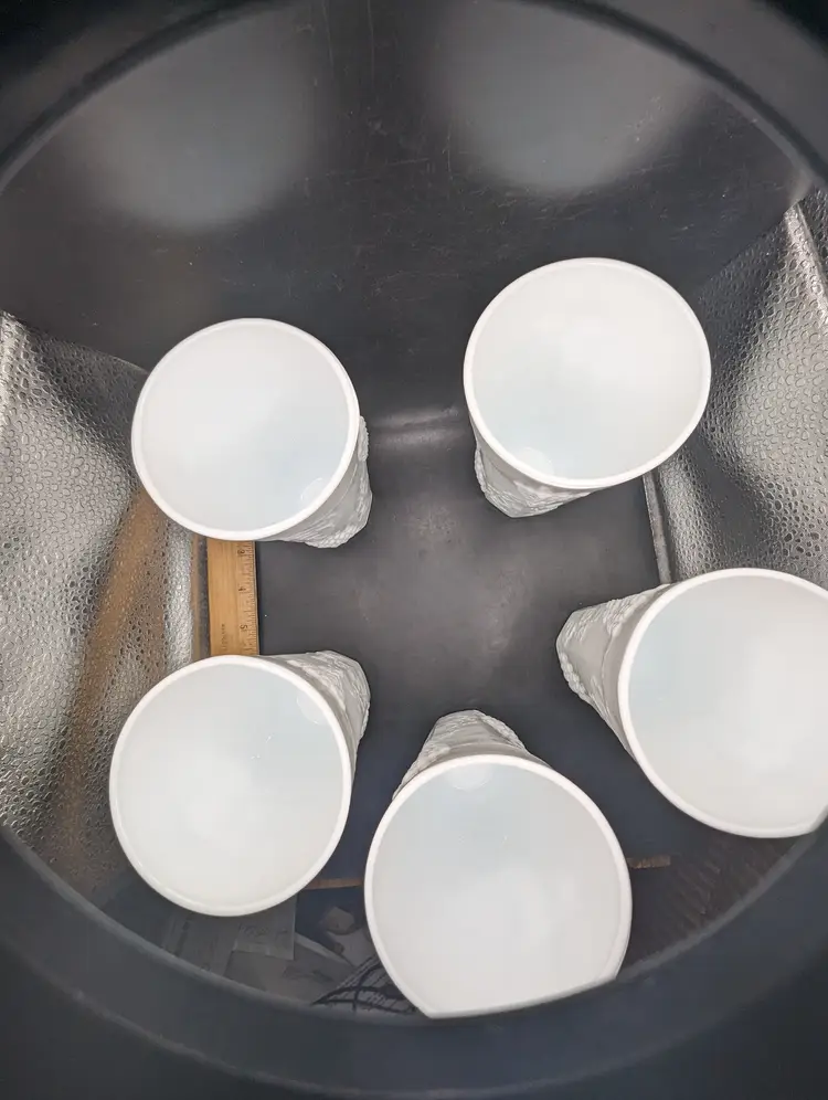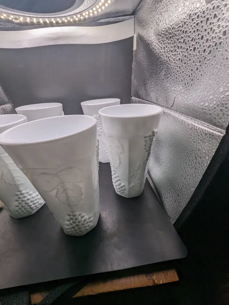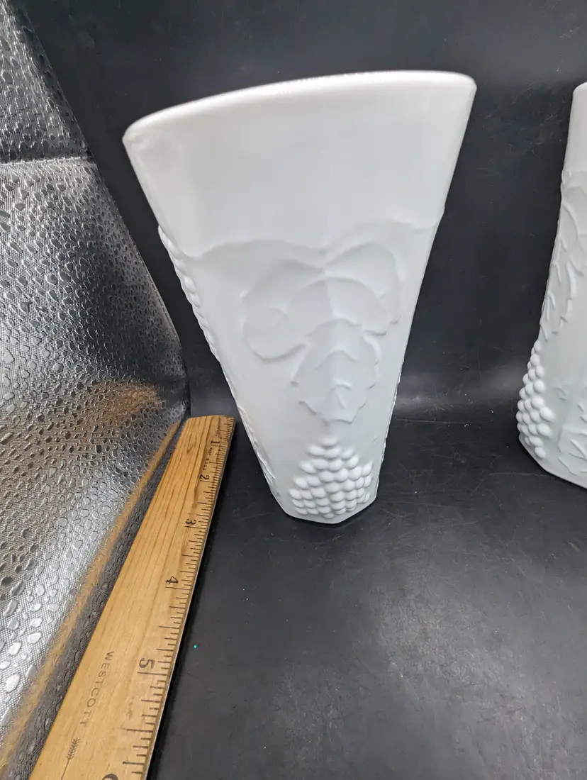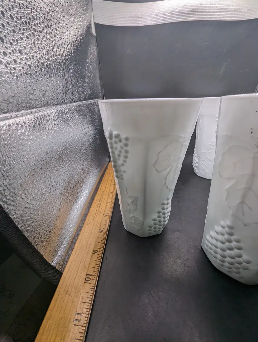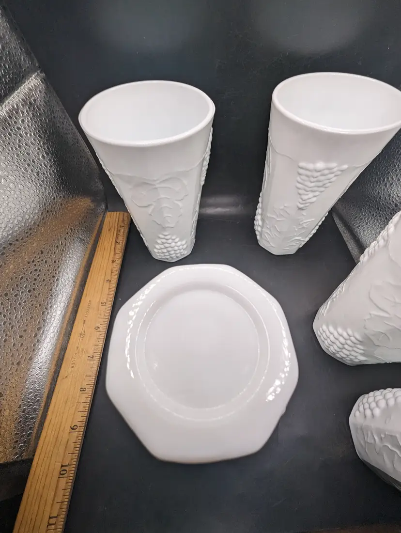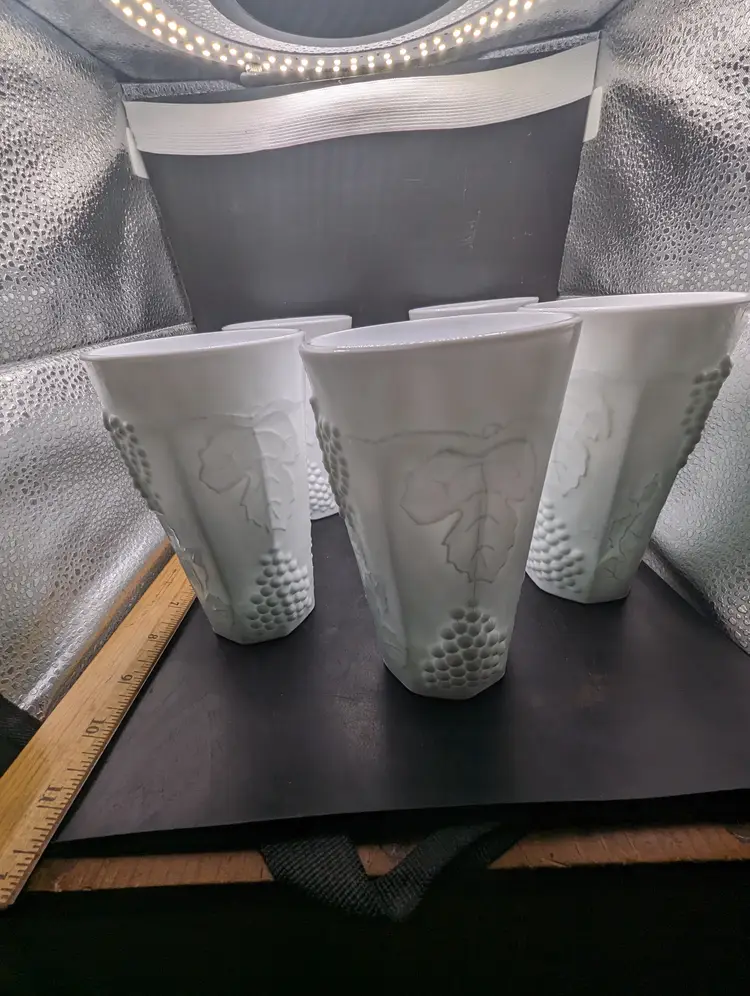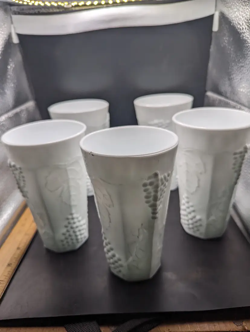This is a lovely Set Of 5 Vintage White 6” Milk Glass Tumblers Beautiful Harvest Grape Pattern. No chips or cracks. Please see all pictures for condition and measurements.