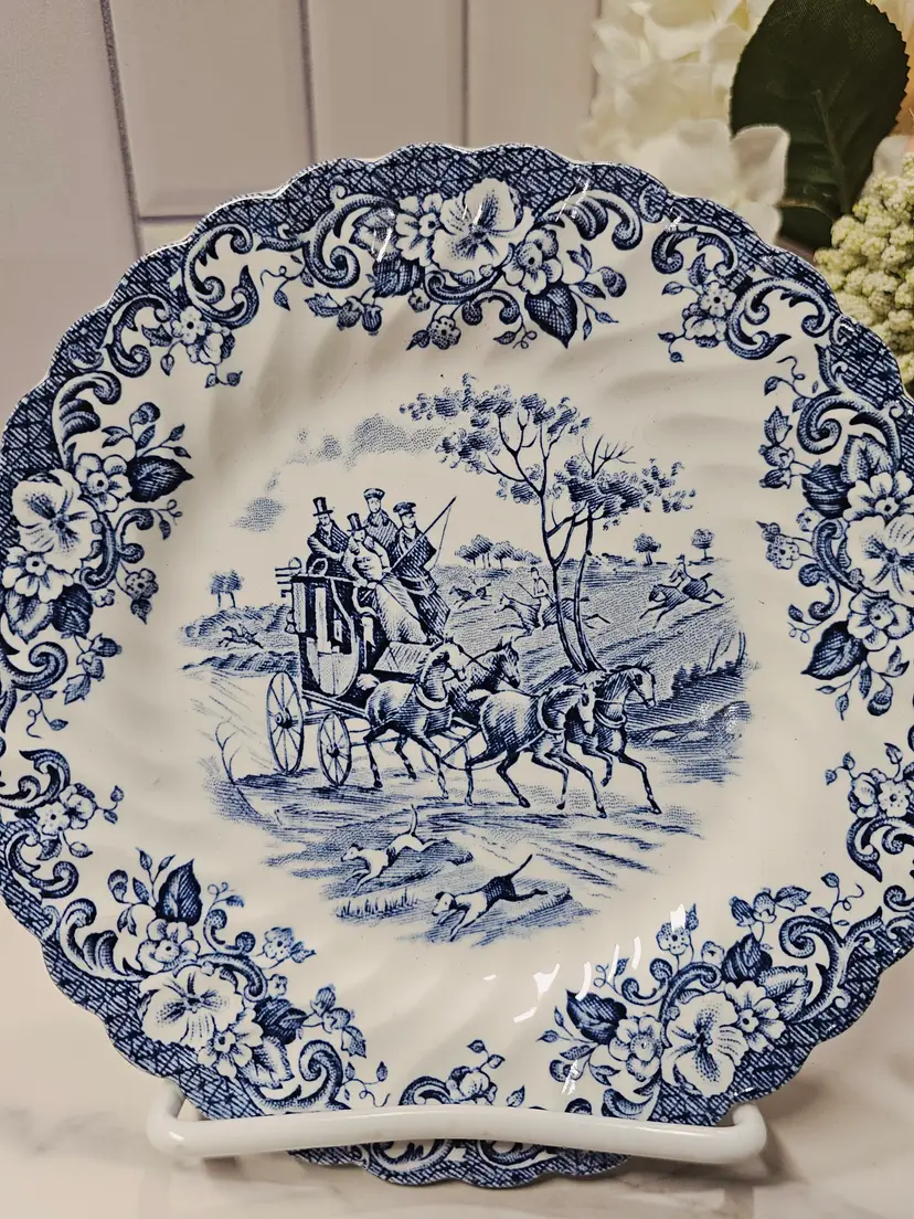 This set of six bread & butter plates from Johnson Brothers’ Coaching Scenes Blue collection features a beautifully detailed transferware design of a horse-drawn carriage traveling through the English countryside. Each plate is framed by an ornate floral border and scalloped edge, rendered in rich cobalt blue on white ironstone. Perfect for serving small bites, desserts, or as display pieces, these plates bring historical charm and storytelling to your table. Crafted in England, the Coaching Scenes pattern is beloved for its nostalgic imagery and durable craftsmanship — ideal for collectors or those curating a vintage-inspired dining experience.