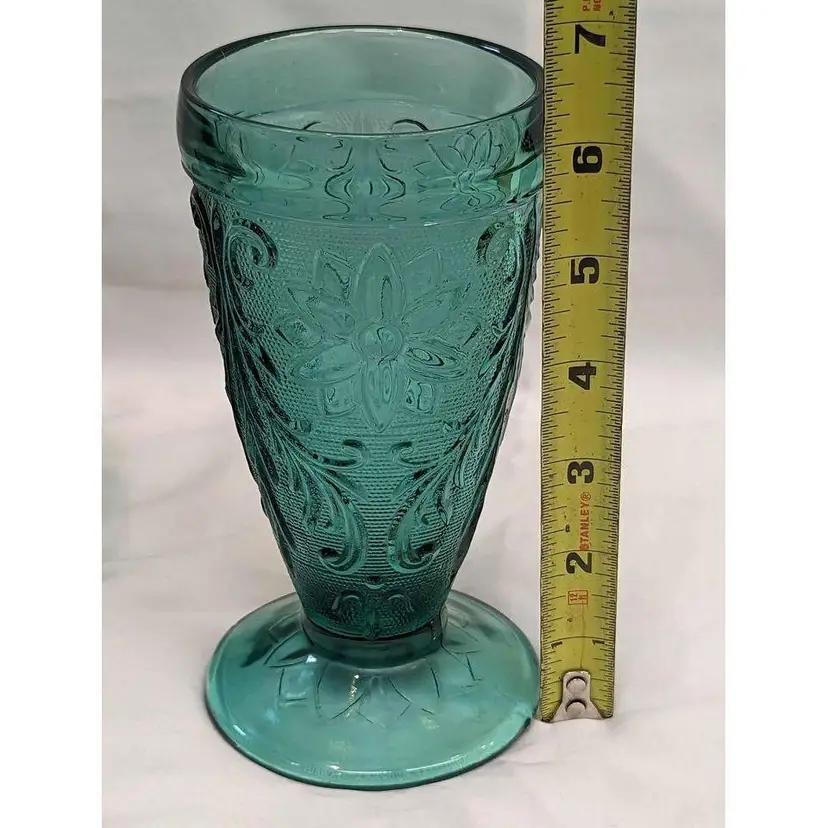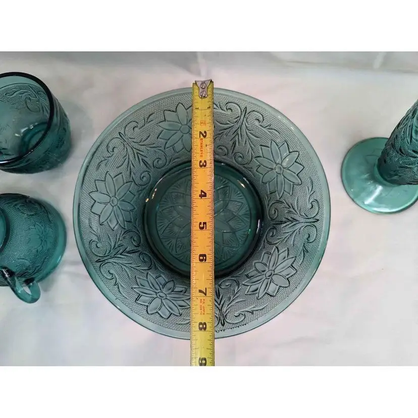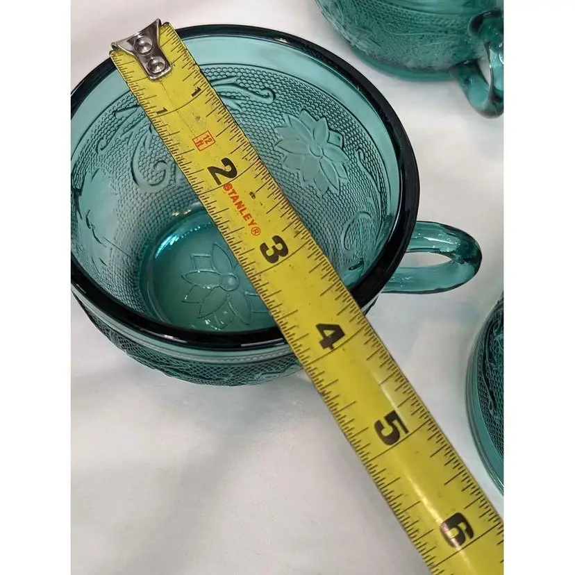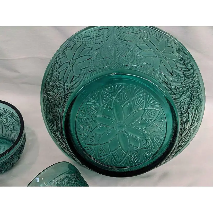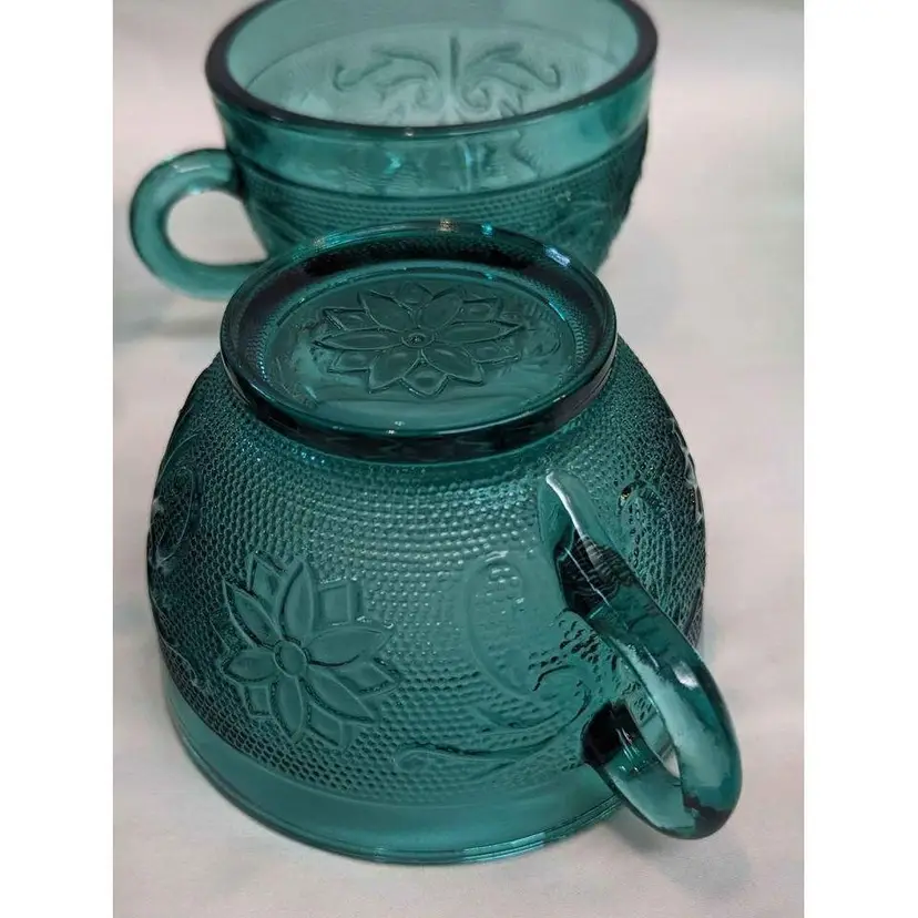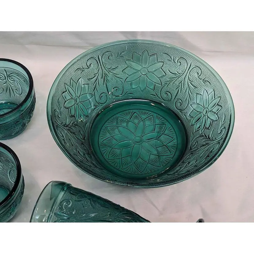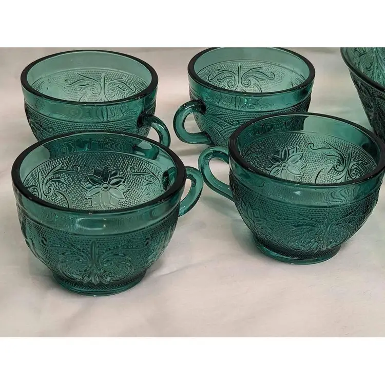 Set of 6 Indiana Tiara exclusive spruce green glass bowl, cups and footed glass. This various 6 piece set is immaculate and includes a bowl, 4 coffee mug cups and 1 tall footed glass. This pattern is beautiful and the spruce green color is gorgeous! This is a great start to a new set or can be additions to an existing collection. All pieces are in excellent condition with no imperfections.