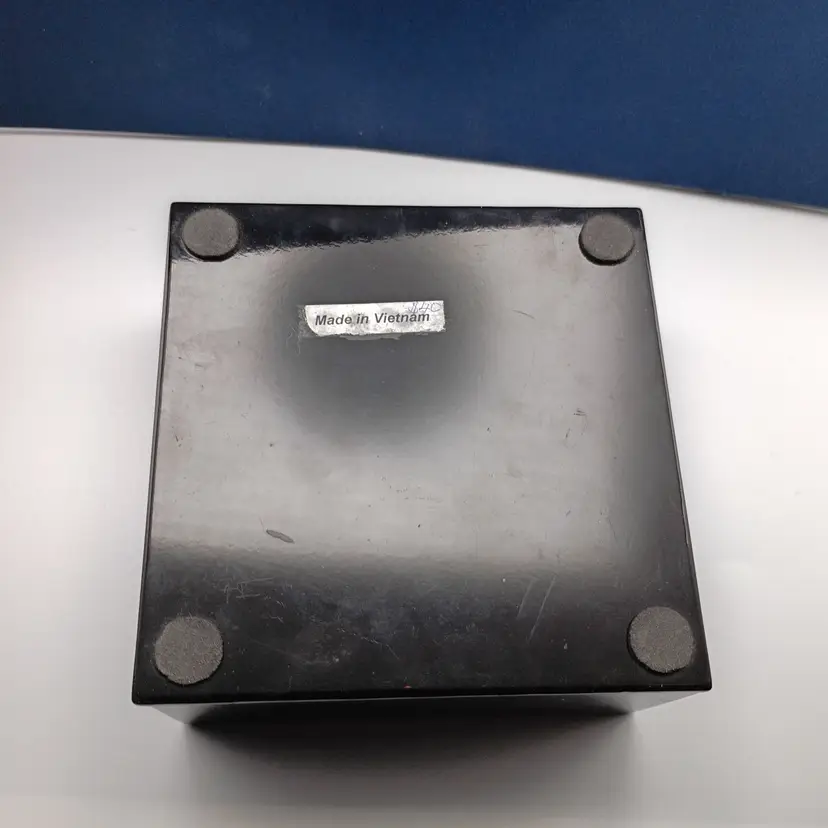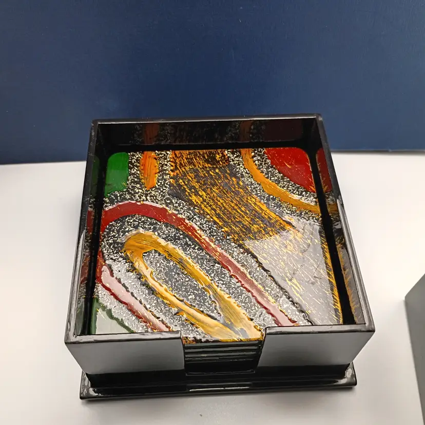 It's a fantastic set of 6 lacquered coasters made in Vietnam. They are colorful and textured and come in a matching storage box. They're in excellent condition with no chips or cracks.