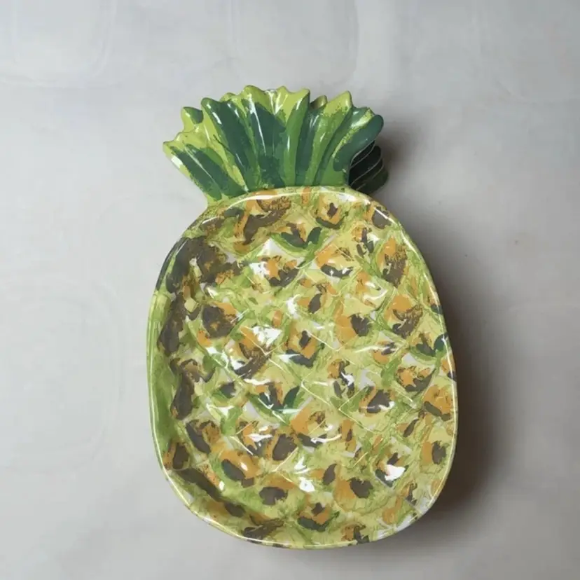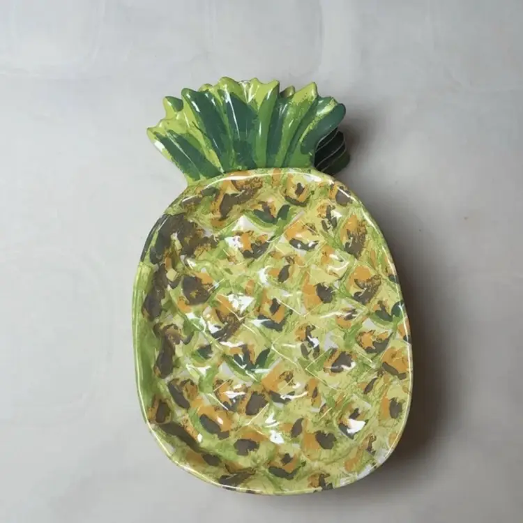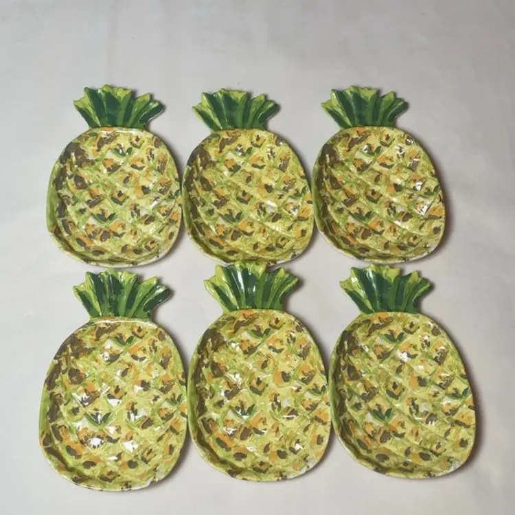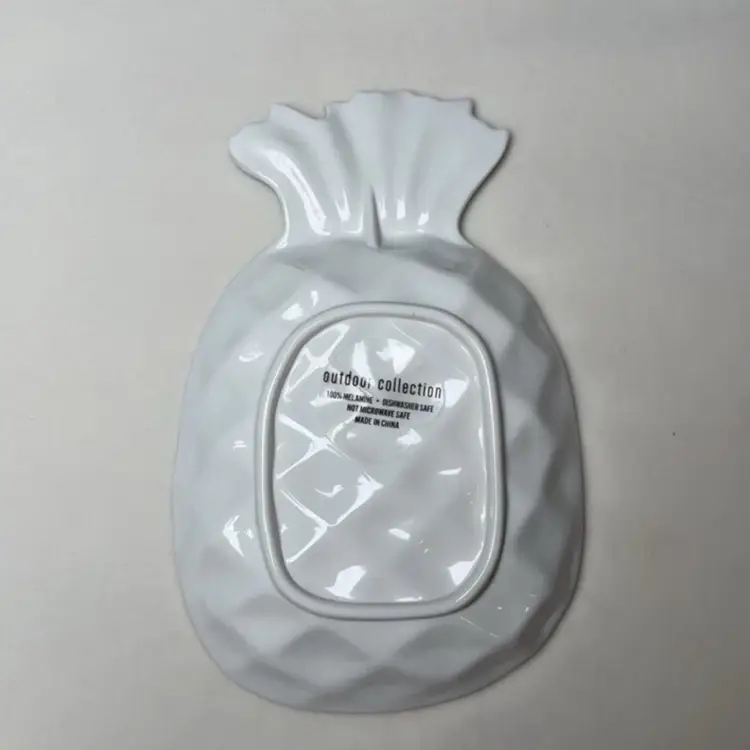 This set of 6 melamine appetizer snack plates from the Outdoor Collection features a tropical pineapple pattern, perfect for summer occasions. The pineapple design adds a fun and festive touch to your dining experience, while the low bowl shape is practical for serving a variety of appetizers and snacks. Perfect for adding a tropical flair to your kitchen or dining area. The plates are 7x4.5”.
