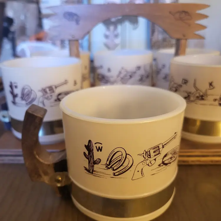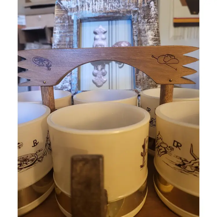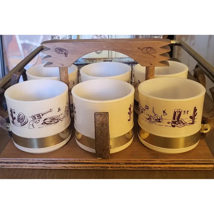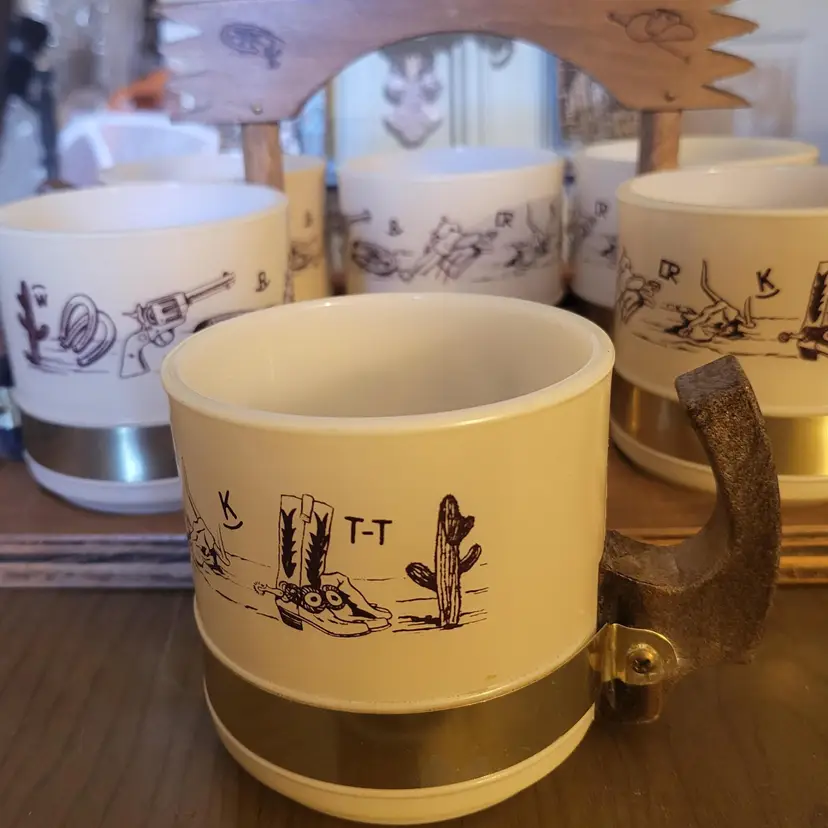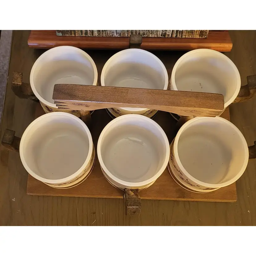 Set Of 6 Siesta Ware Western Mugs With Wooden Holder