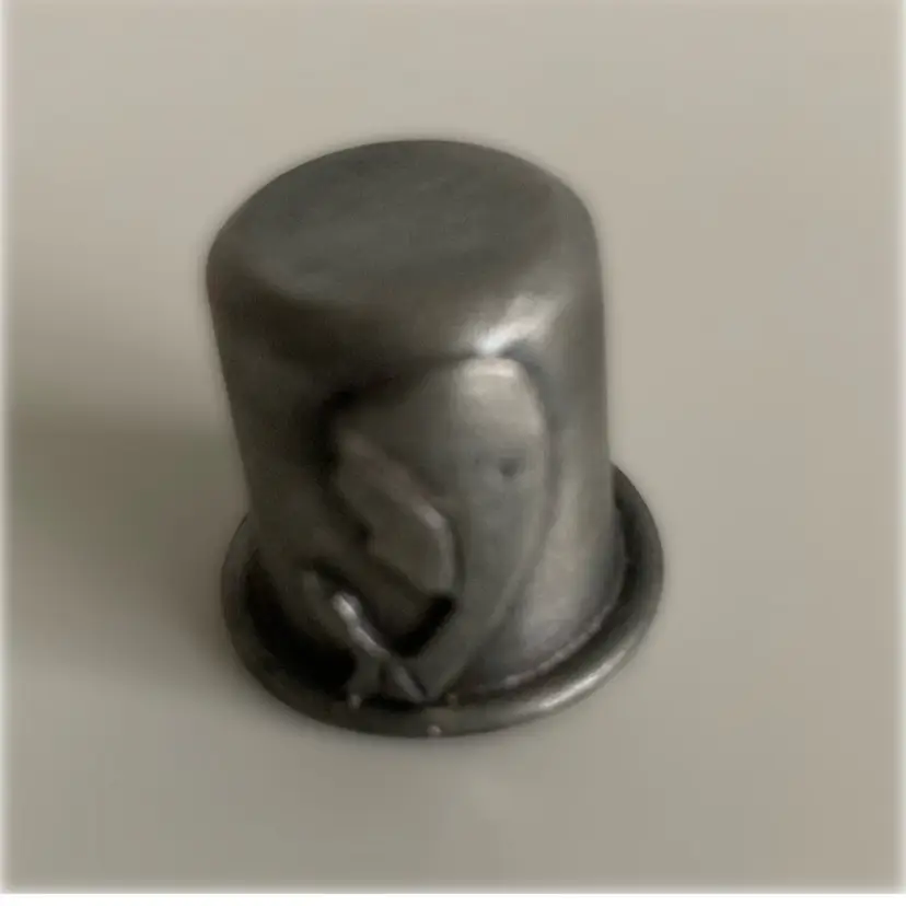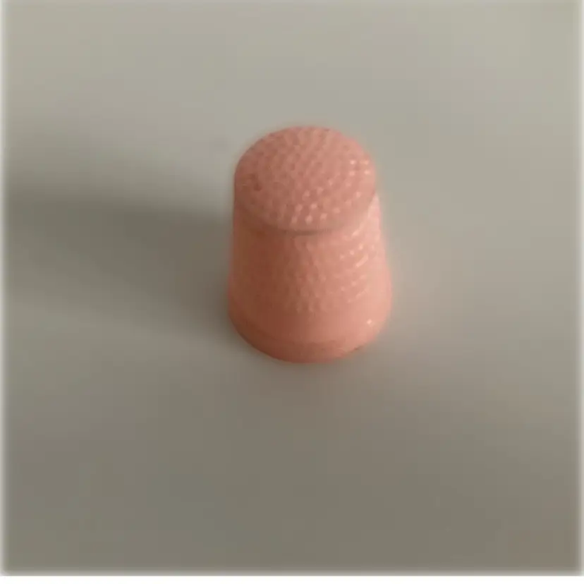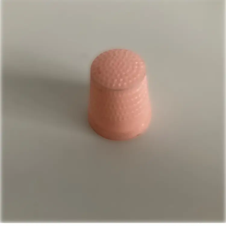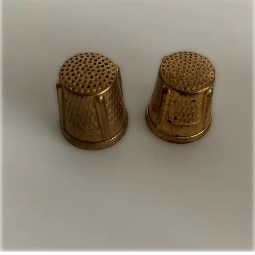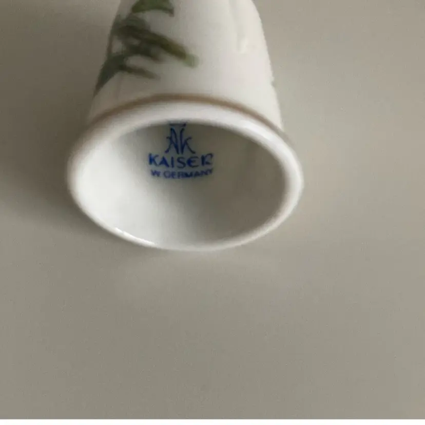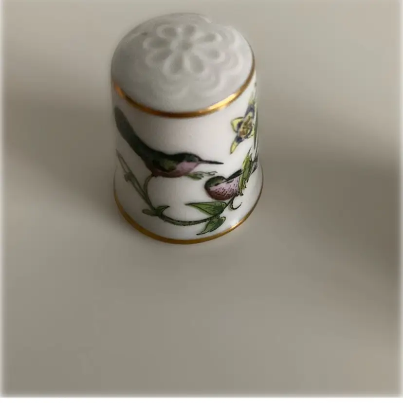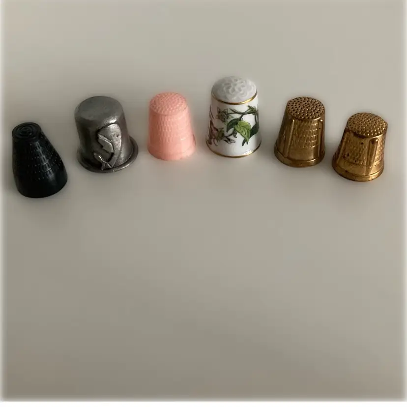 Set of 6 vintage sewing thimbles. Assorted brands and materials. The porcelain with tge painted birds in sigbed Kaiser, West Germany. The silver pewter Madonna or Motger Mary is signed RR and is pewter. The pink and bkack thimbles are plastic of some kind. The gold ones are brass metal or something lije that. They are non-magnetic.