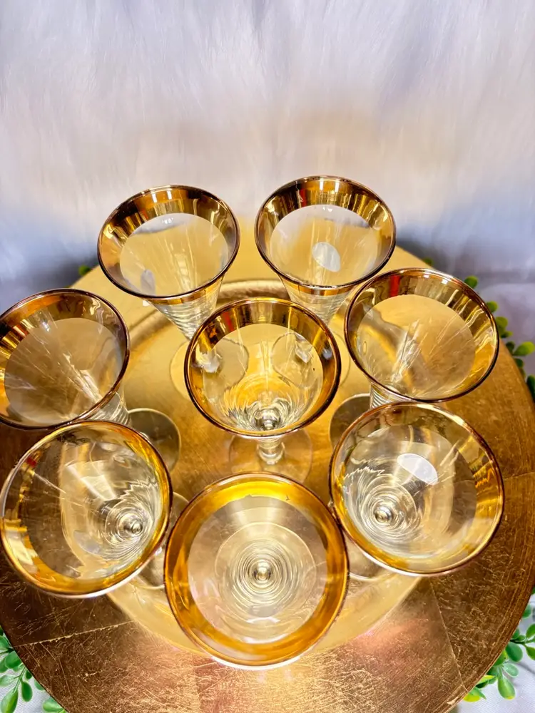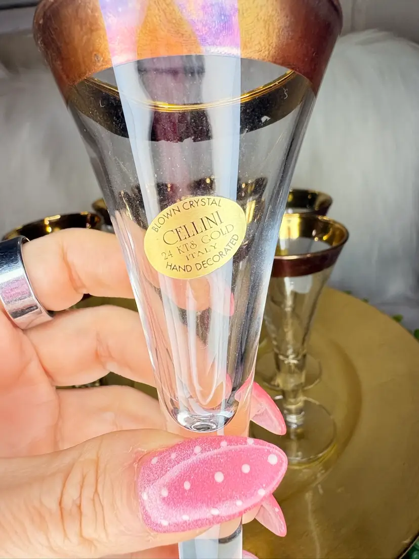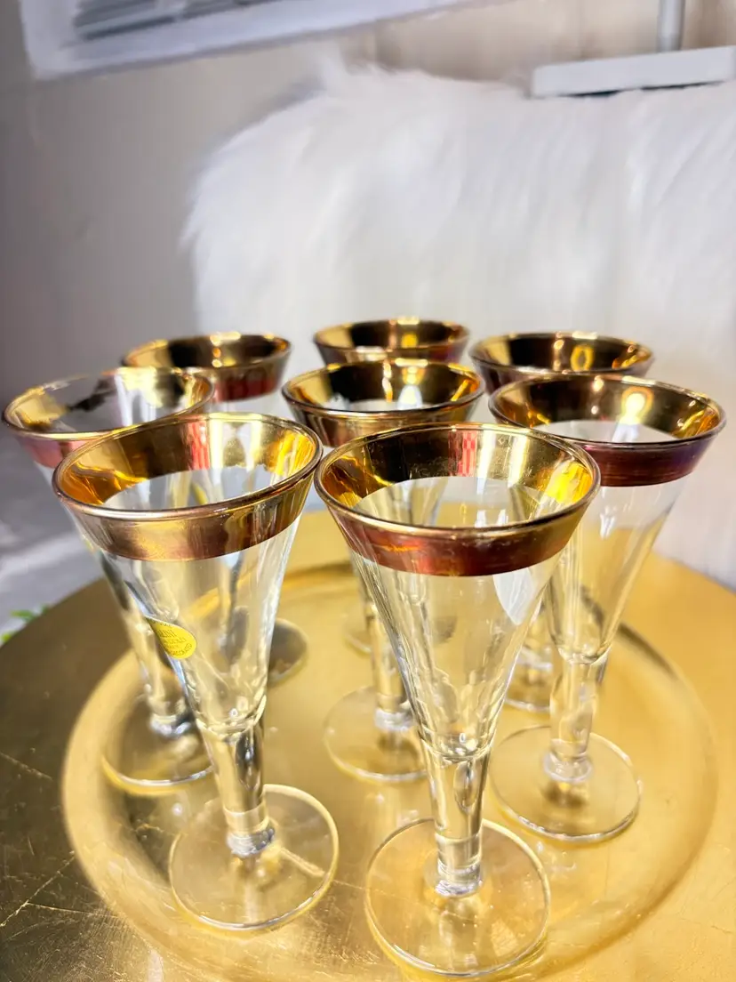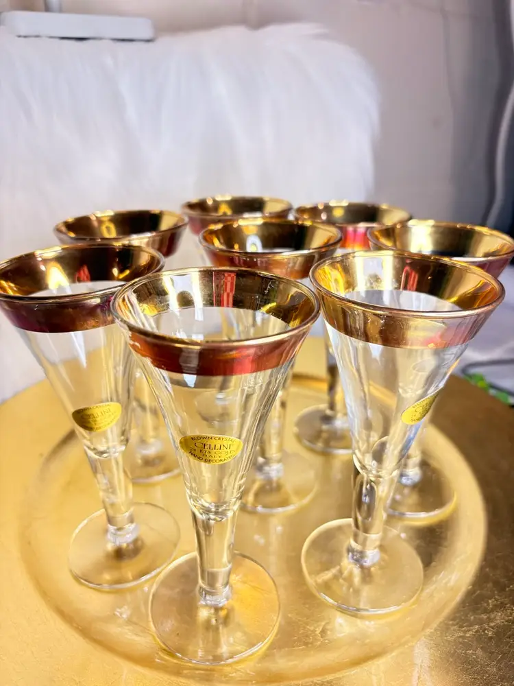 Set of 8 Cellini Hand-Decorated Blown Crystal Cordial Glass w/24k Gold Rims