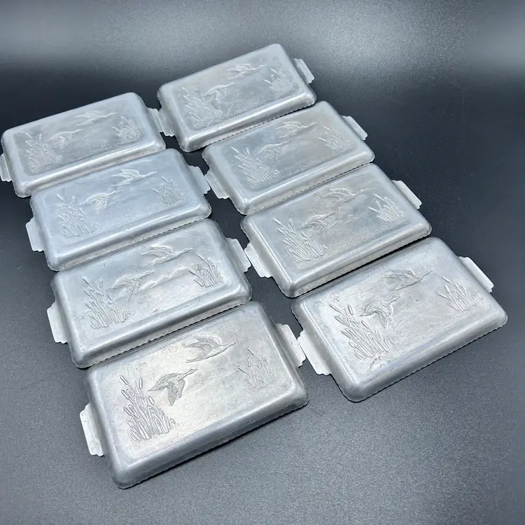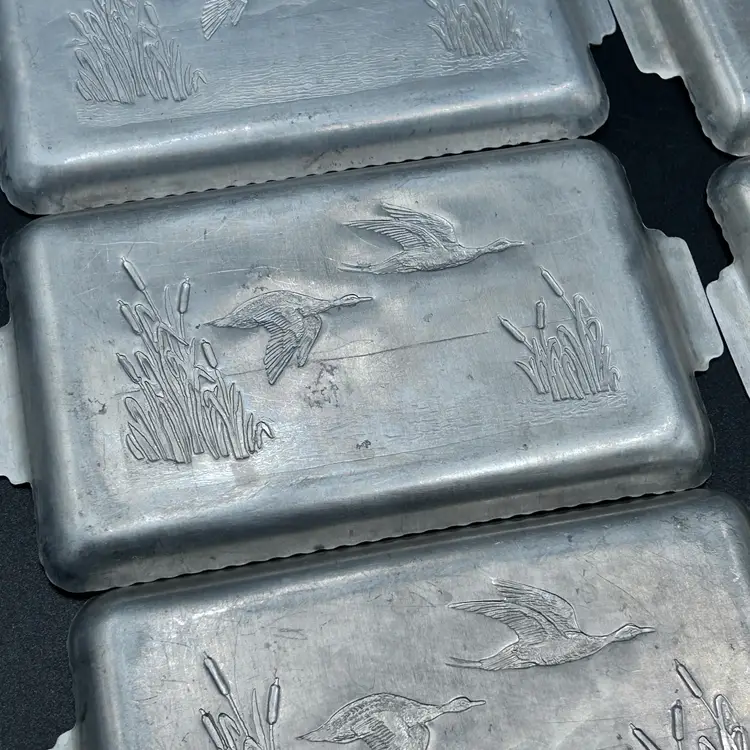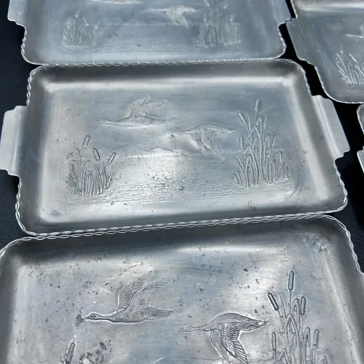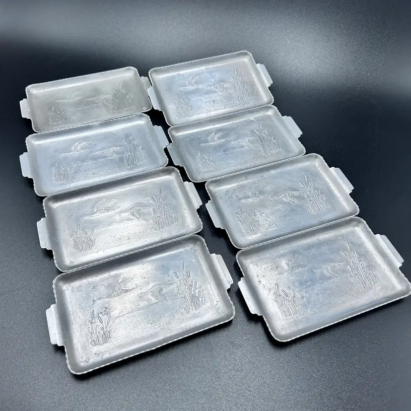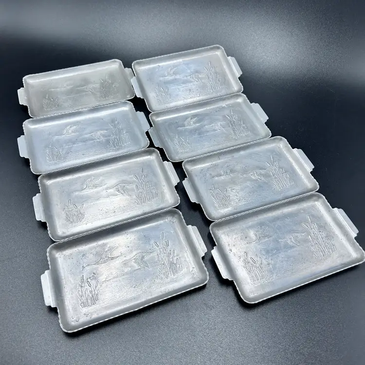 Set of 8 small MCM forged aluminum "flying ducks" theme small trays. Most are in good vintage condition - some with slight discoloration and scratches. Approximate size: 7" long x 4" wide.