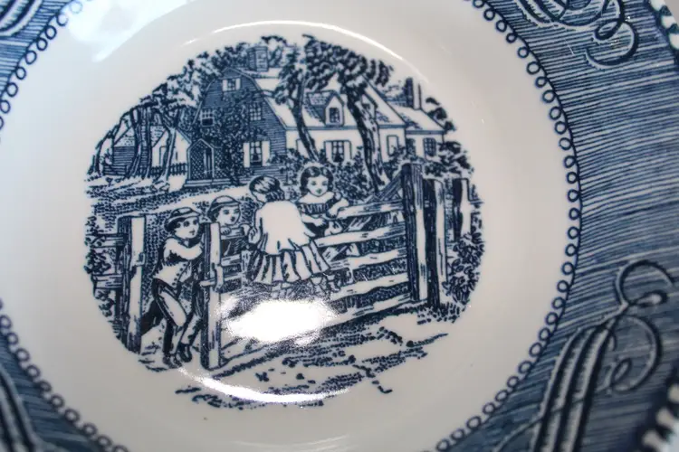 This set of 8 Royal Currier and Ives Berry/Fruit Bowls features a charming "The Old Farm Gate" pattern in blue and white, reminiscent of a bygone era. Made of china with a glossy finish, these vintage bowls are perfect for all occasions and add a touch of Americana to any table setting. Originating in the United States in the mid 20th century, these round bowls have a diameter of 5.5" and should be hand washed to maintain their original beauty. Ideal for collectors or those looking to add a unique piece to their kitchen decor, this set is a lovely addition to any home.