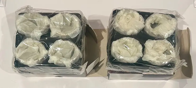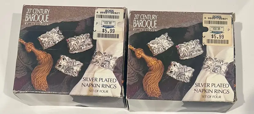 New in box - I only unwrapped one to show for pictures. The very old Ross tag is still on the box from 1993. Very nice quality napkin rings. Size is approximately 1" tall x 2" wide