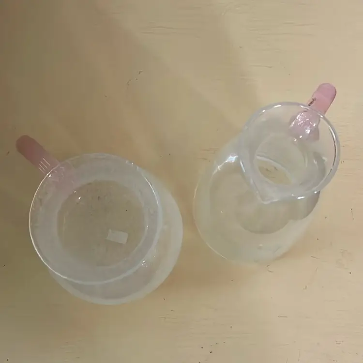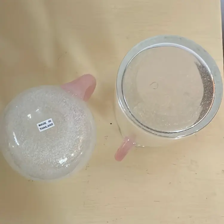Pretty with pink. Being sold together. Clear bubble glass tall is 8.5x4.5 short 5.25 tall x 6” including handles. Made in Thailand