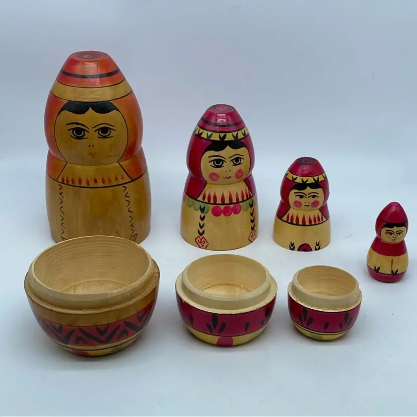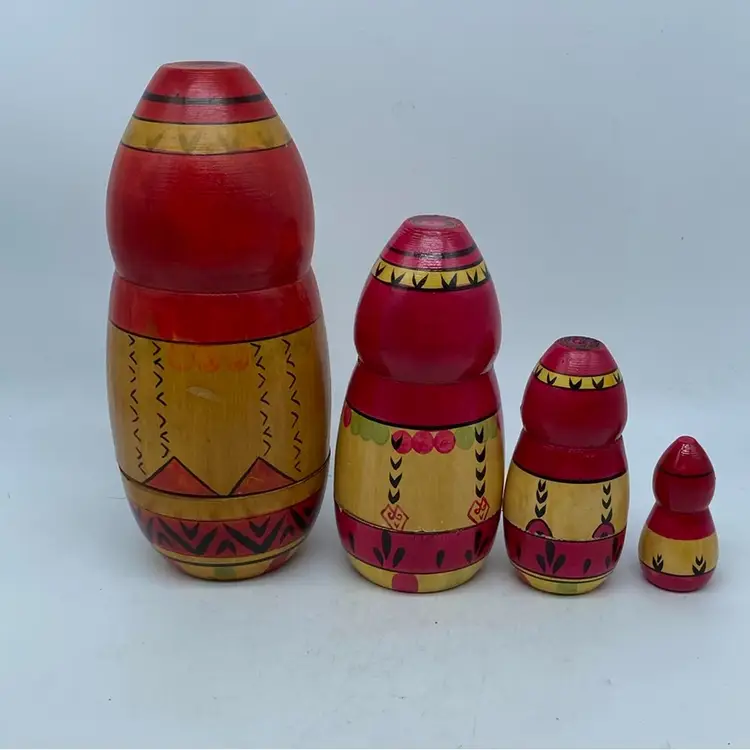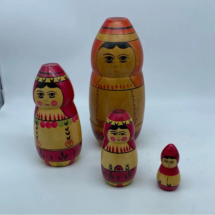 Set of Four Largest weathered with Age 8” Smallest 2.5” The Matryoshka doll, also known as a Russian nesting doll, is a set of wooden dolls of decreasing size placed one inside another. The original Matryoshka doll was made in 1890 in Sergiyev Posad by Vasily Zvyozdochkin from a design by Sergey Malyutin, who was a folk crafts painter. These dolls became widely popular as symbols of Russian folk art and culture, often depicting peasant women in traditional dress.