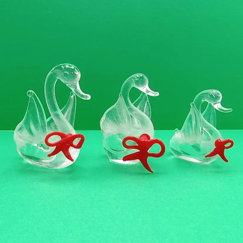 This is a cute little set of three mini glass swans in graduated sizes. Each swan has a red bow on its breast--the bow on the little swan has a loop broken off.