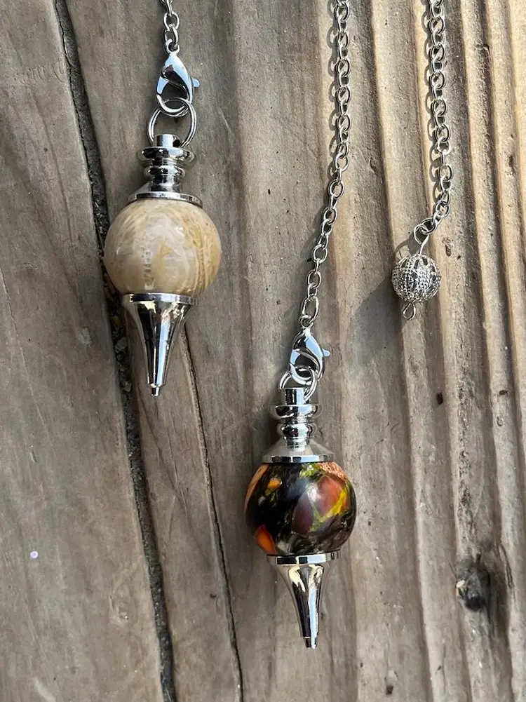 A pair of pendulum points. Each are approximately 1 7/8 inches long and 1/2 inch wide. On 7 inch chains.