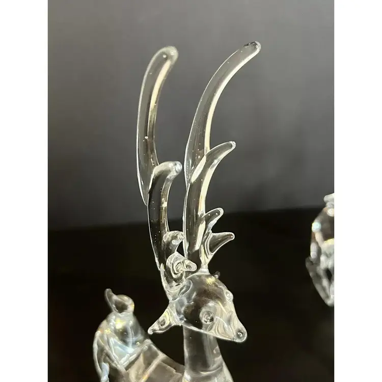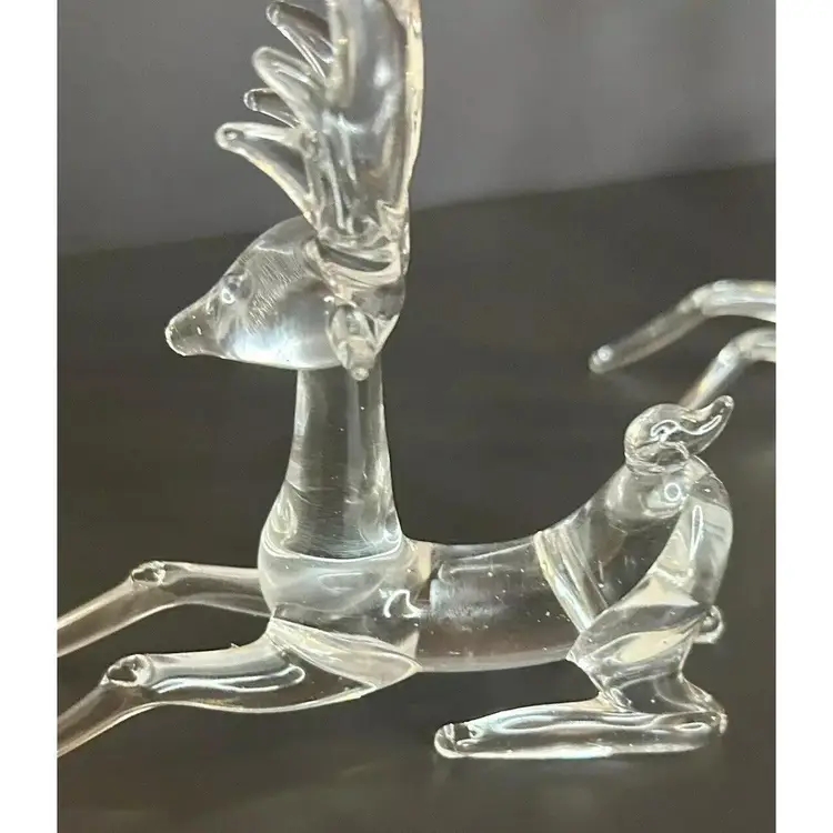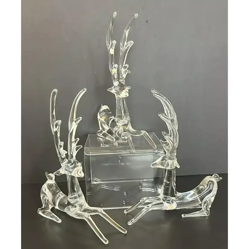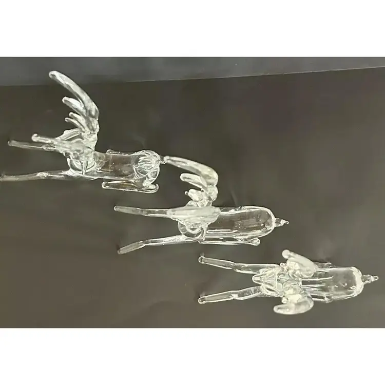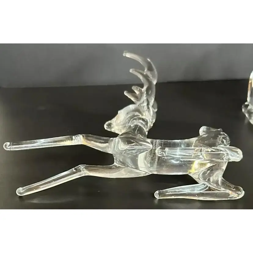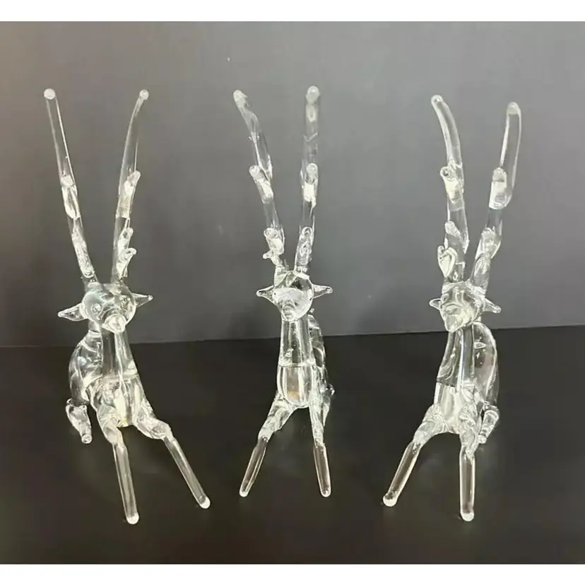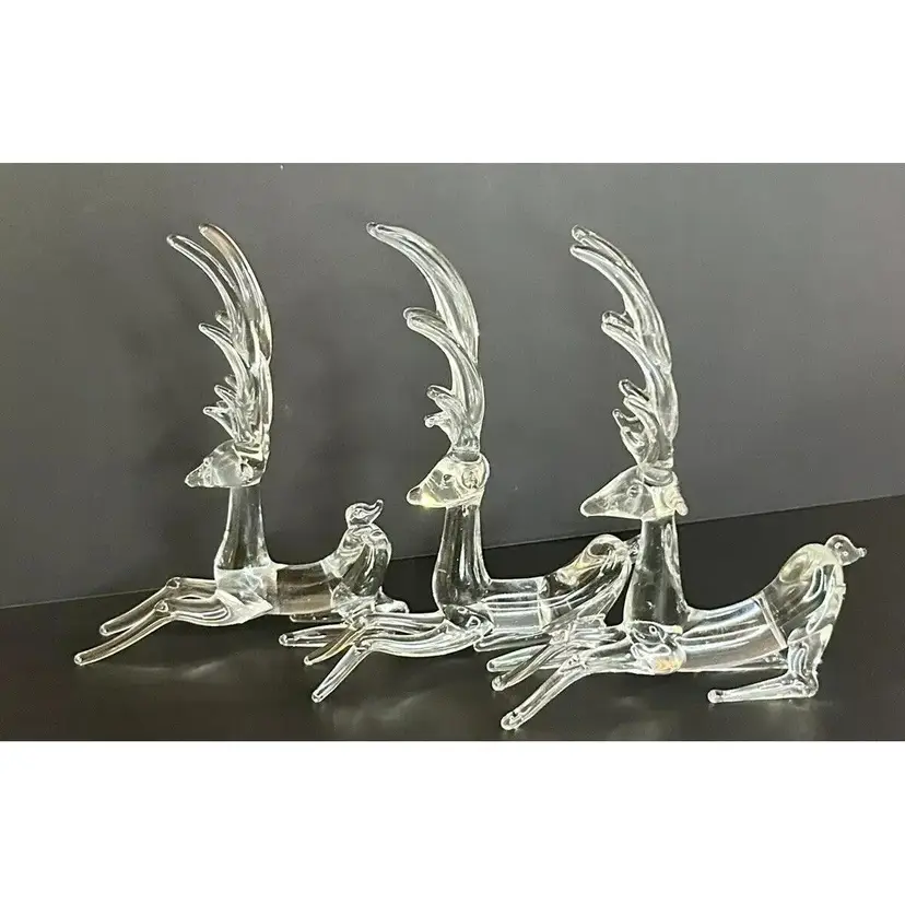 Add a touch of elegance to your Christmas decor with this Set of Three (3) Art Glass Hand Blown Clear Laying Reindeer Sculptures. Crafted from high-quality glass, these sculptures are perfect for any collector or holiday enthusiast. The clear color of the glass beautifully complements any decor theme, while the intricate details of the reindeer's mane and antlers add a unique touch.