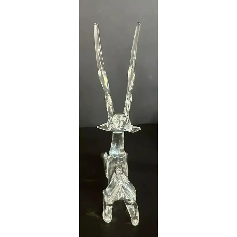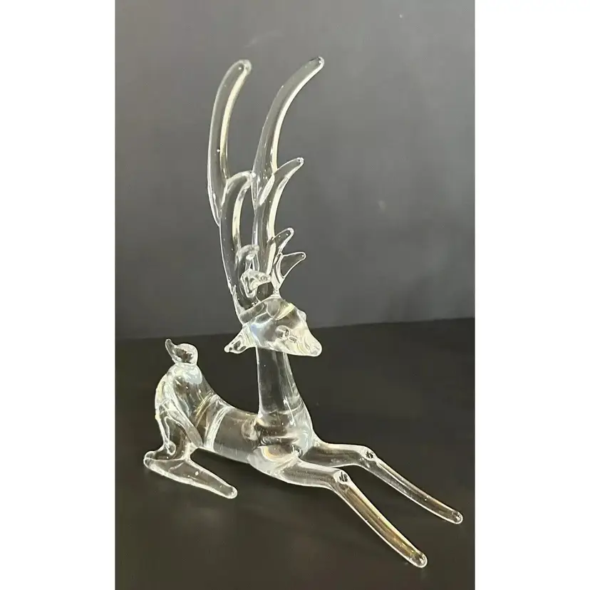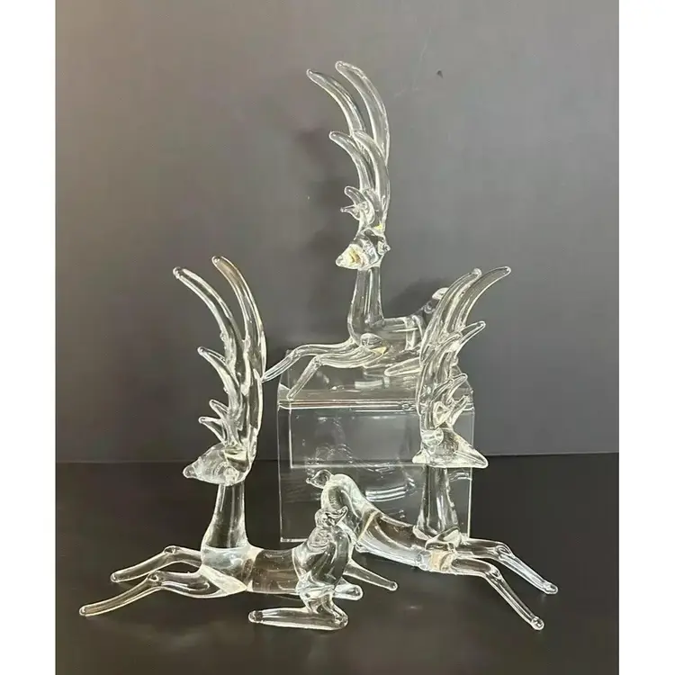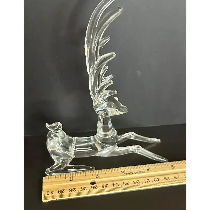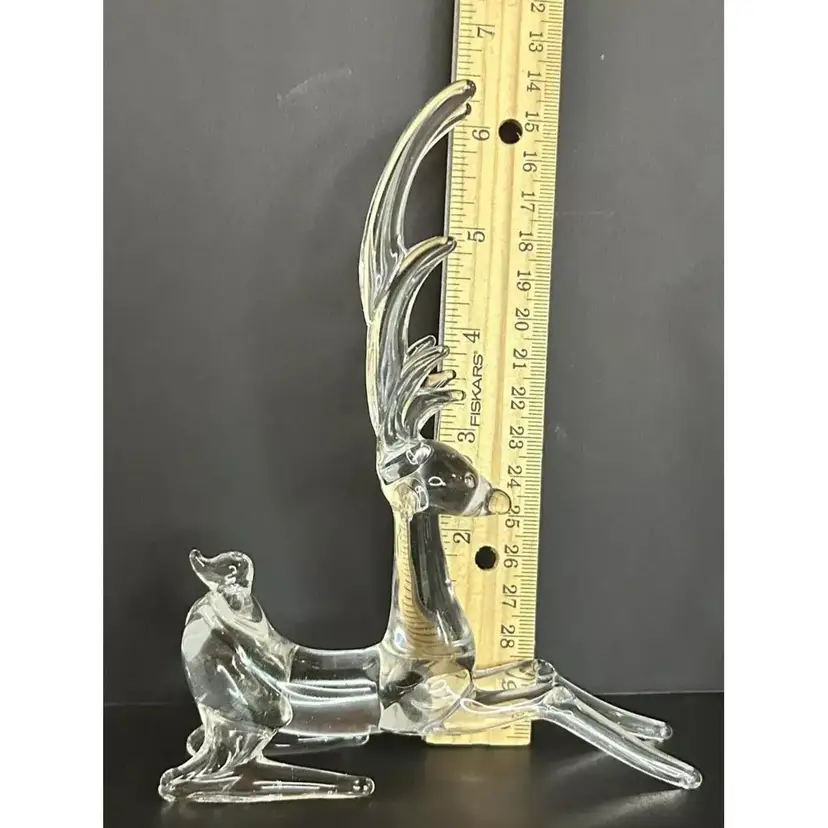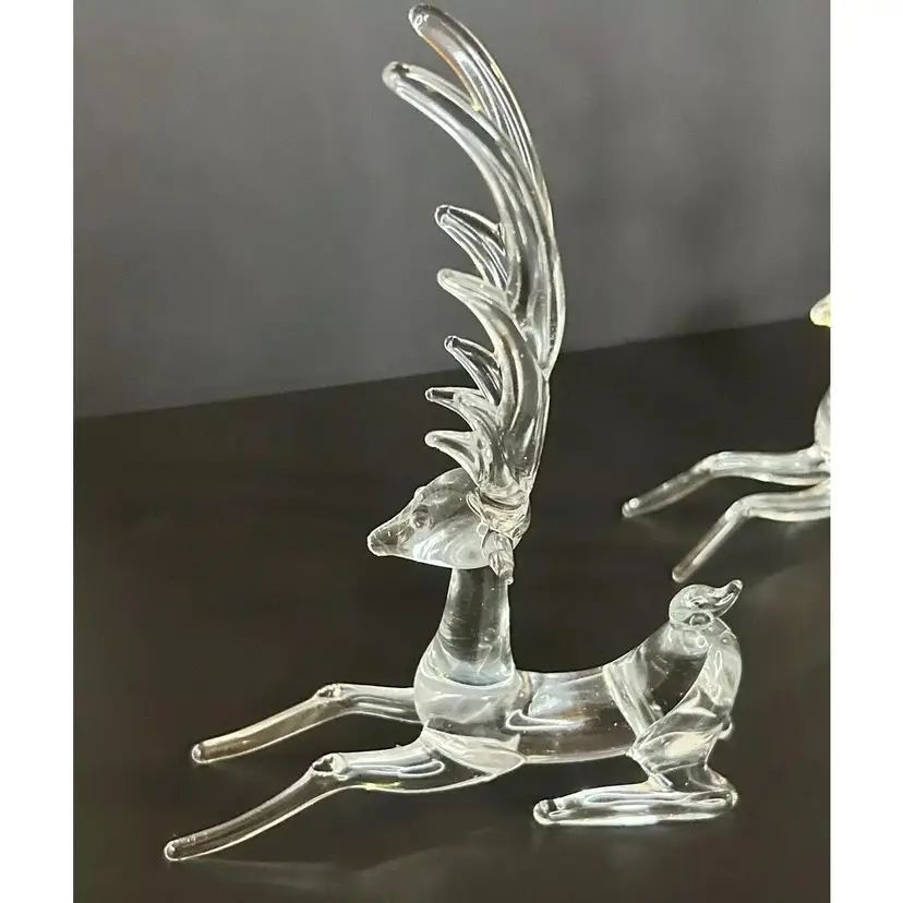 Add a touch of elegance to your Christmas decor with this Set of Three (3) Art Glass Hand Blown Clear Laying Reindeer Sculptures. Crafted from high-quality glass, these sculptures are perfect for any collector or holiday enthusiast. The clear color of the glass beautifully complements any decor theme, while the intricate details of the reindeer's mane and antlers add a unique touch.