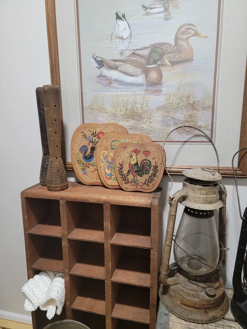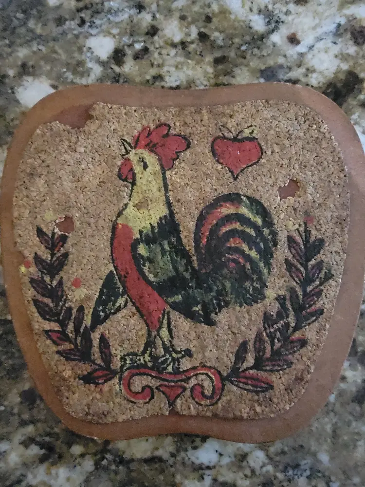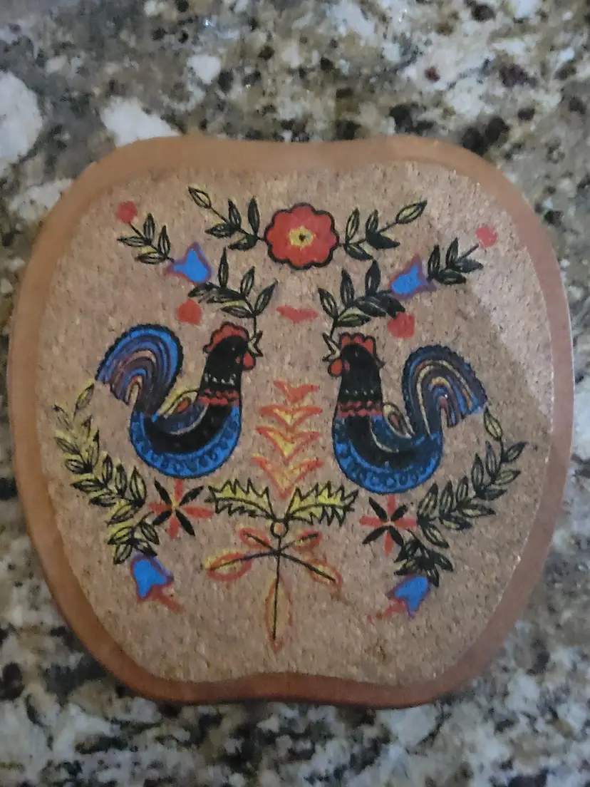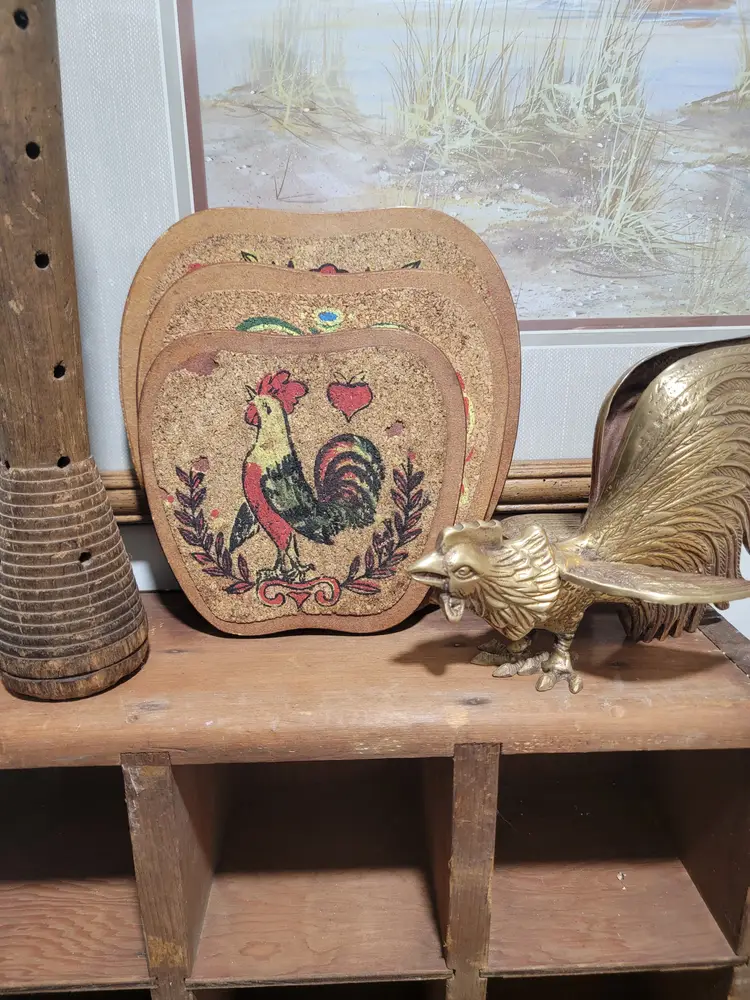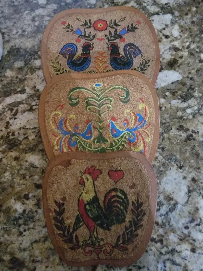 This is such a quant set of vintage tole trivets. Beautiful artwork and colors. These are wooden with cork fronts. They measure 8, 7, and 6 inches. The small trivet has two little flaws.
