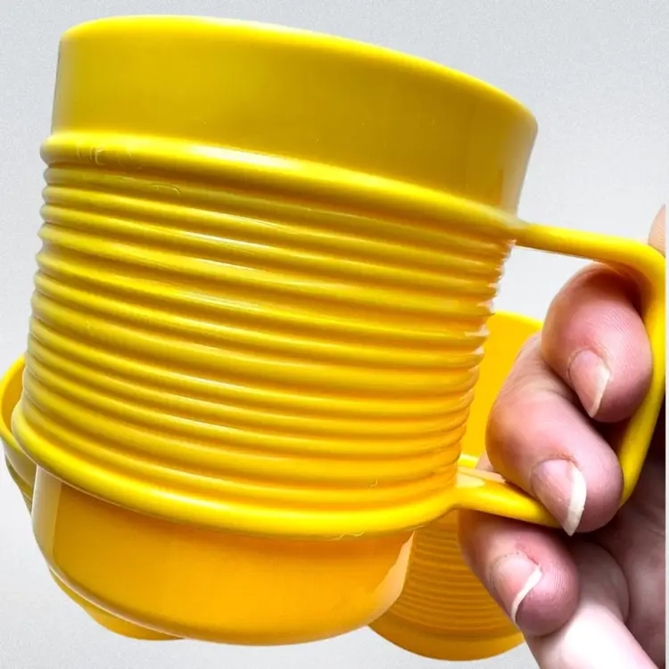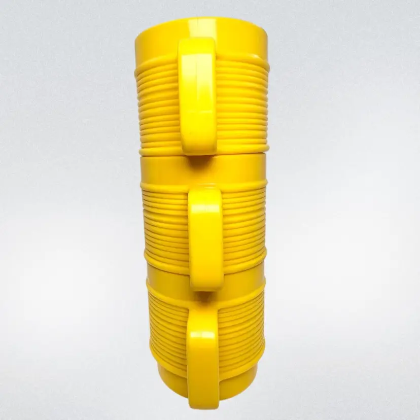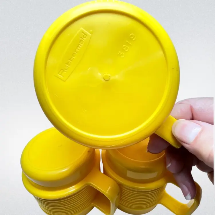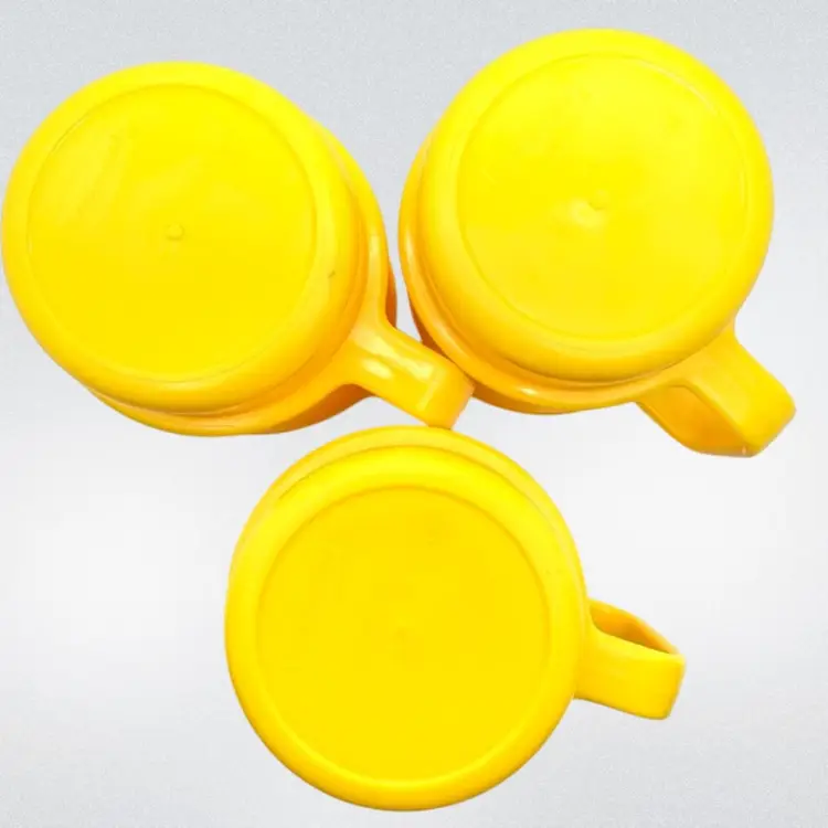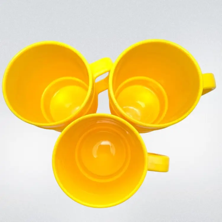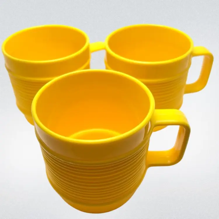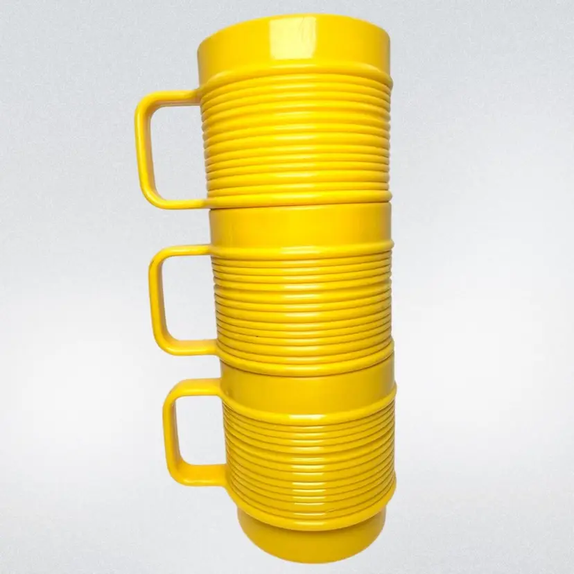 Fun stackable cups. Holds ~ 10 fluid ounces. Set of 3 handled cups in lovely bright yellow color. Good condition with minor scuff and marks. See photos for condition. Lightweight 3 ounces each 3-1/2” tall x 3-1/8” diameter across top