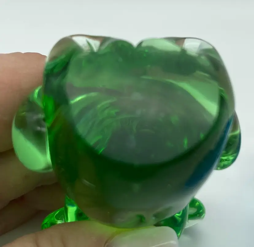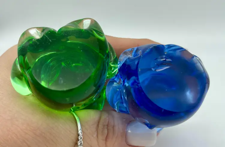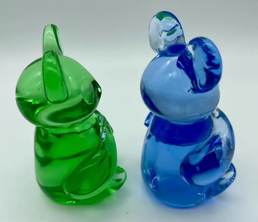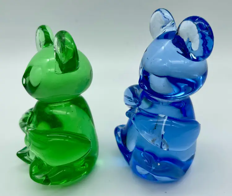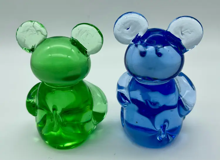 One blue and one green. Good pre-owned condition, no chips, cracks or breakage. Imperfection in glass where left arm is applied on blue bear. No signature or markings. Approx. 3" tall