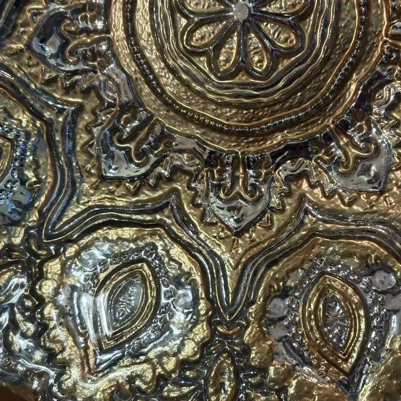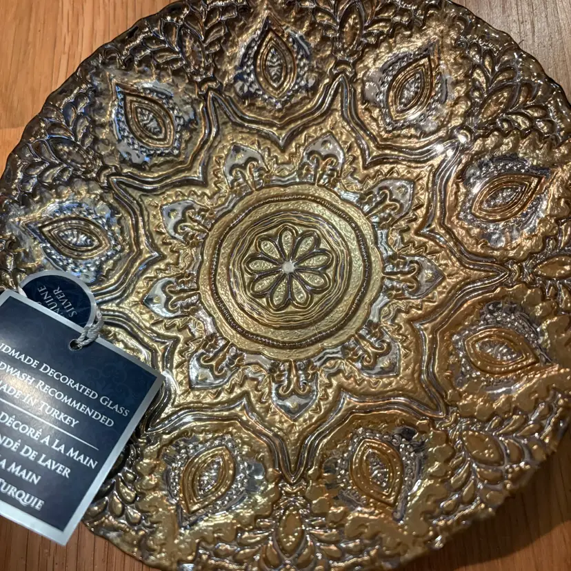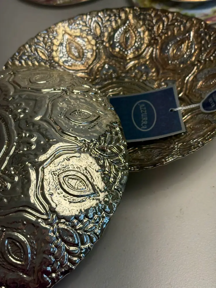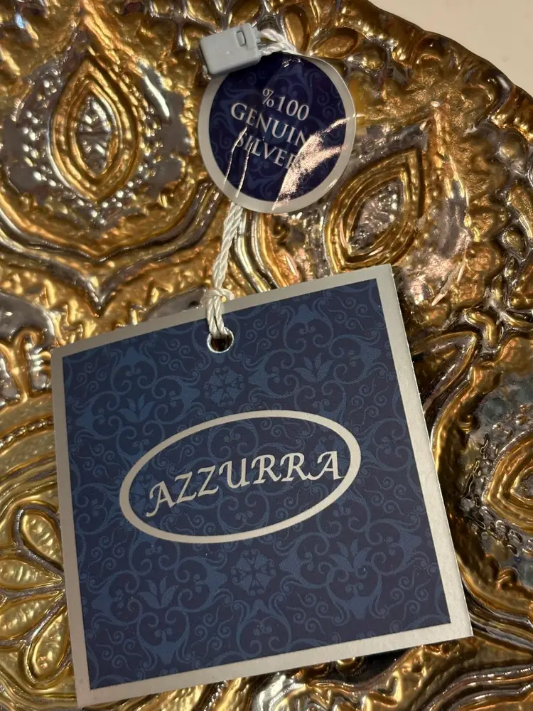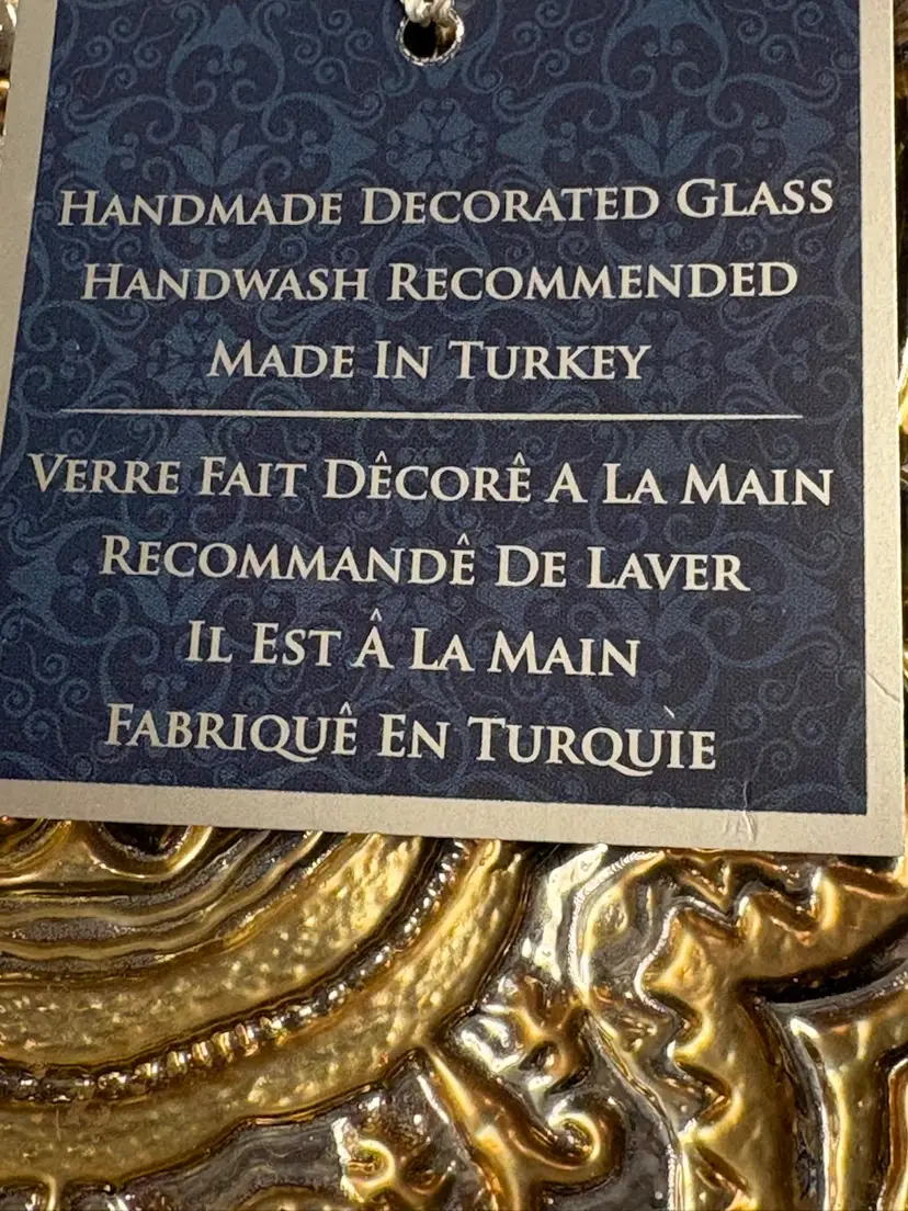 This set of two Azzurra gold and silver handmade art glass bowls, made in Turkey, features a beautifully crafted design with a Victorian style. The hand-blown glass reflects a delicate flower pattern and is adorned with limited edition hand-painted details. These round bowls are a stunning addition to any home decor, adding a touch of elegance and sophistication to your space. Made with quality materials and a unique production technique, these bowls are a perfect statement piece for those who appreciate fine artistry and craftsmanship.