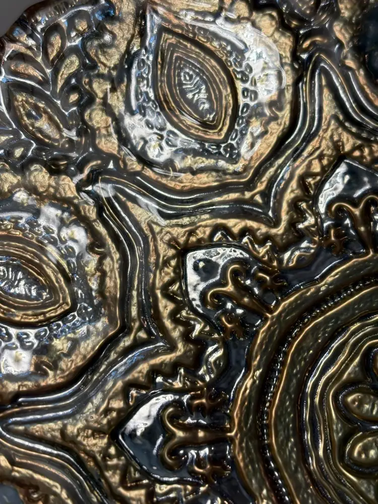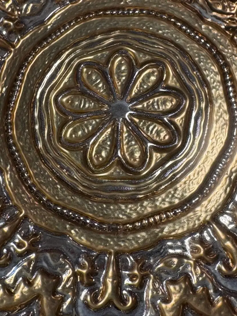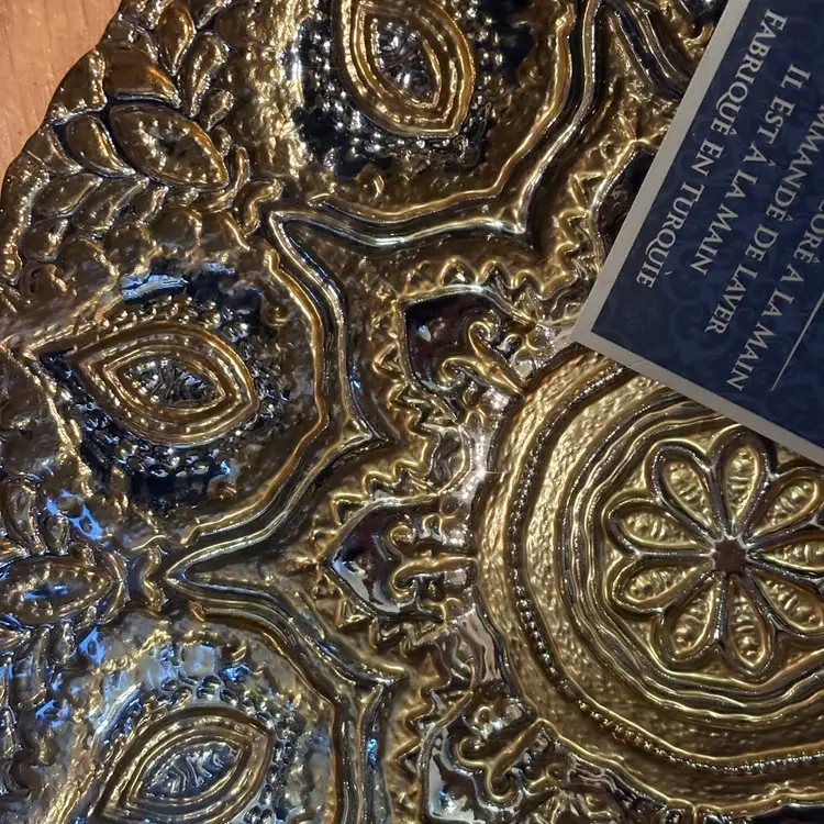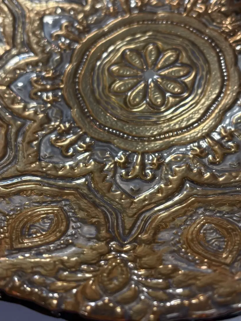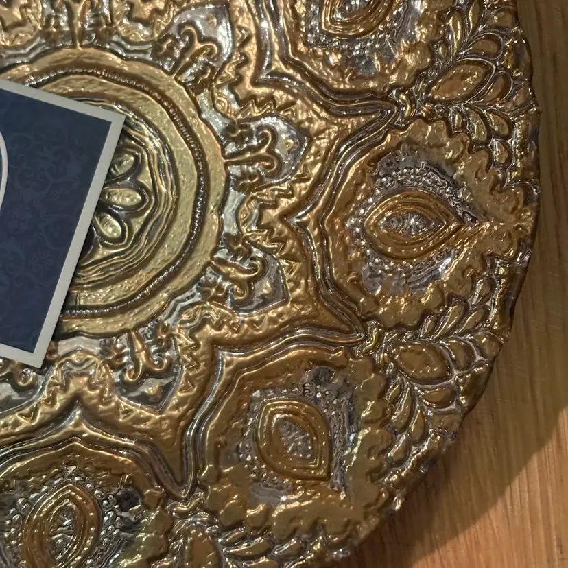 This set of two Azzurra gold and silver handmade art glass bowls, made in Turkey, features a beautifully crafted design with a Victorian style. The hand-blown glass reflects a delicate flower pattern and is adorned with limited edition hand-painted details. These round bowls are a stunning addition to any home decor, adding a touch of elegance and sophistication to your space. Made with quality materials and a unique production technique, these bowls are a perfect statement piece for those who appreciate fine artistry and craftsmanship.