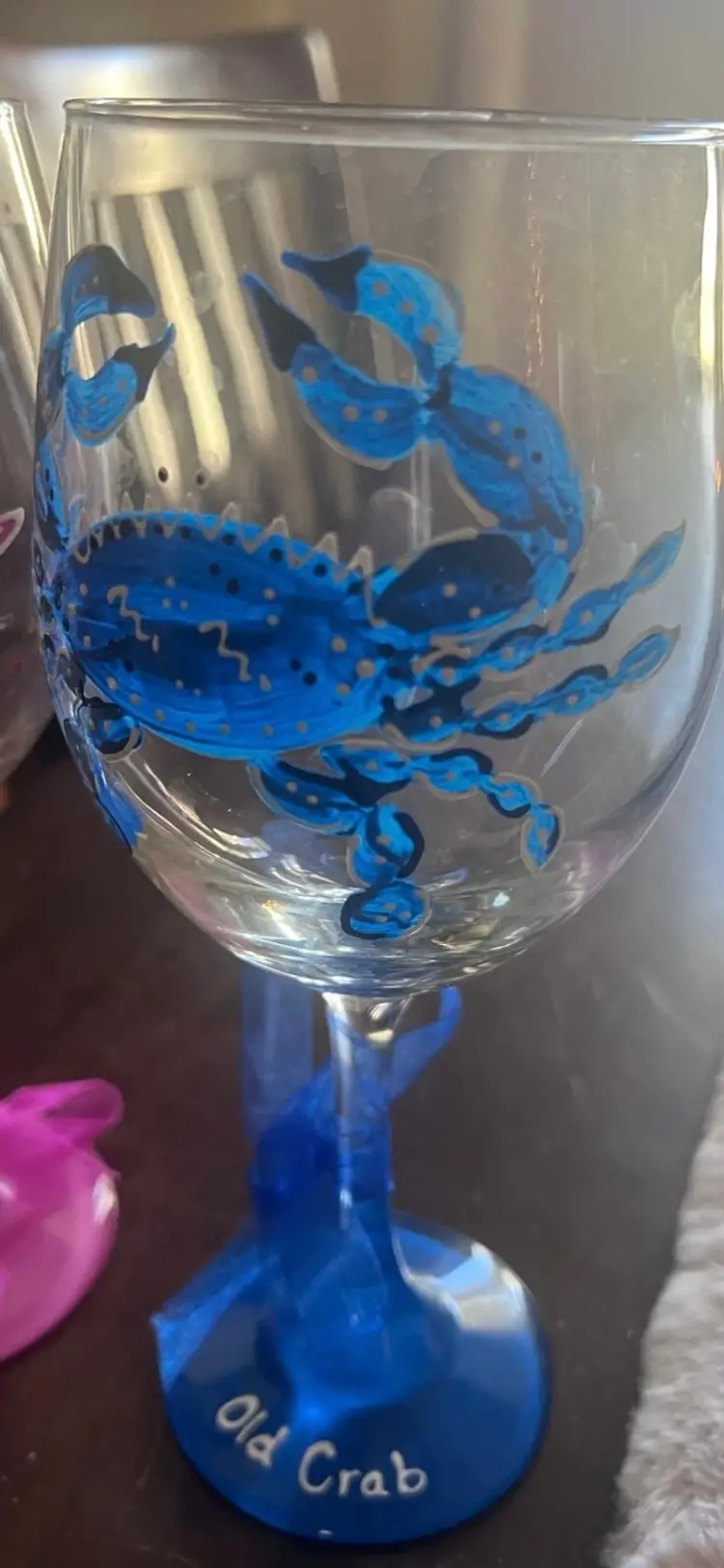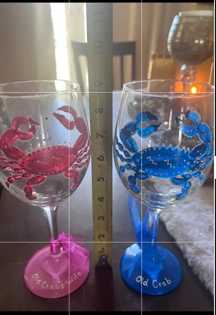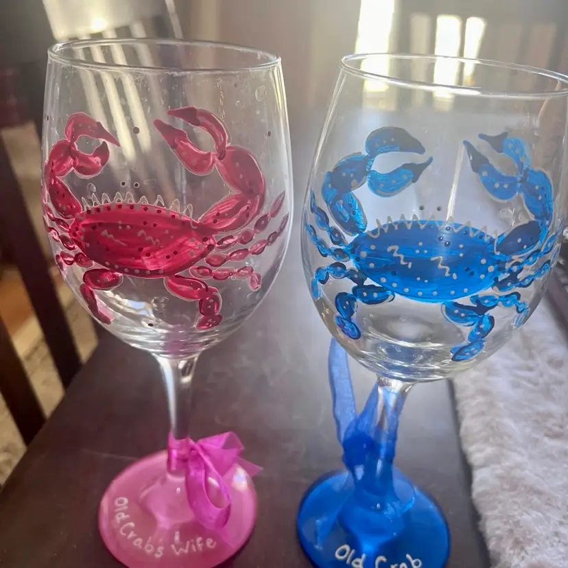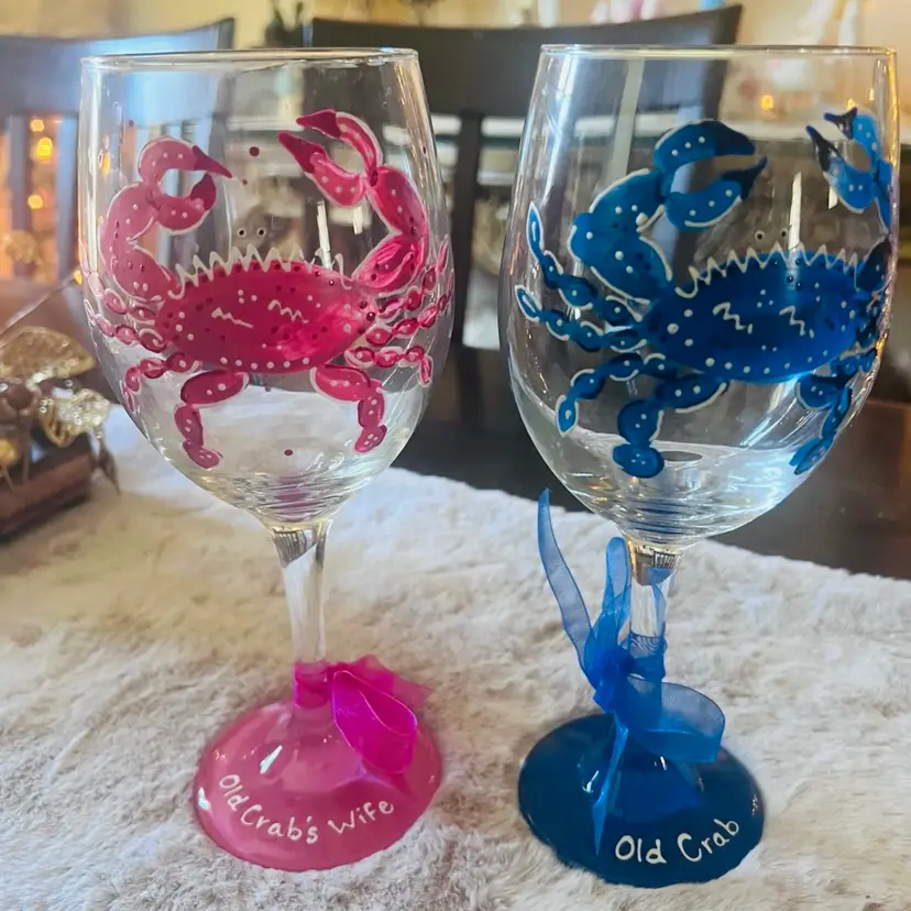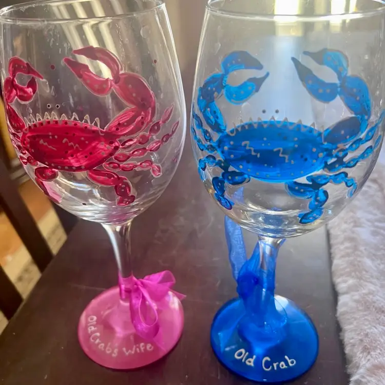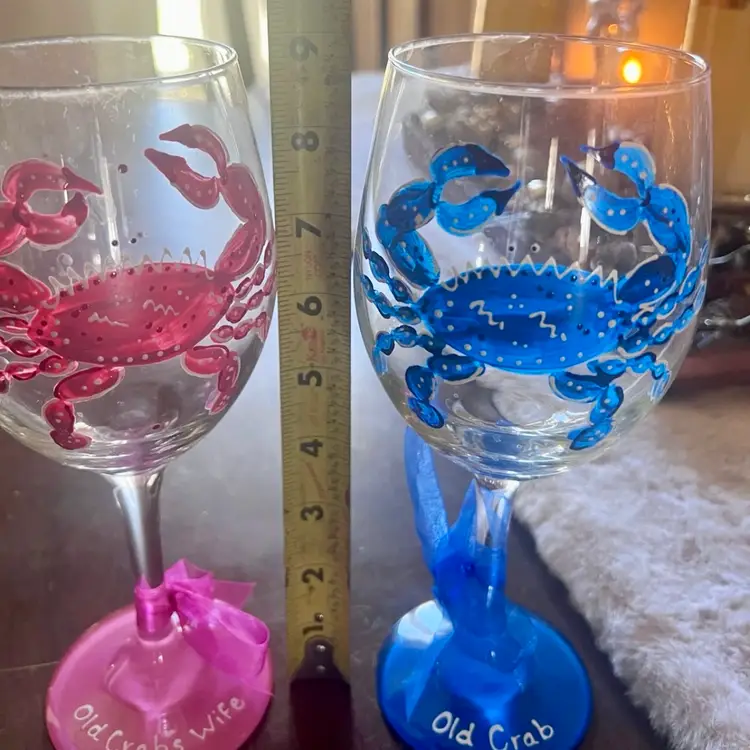 Set of two hand painted crab wine glasses. the first one is painted blue and has "Old Crab" painted on the rim with a blue ribbon tied at the base. The second wine glass is a handpainted pink crab with "Old crab's wife" painted on the pink at the bottom. This one has a pink ribbon tied to rim. These would be a great anniversary gift or just to add to your collection. They measure at 9 inches in height. No chips. No cracks. These have been in a cabinet and never used.