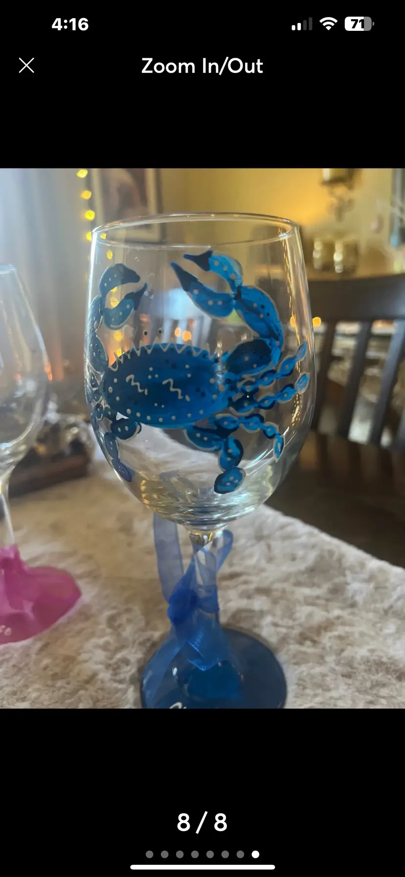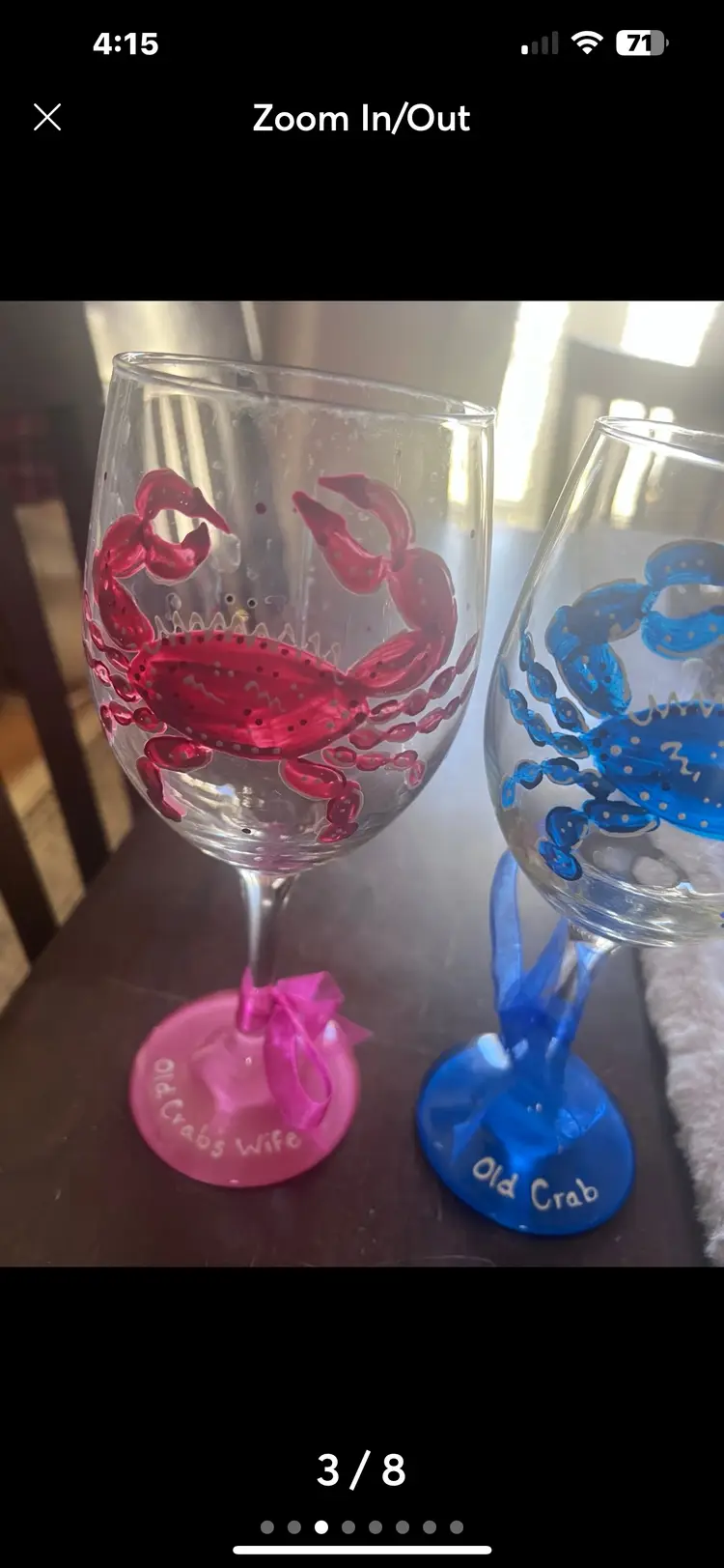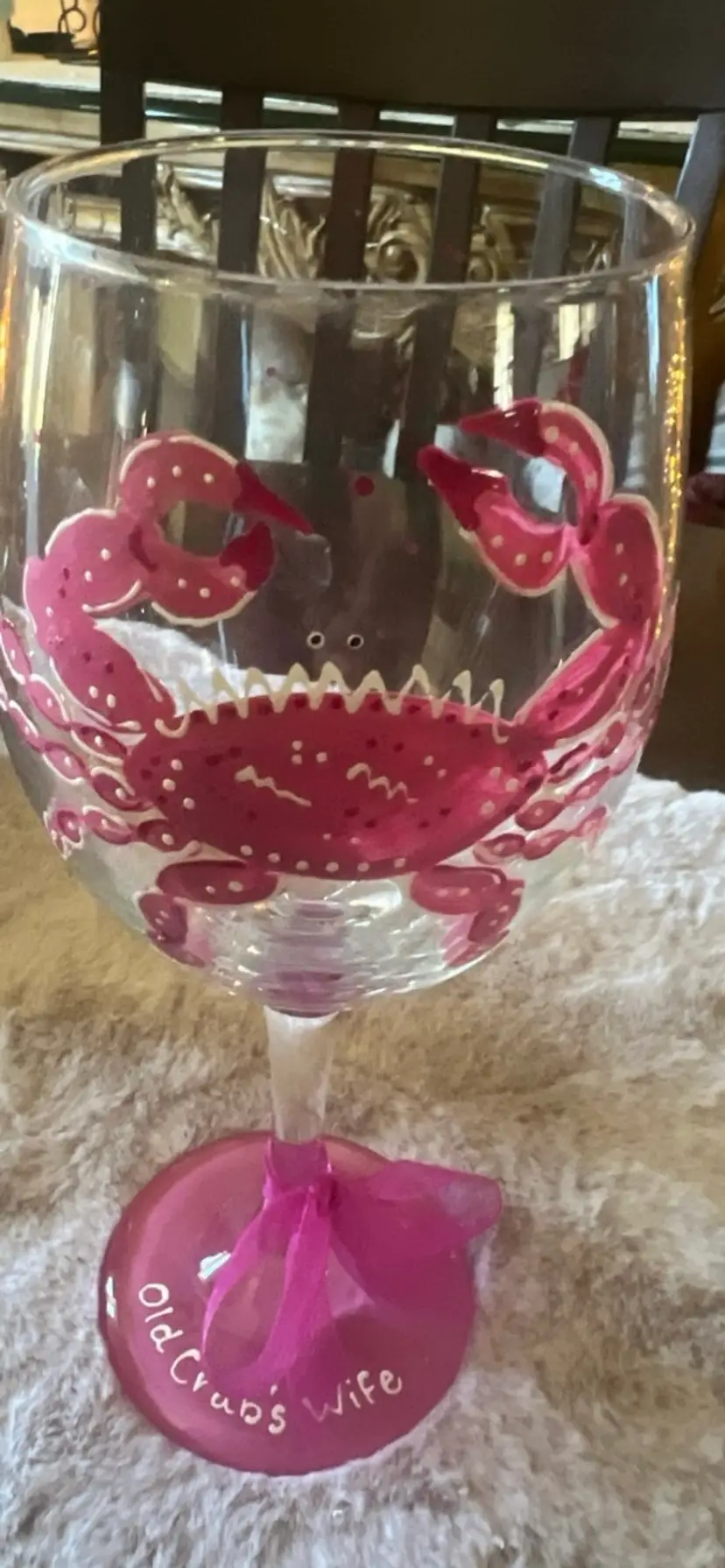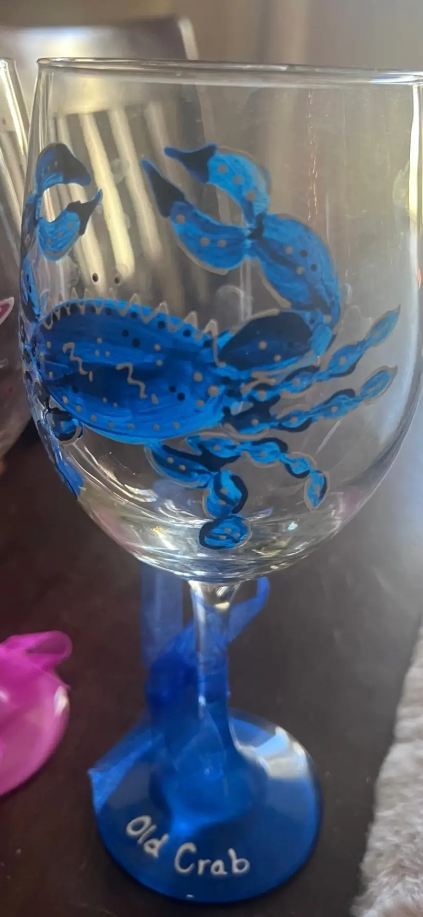 Set of two hand painted crab wine glasses. the first one is painted blue and has "Old Crab" painted on the rim with a blue ribbon tied at the base. The second wine glass is a handpainted pink crab with "Old crab's wife" painted on the pink at the bottom. This one has a pink ribbon tied to rim. These would be a great anniversary gift or just to add to your collection. They measure at 9 inches in height. No chips. No cracks. These have been in a cabinet and never used.