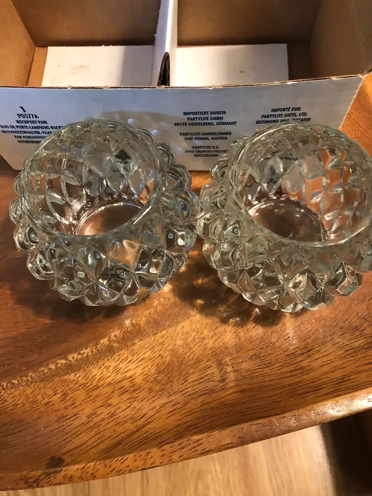 Discontinued series. These PartyLite Rockport Votive Candle Holders are a set of 2, measuring 3" in height and 2" in width. The holders feature a diamond pattern and a modern, romantic style, perfect for all occasions. Made in the United States in the late 20th century, the clear crystal-like design adds an elegant touch to any space. Suitable for mini candles, these decorative collectibles are a shiny finish and a beautiful addition to any home decor