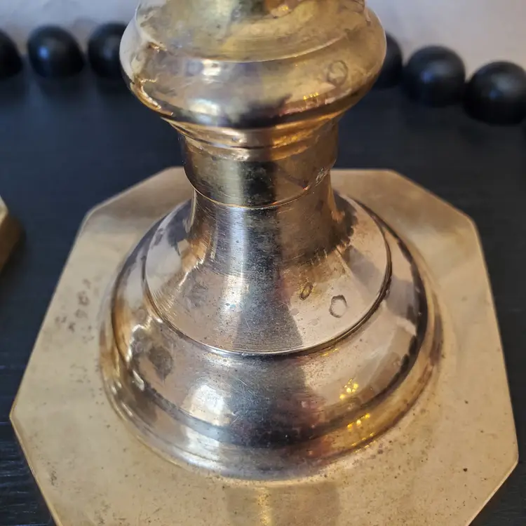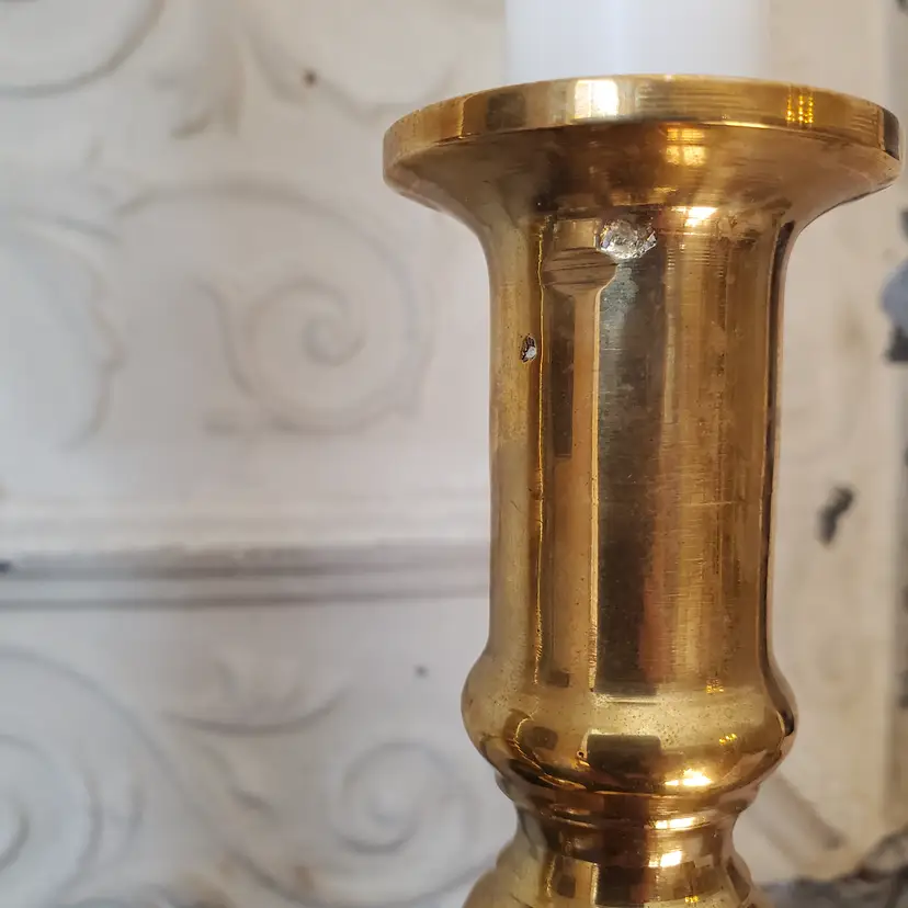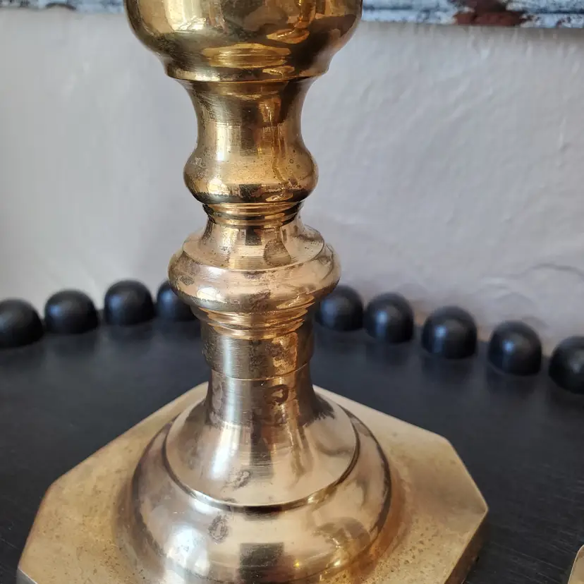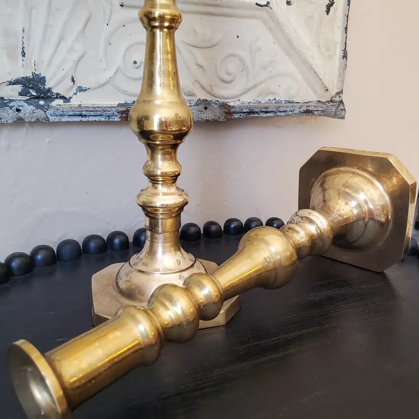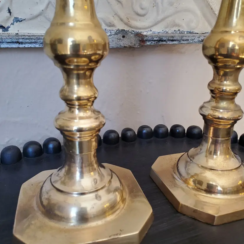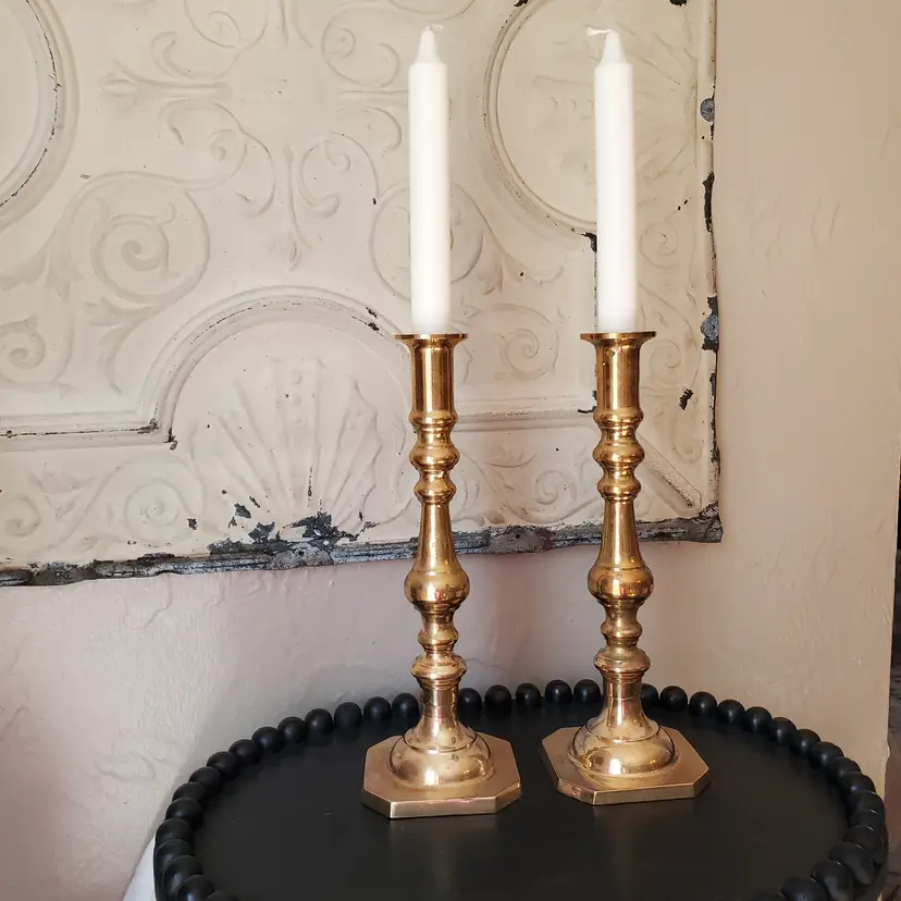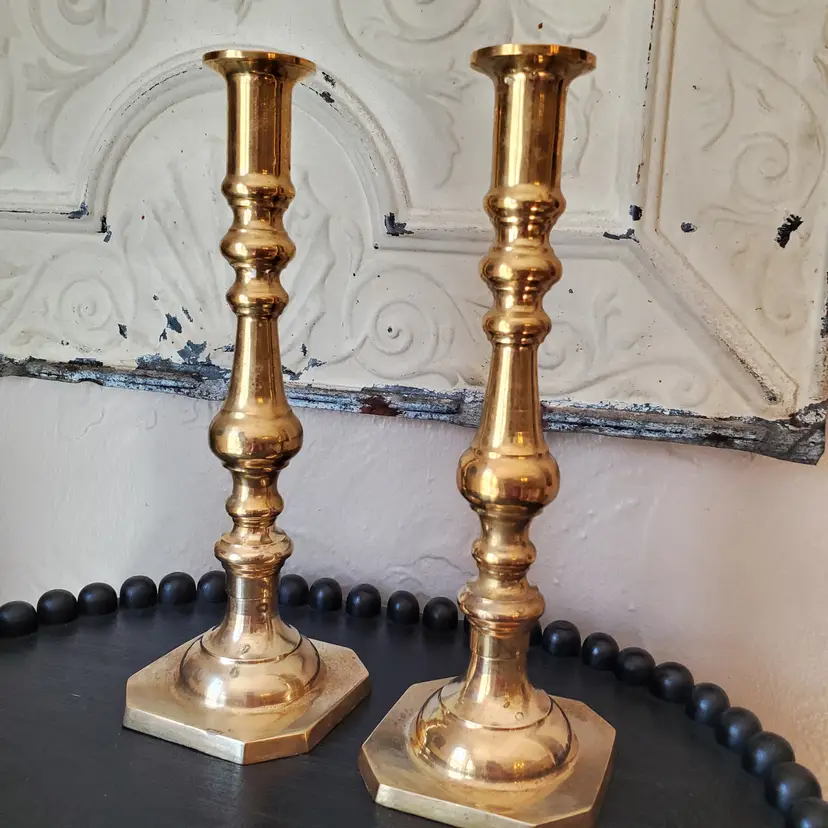A lovely set of two tall brass candlesticks. These do you have some patina but I have not polished them. 10 1/4".