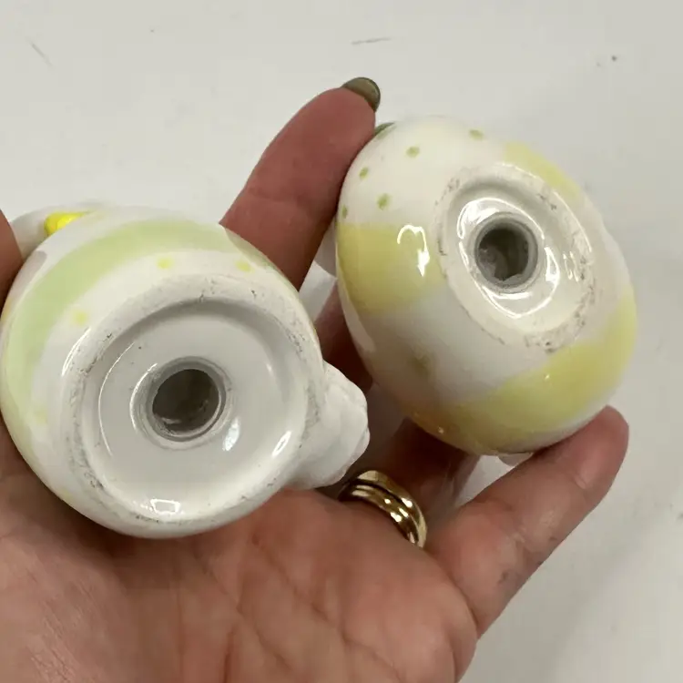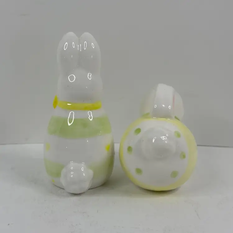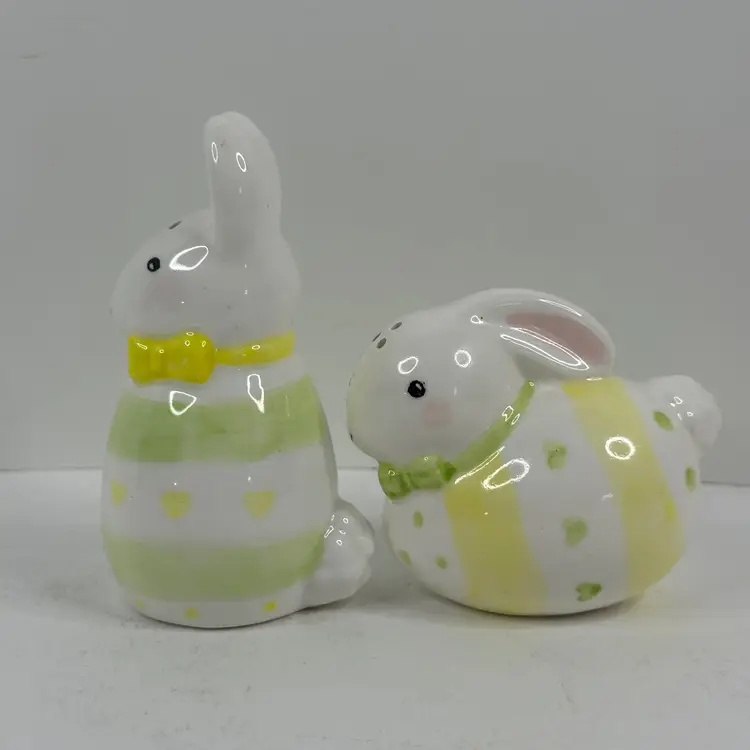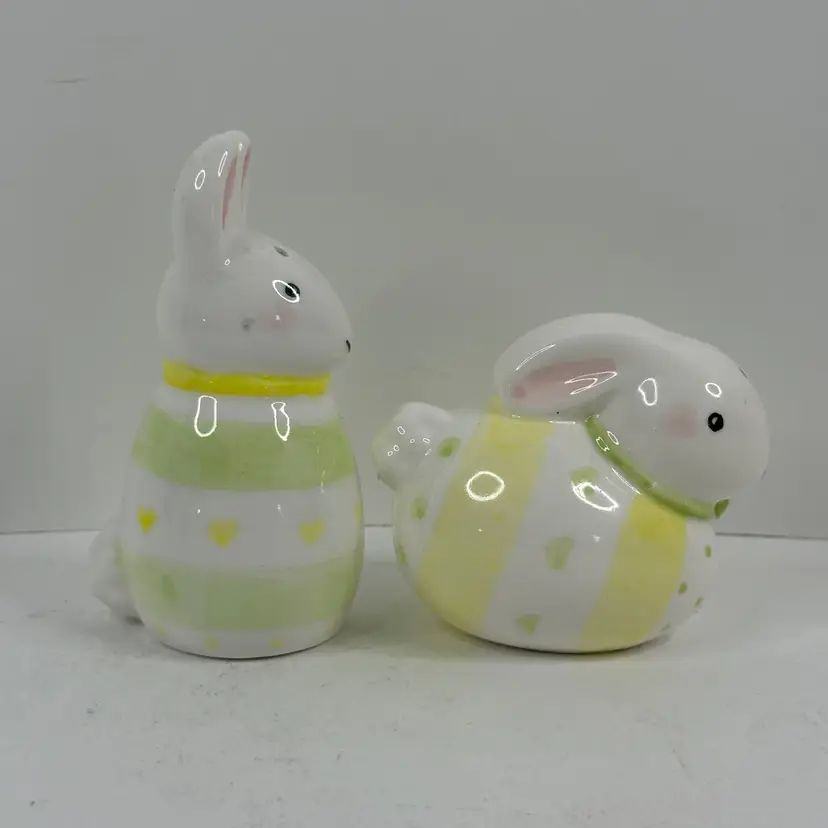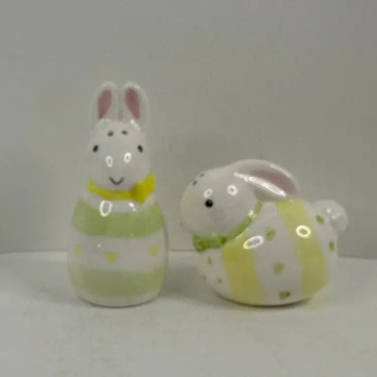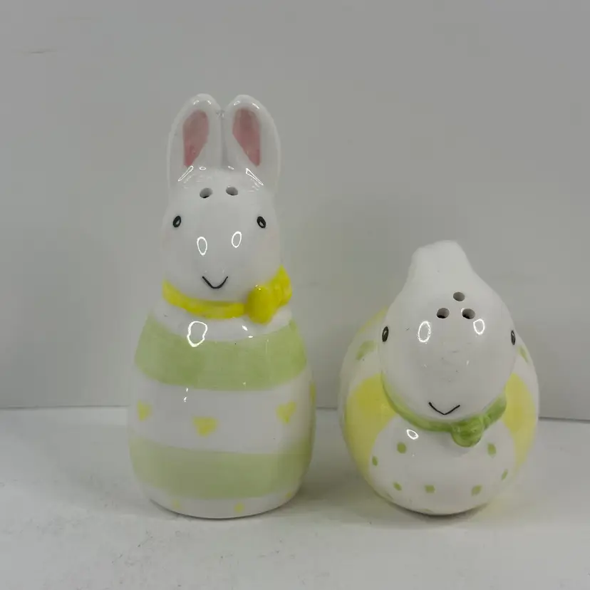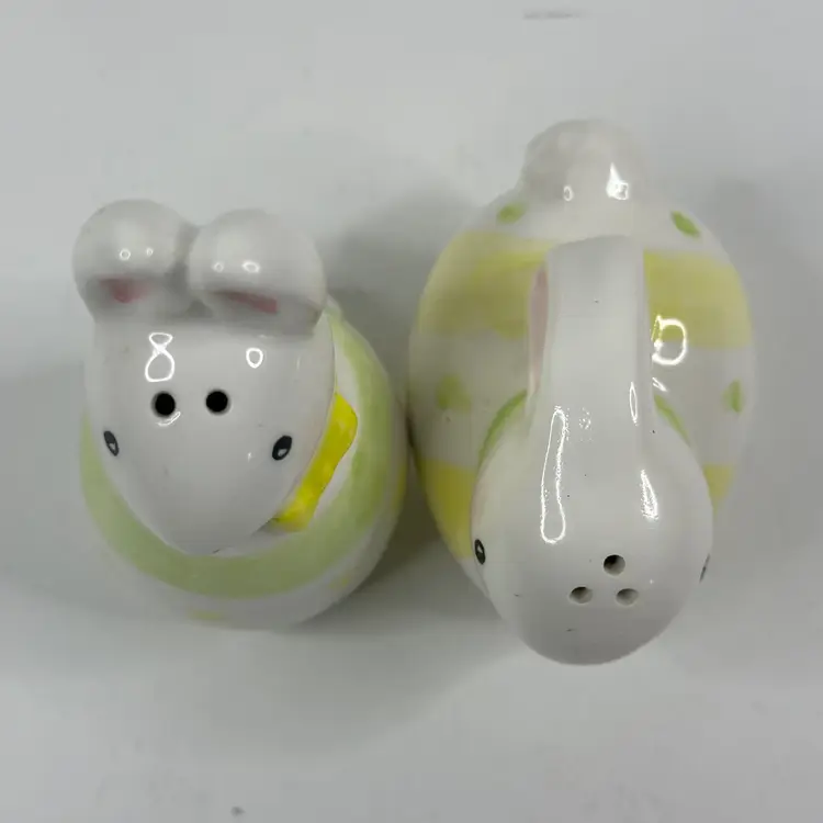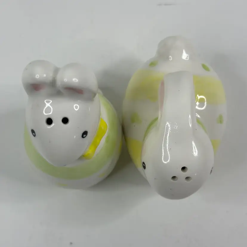 Set of Vintage Bunny Rabbit in Easter Egg Salt and Pepper Shakers in good preowned condition. Pepper shaker is approximately 4 inches tall. Salt shaker is approximately 2.75 inches tall. No chips or cracks. Please see all photos for best description of item and condition.