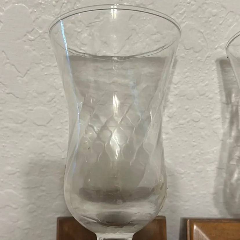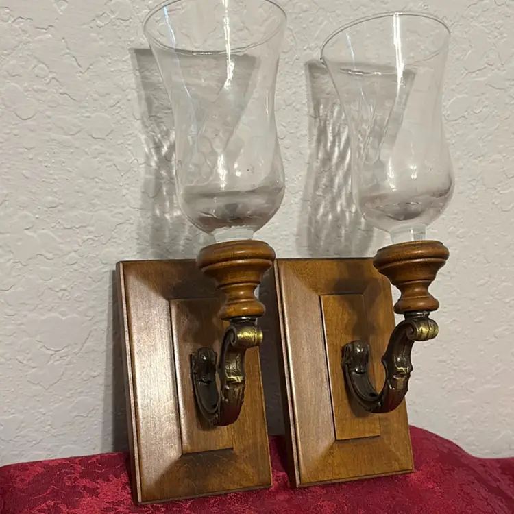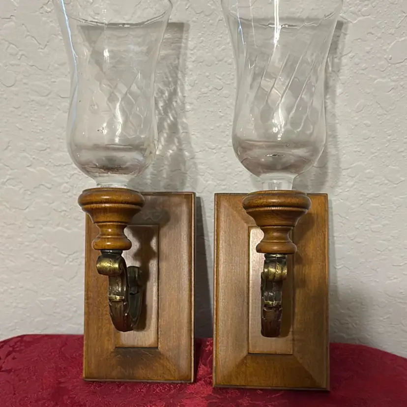 Vintage Homco wooden and brass wall sconce candle holders with glass hurricane shades. They are designed to be mounted on a wall. The sconces are made of wood and brass-colored metal. They are designed to hold votive candles in the glass holders but can also be used for tapered candles without the glass inserts. Sold as set.