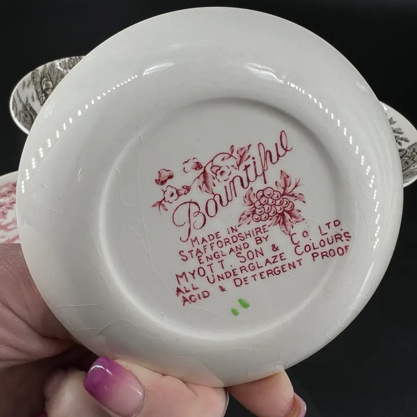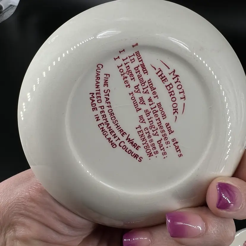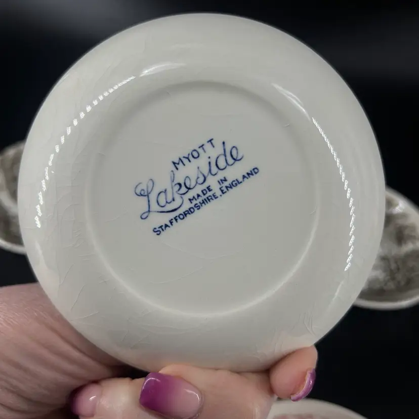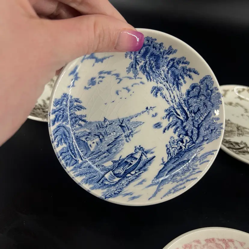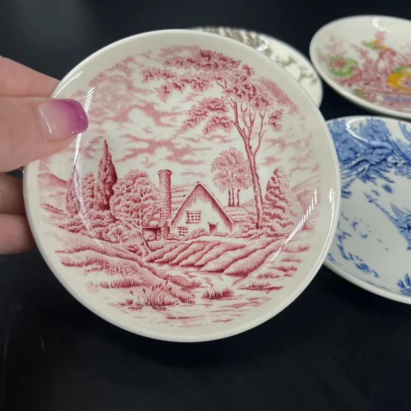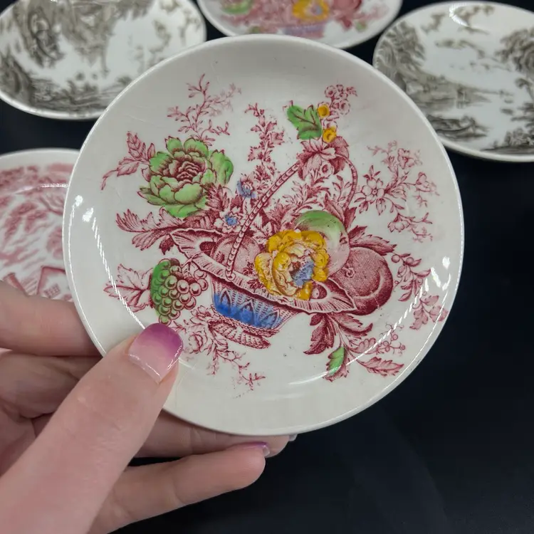 These six dishes feature various patterns. They are all a attributed to Myott of England. They measure approx 4” wide. There are no chips or cracks, but there is crazing.
