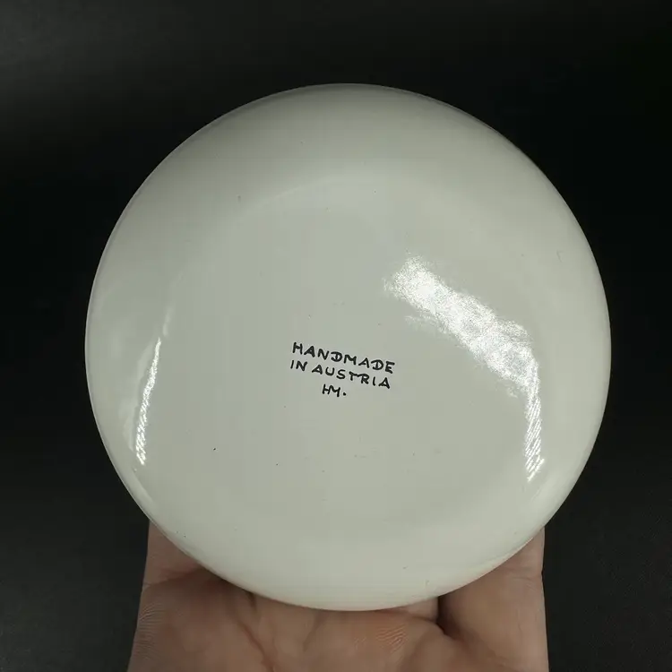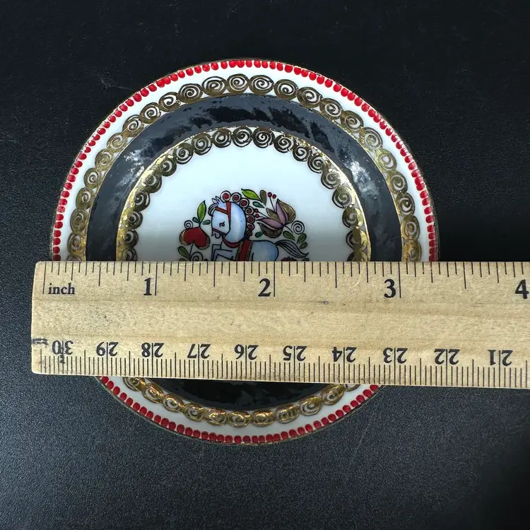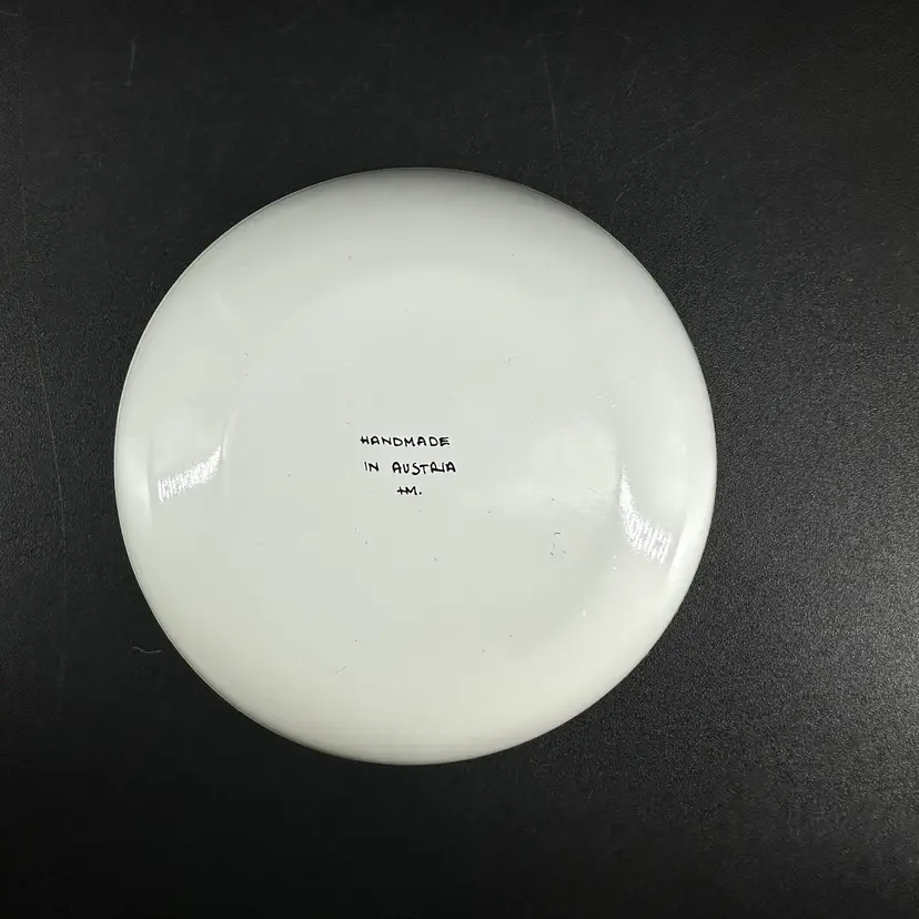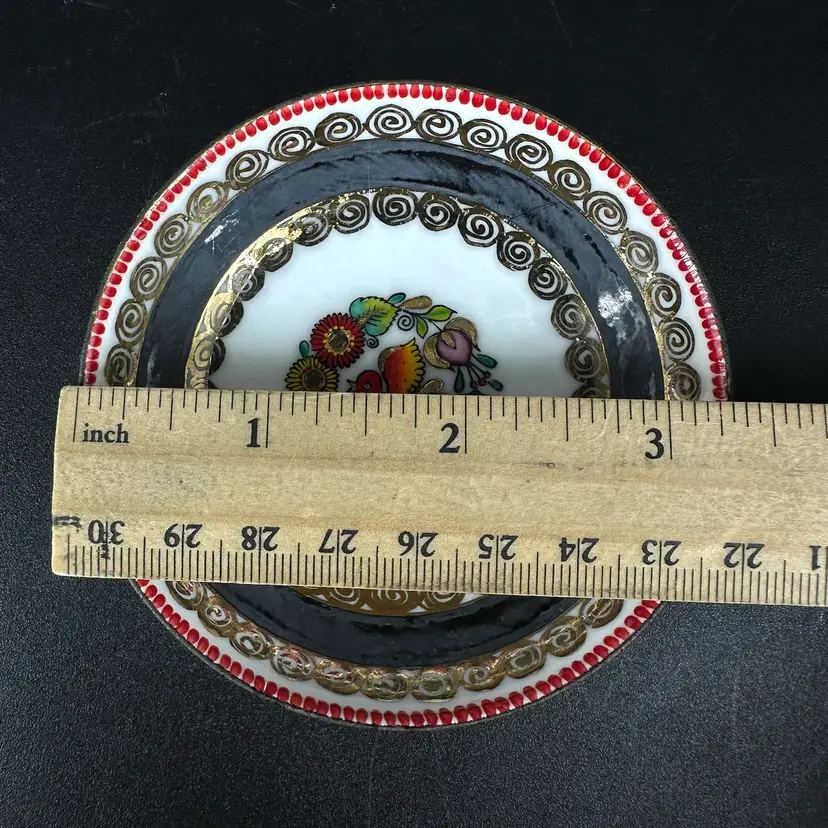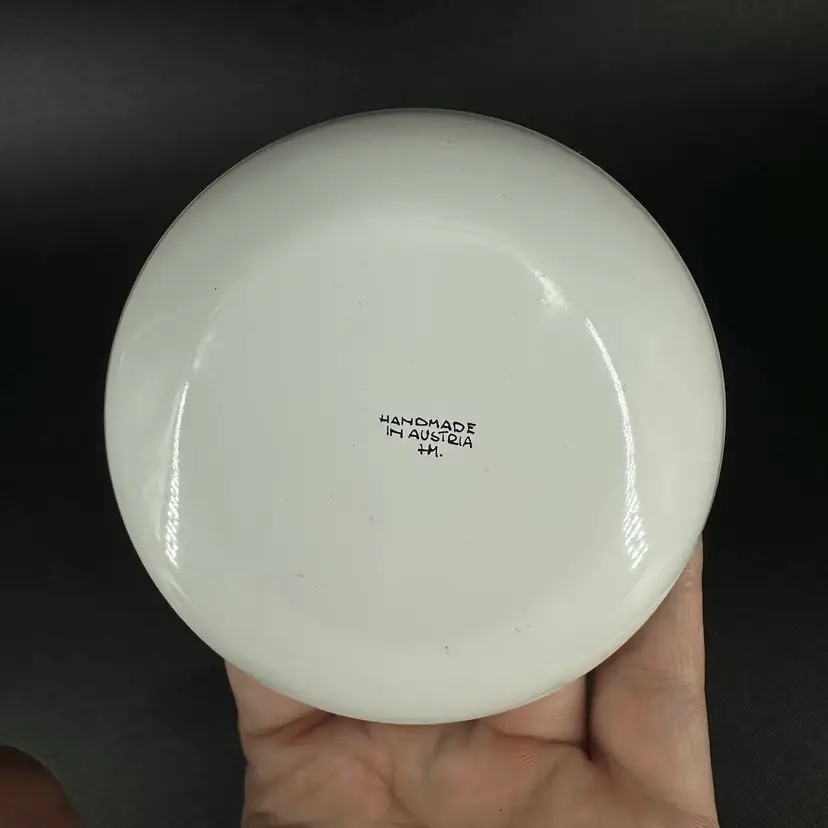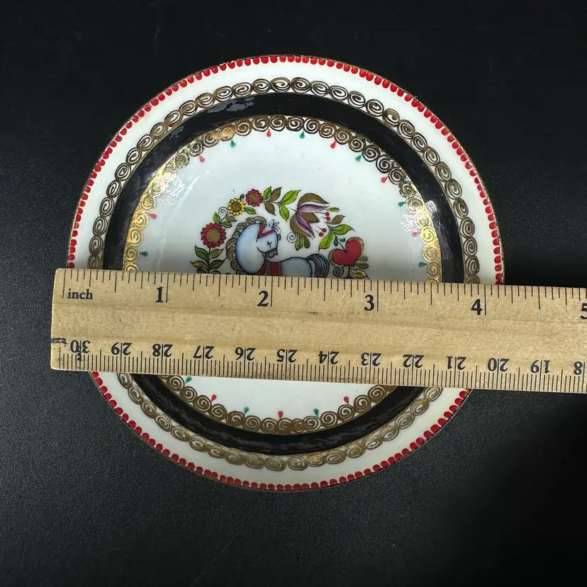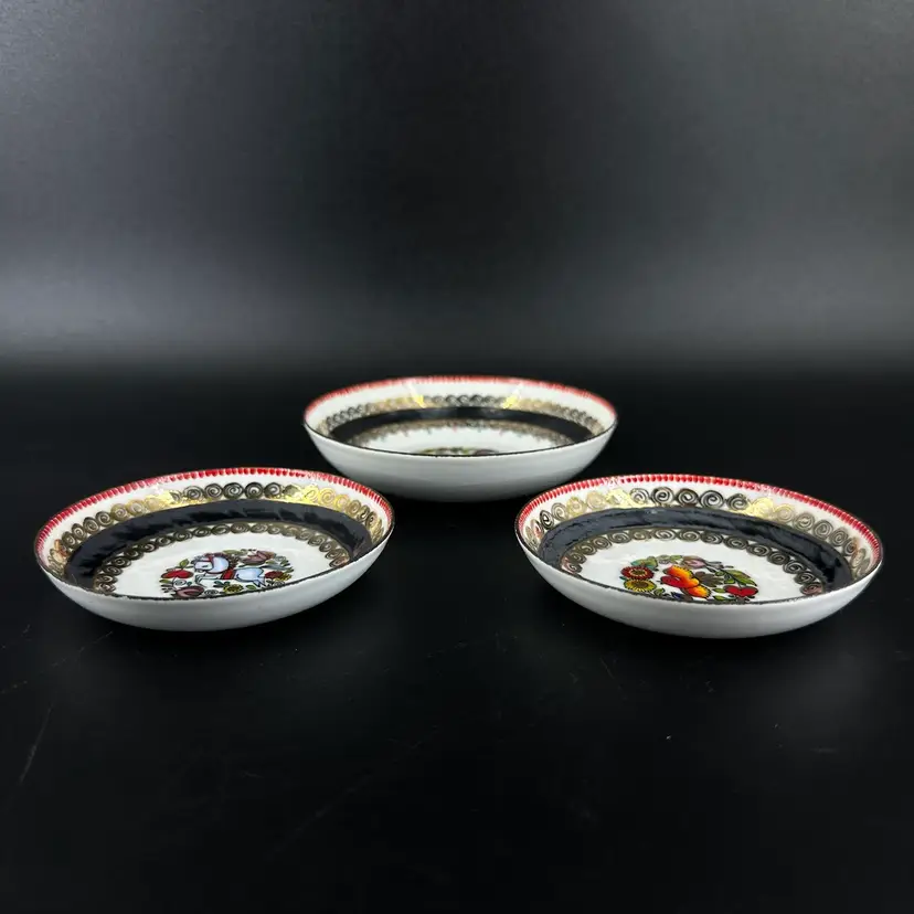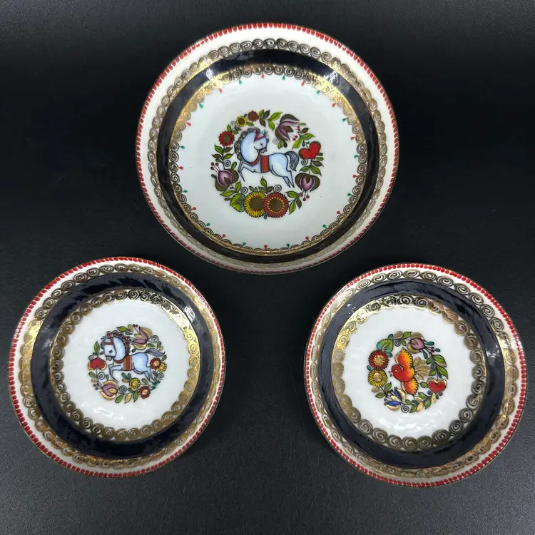 Three dishes (one bigger, two smaller of same size) featuring each a different folk art design with gold luster detailing. “HAND MADE IN AUSTRIA” on bottom of each. No chips or cracks. Measures 4.25” wide and two of them measure 3.5” wide.