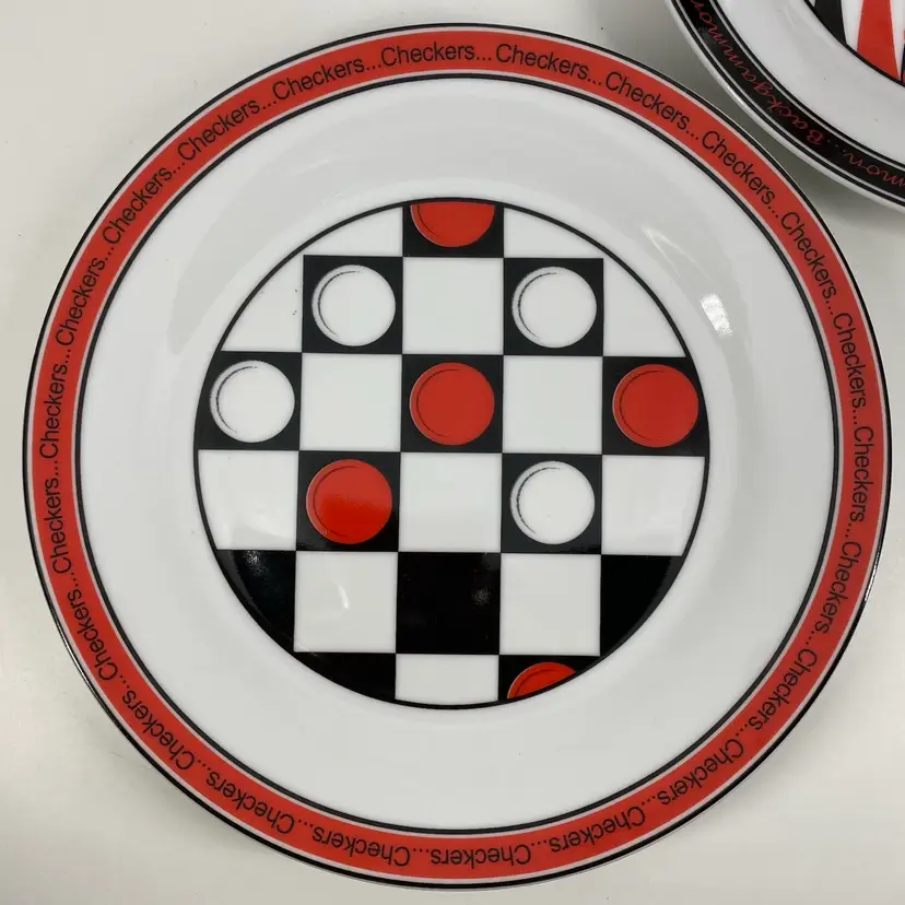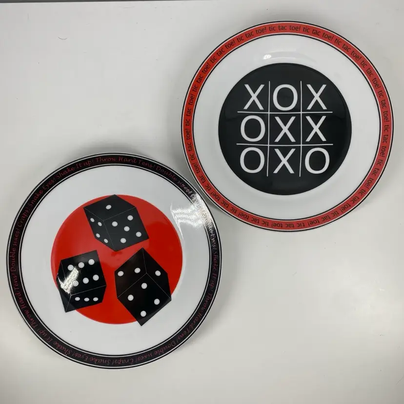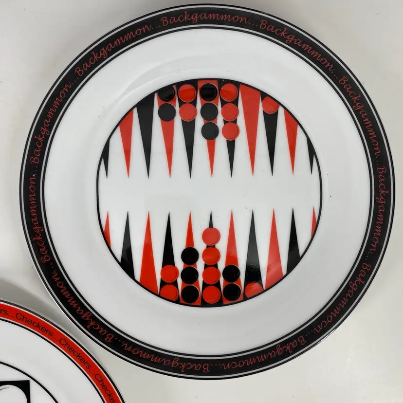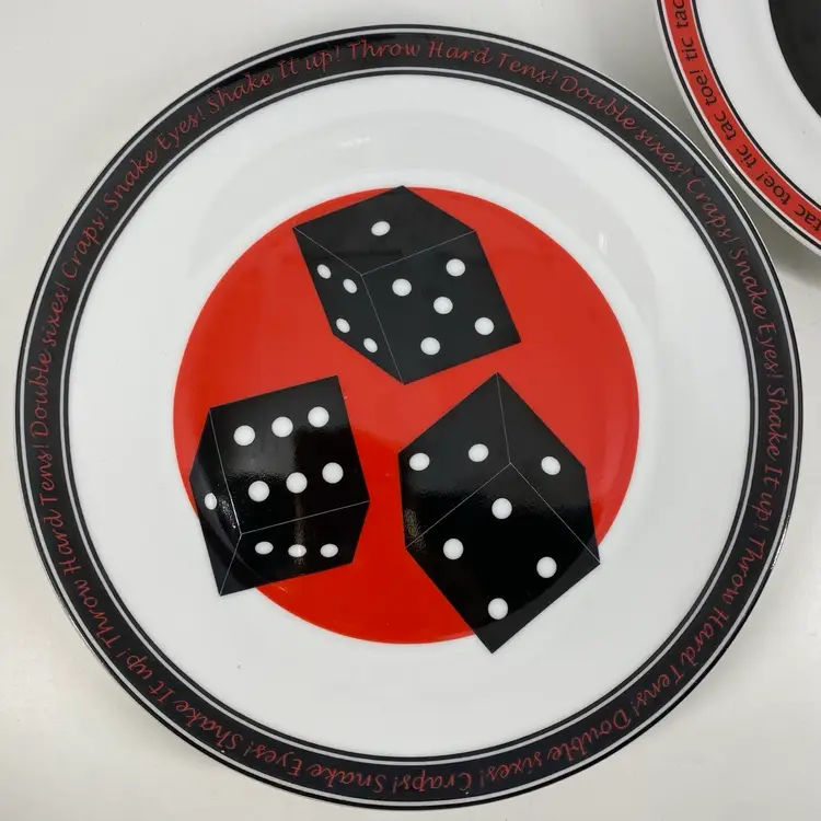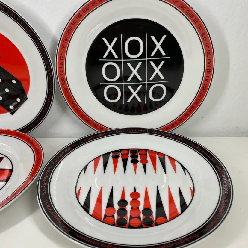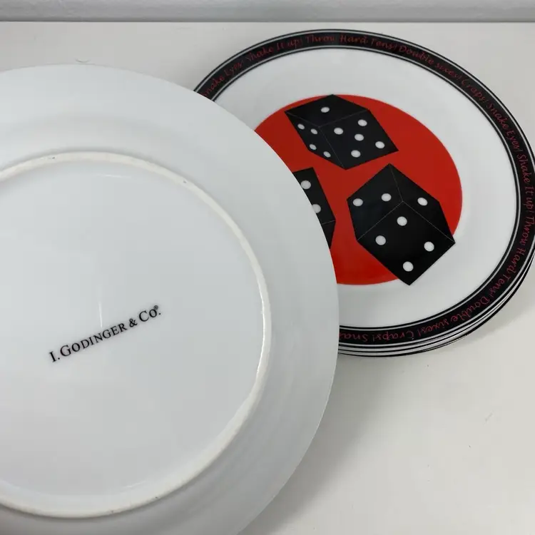 Hi... Add some fun to your dining table or vintage Bar with this set/4 porcelain dessert plates each featuring a classic gaming pattern. The 7.5-inch round plates are perfect for all occasions and are dishwasher safe. The set is an original 1996 release from I.Godinger & Co. and come in a contemporary style with a shiny Red, Black, and White finish. These plates are perfect for anyone who loves entertaining with pizzazz.