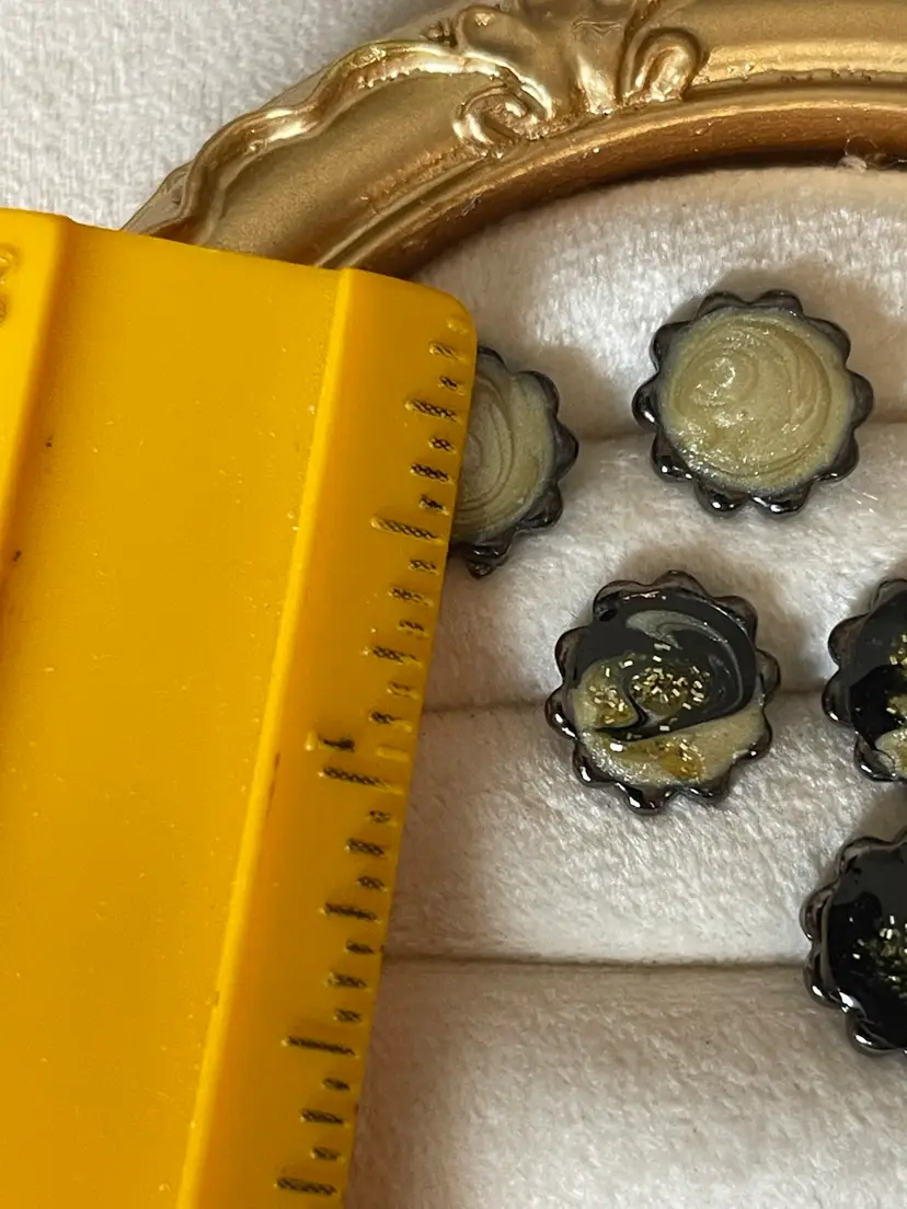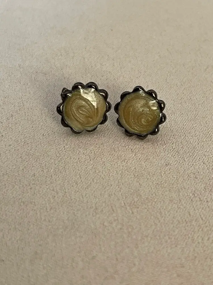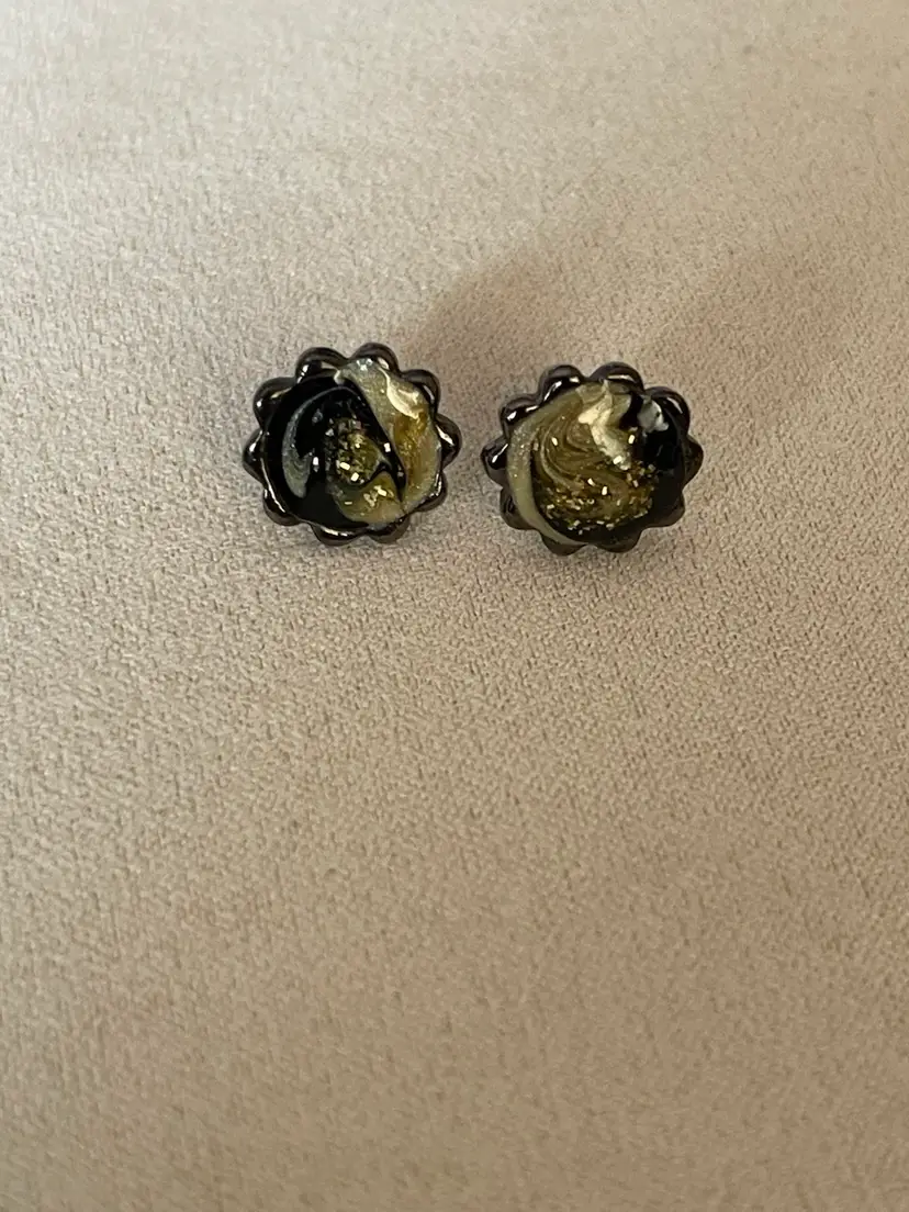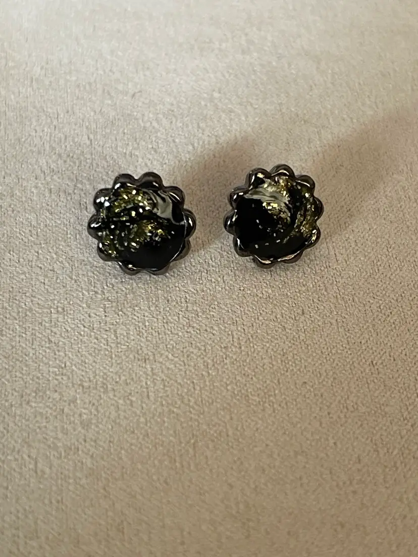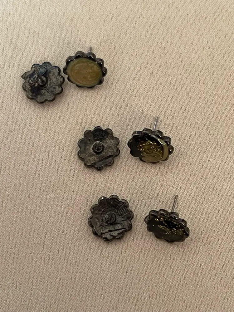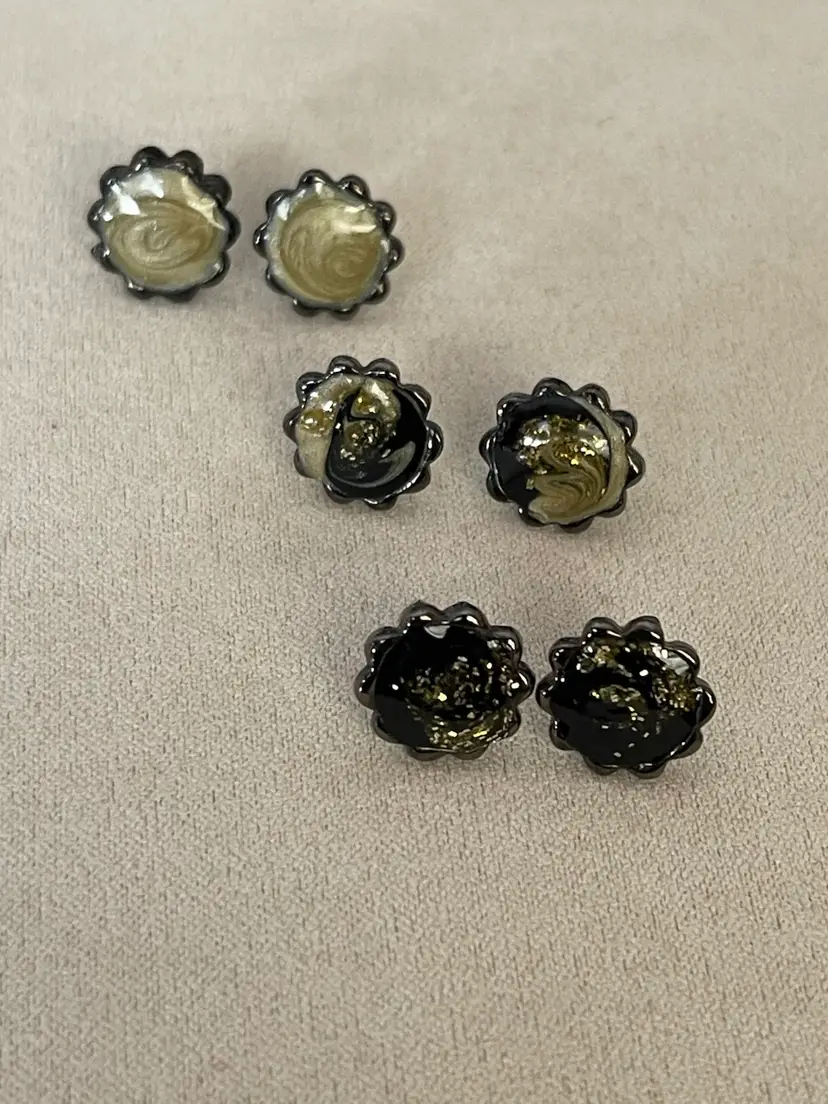 Unique 90’s vintage stud earring trio featuring scalloped black resin with gold swirl accents. Each pair has its own character—perfect for mixing up your everyday style. Approximately 1/2” May need a light cleaning due to age.