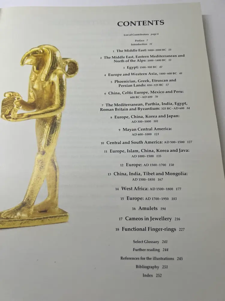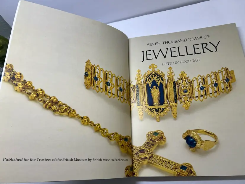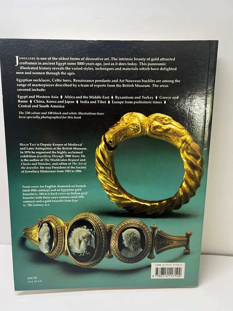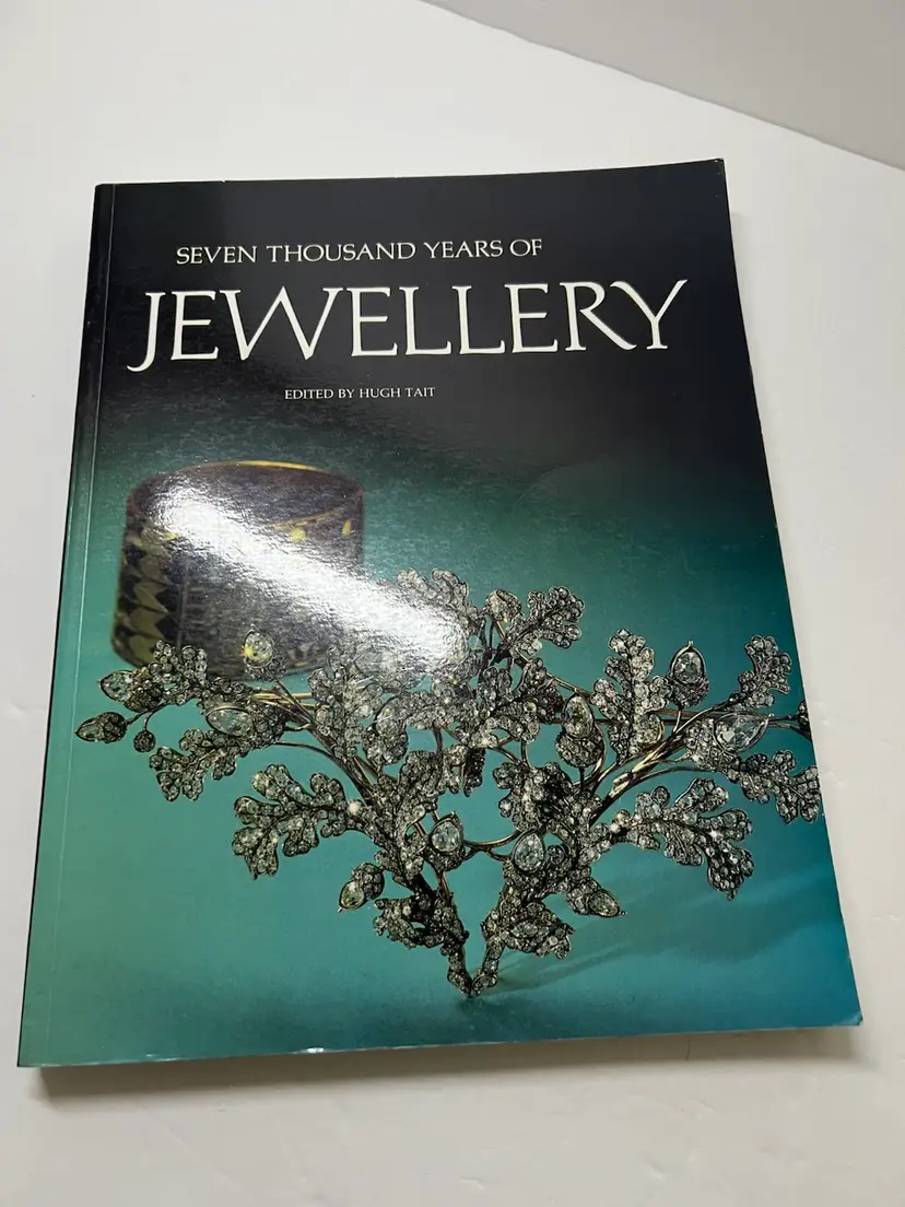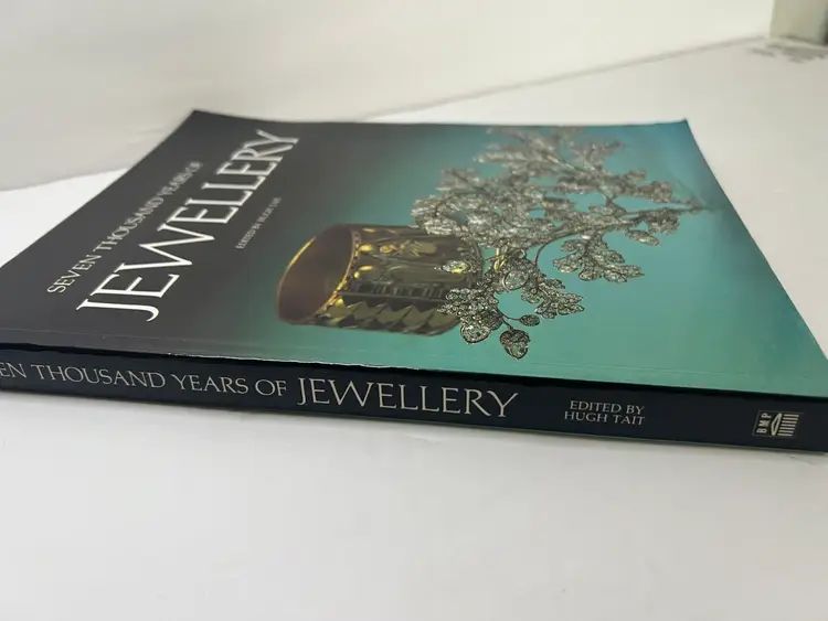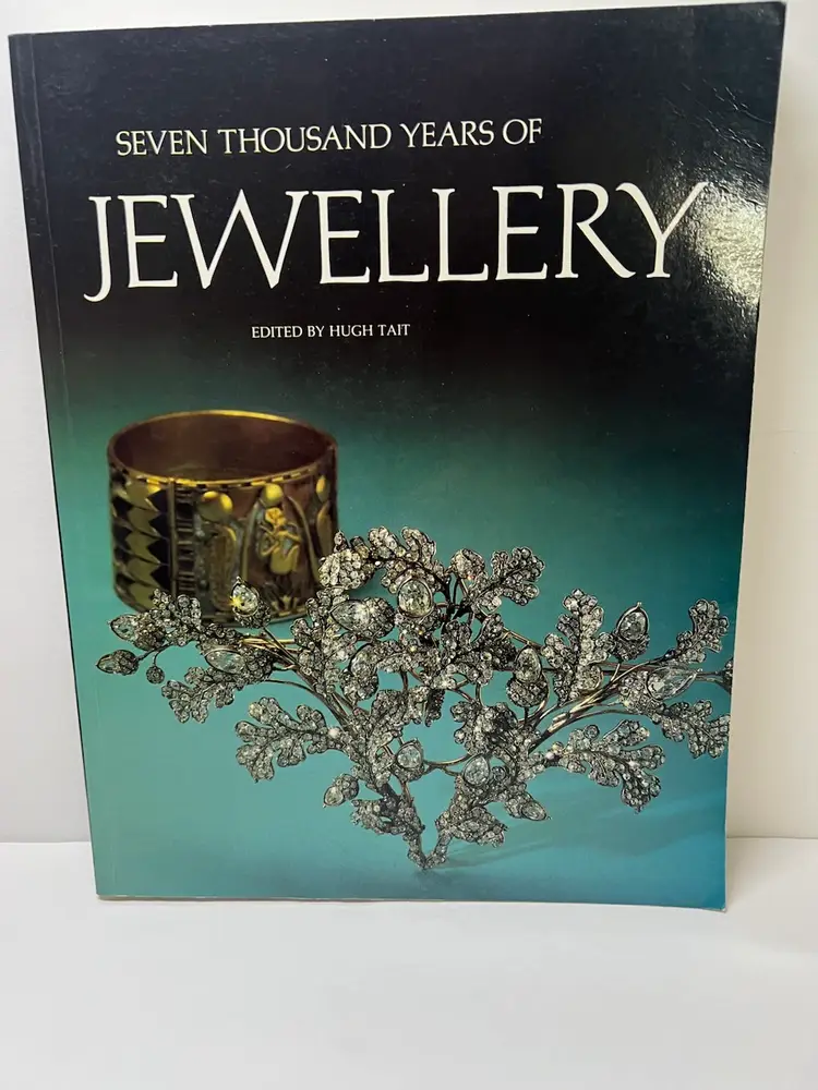 Here is the paperback book of Seven Thousand Years of Jewellery By author Hugh Tait with 254 pages with colorful photos. Book size: 9 inches by 11 inches Condition very good condition - this book has been lightly used but still makes a great book for discussion and history of jewelry. Many photos by era