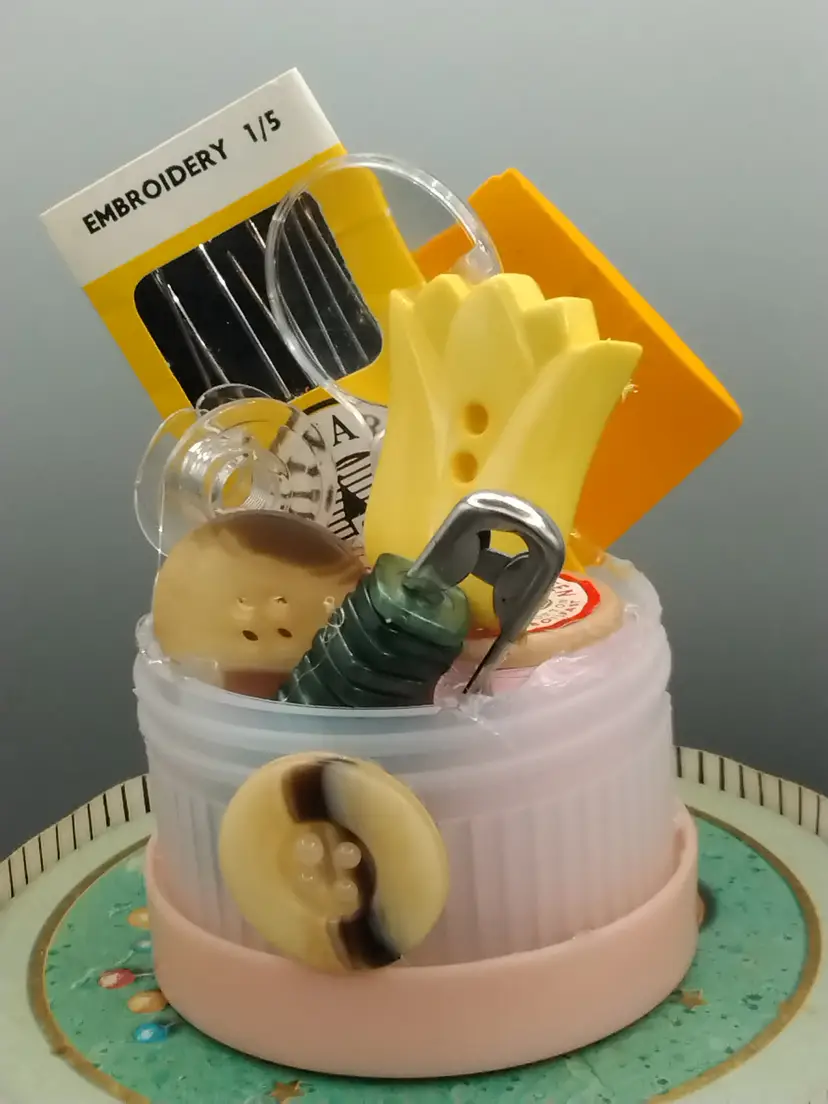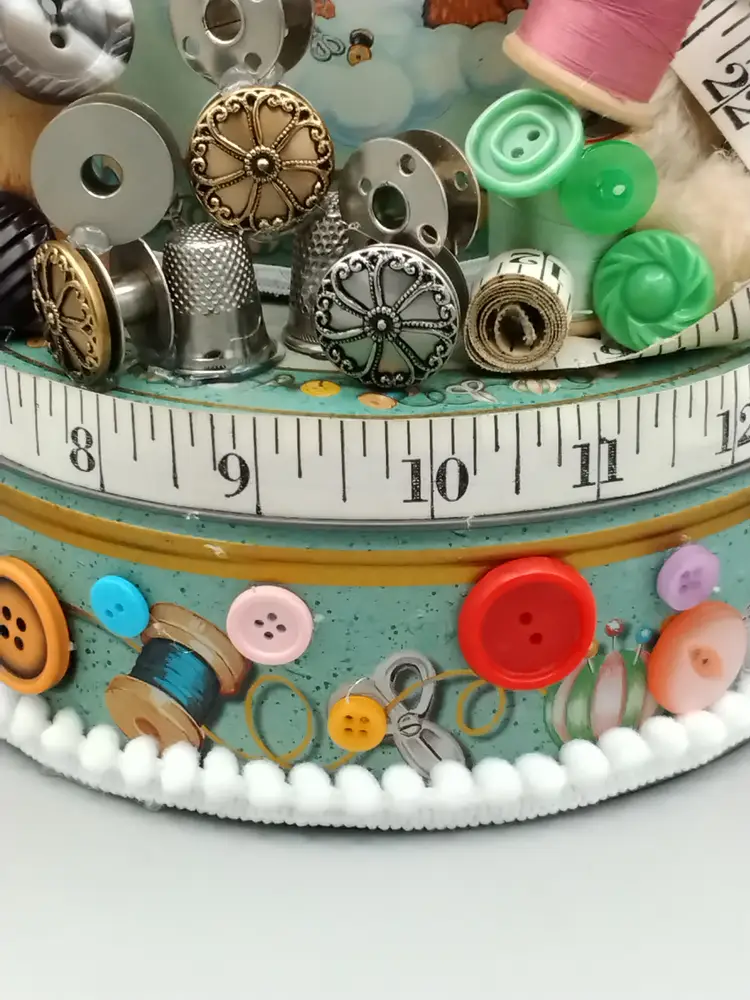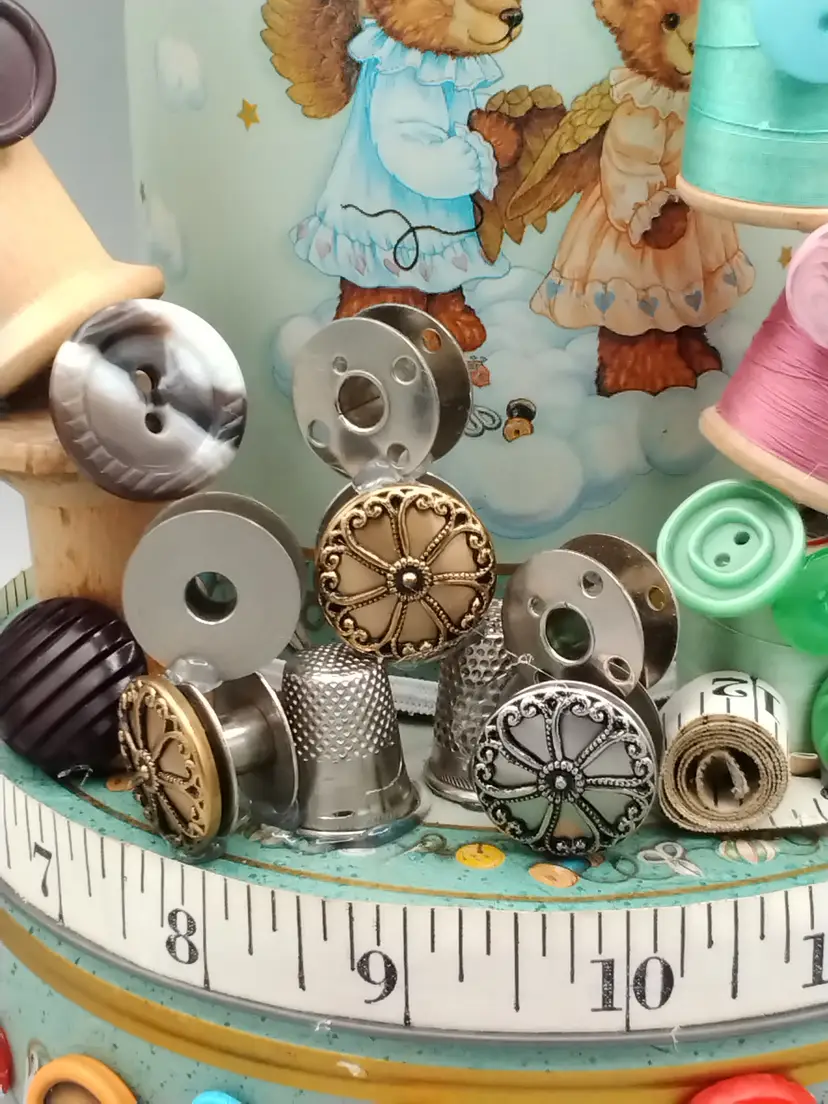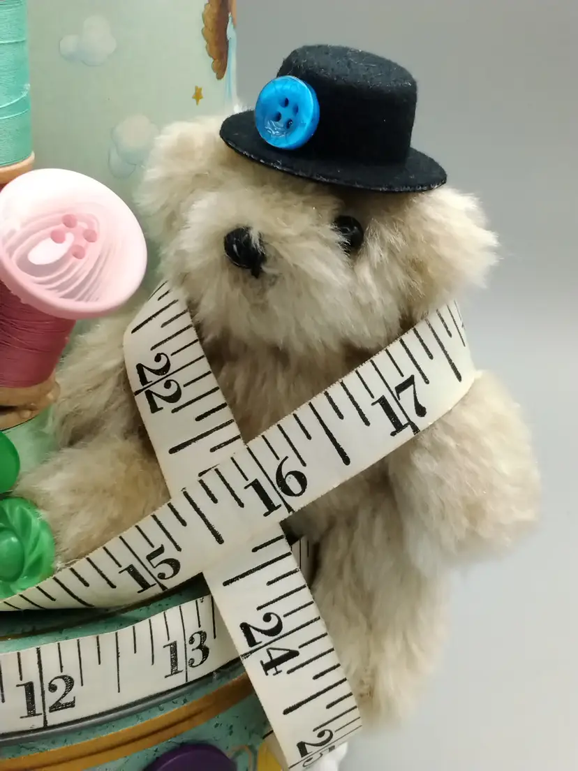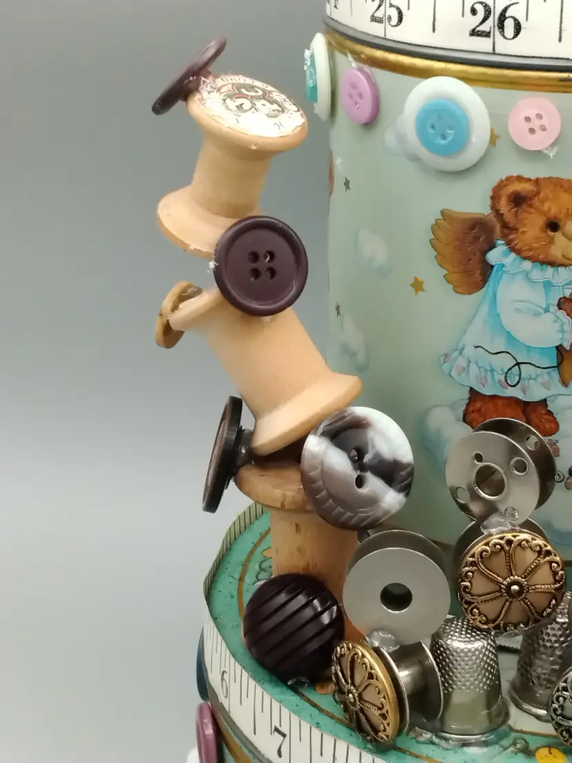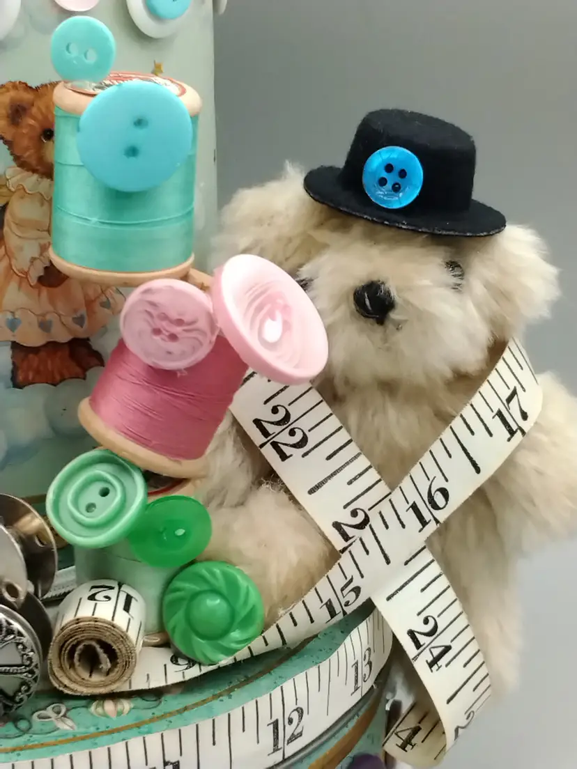 Sewing Essamblage, Sewing Room whimsy decor. A set of co-ordinating teddybear Sewing themed lidded tins, with a small stuffed Teddy wrapped in a fabric measuring tape. Topsy-turvy wooden spools, buttons, bobbins, Thimbles, and more, measuring 11 inches tall.