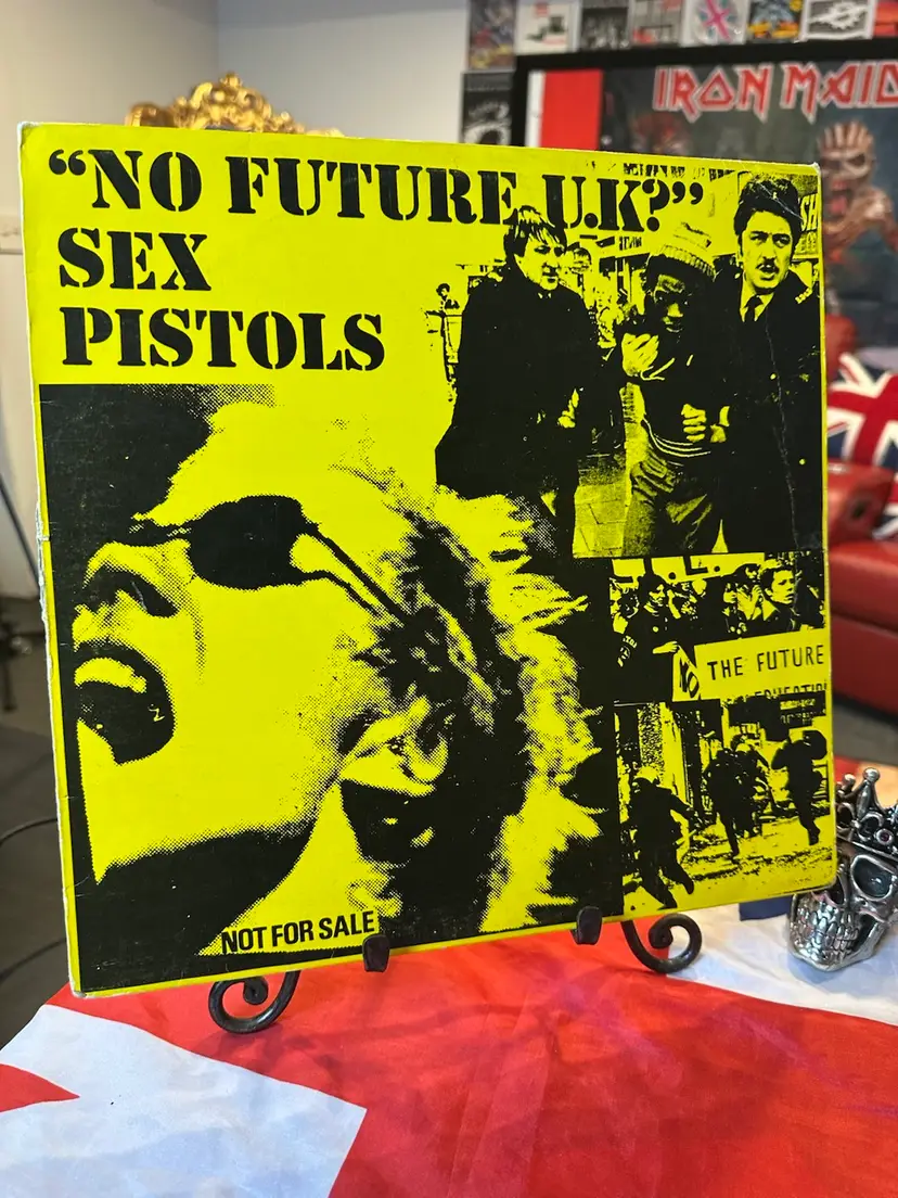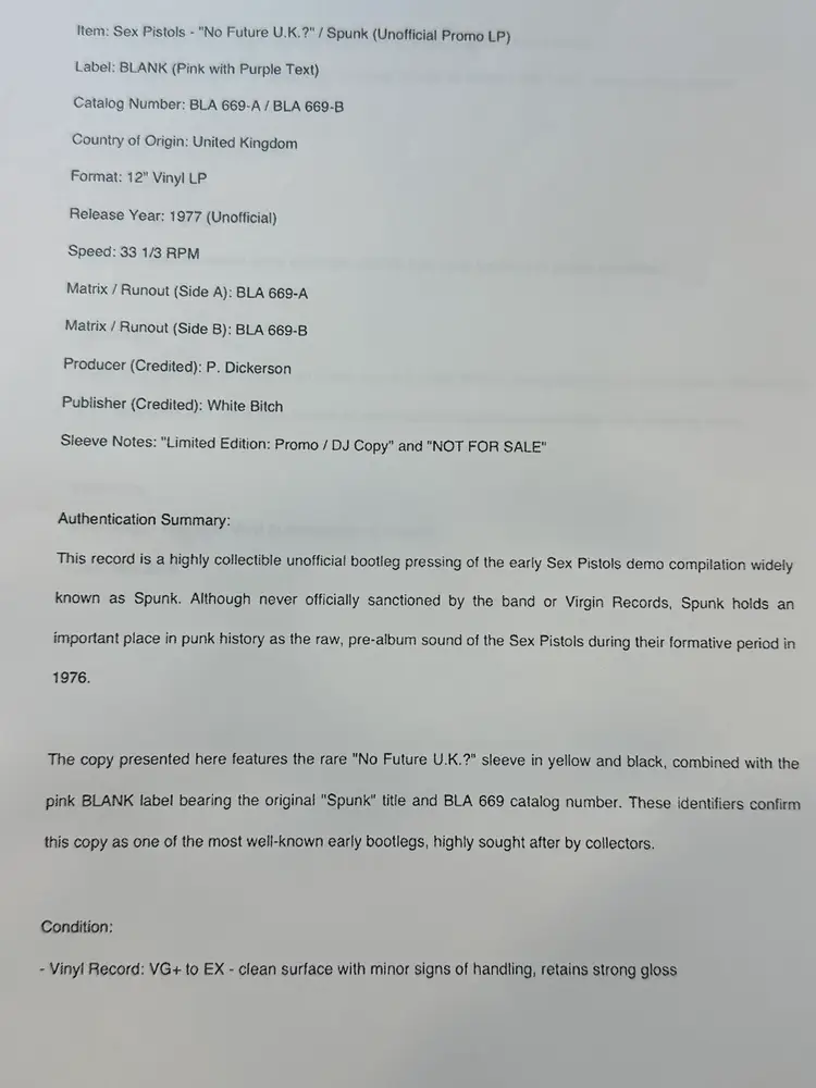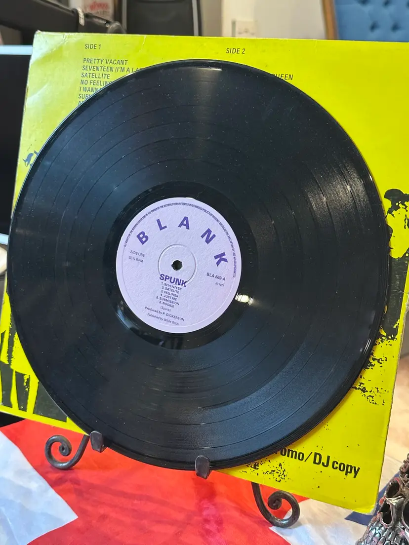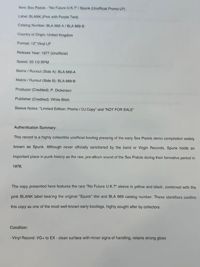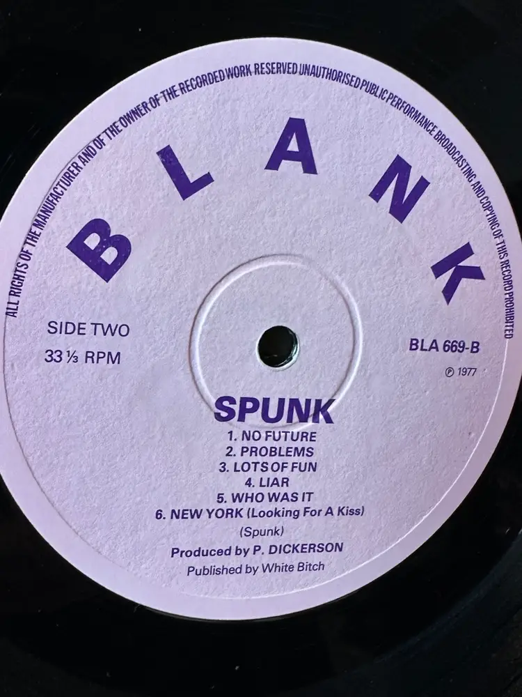 Bold yellow/black cover collage with “NO FUTURE U.K.?” headline. “NOT FOR SALE” and “Limited Edition Promo / DJ copy” suggests it’s an unofficial or promotional bootleg. • Tracklist: Matches the well-known Spunk bootleg demos, featuring early recordings produced by Dave Goodman. Tracklist includes: • Side A: “Seventeen,” “Satellite,” “Feelings,” “Just Me” (alt title for “I Wanna Be Me”), “Submission,” “Nookie” • Side B: “No Future” (alt title for “God Save the Queen”), “Problems,” “Lots of Fun,” “Liar,” “Who Was It,” “New York” • Label: Lavender “BLANK” label – typical of Spunk bootlegs issued in 1977 (and represses in the 1980s/90s). Label credits producer “P. Dickerson” (a pseudonym), with “Published by White Bitch” — a further sign of an unofficial release. Matrix/runout: BLA 669-A/B, aligning with known Spunk variants.