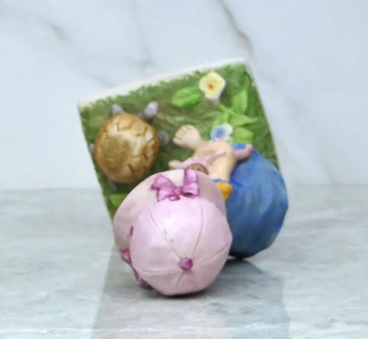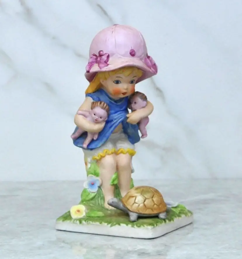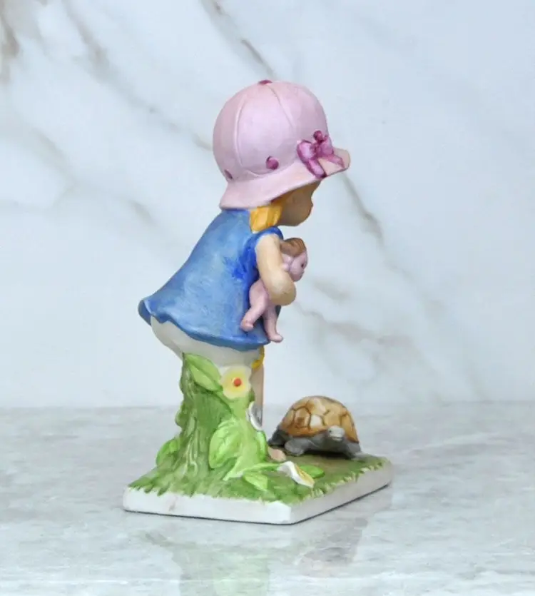Beautiful Bisque Porcelain Figurine from 1973 depicting a young girl in the woods holding her two dollies as a curious turtle approaches!