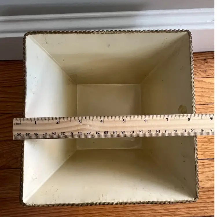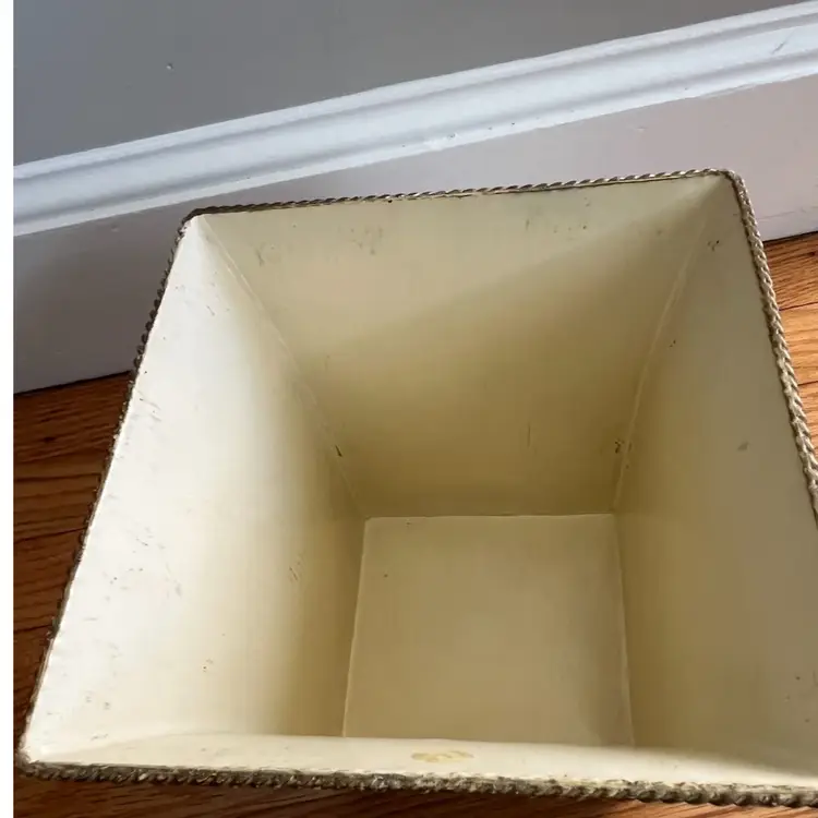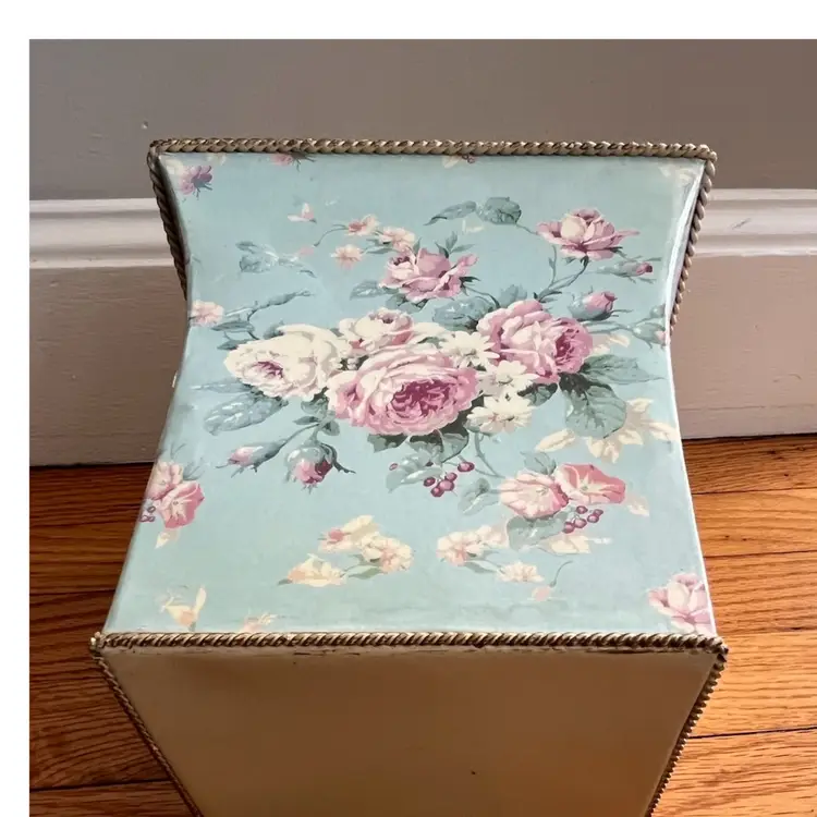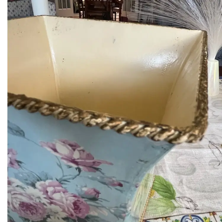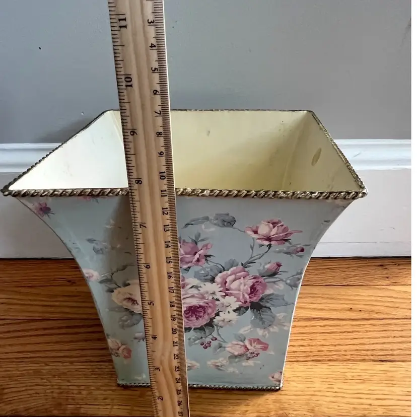 Beautiful vintage metal Toleware Bucket cabbage rose floral pattern and Brass Roped Edge. This is a lovely shabby chic decor for plants on a patio or deck not recommended to full exposure to the outdoor elements as the bucket is wrapped in thick floral paper. Indoors usage can be for yarn and knitting supplies , or towels or paper products in a bathroom. Pre-owned in great vintage condition shows some surface wear on the rope-metal trim allowing for that rustic Shabby Chic look. No rust or dents Measures 8.5 inches in height about 8 inches at the widest point.